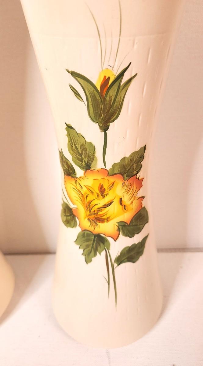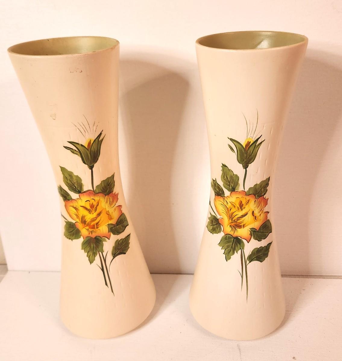 Nice Pair of large MidCentury Ellgreave (England) pottery vases - yellow rose motif - 15" tall - 1960's. Good condition.