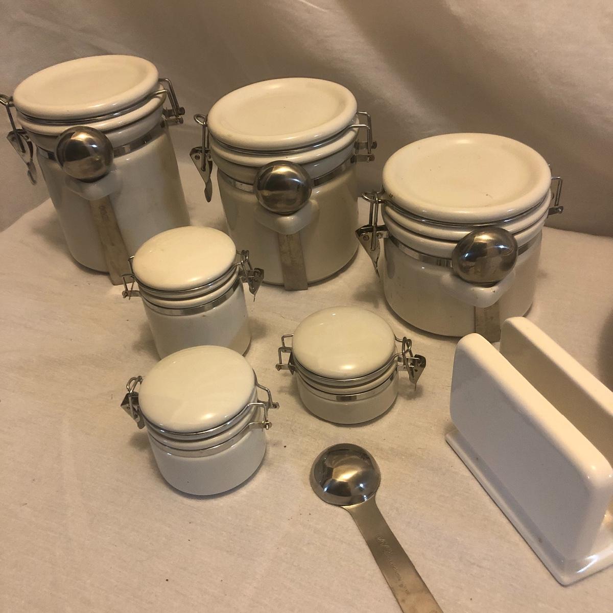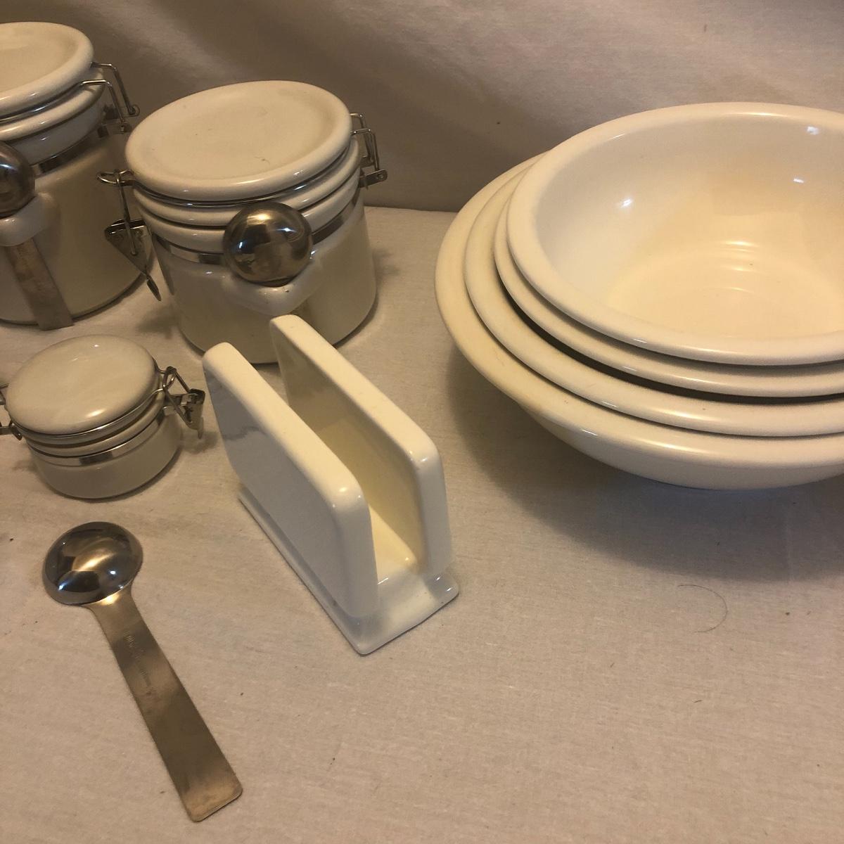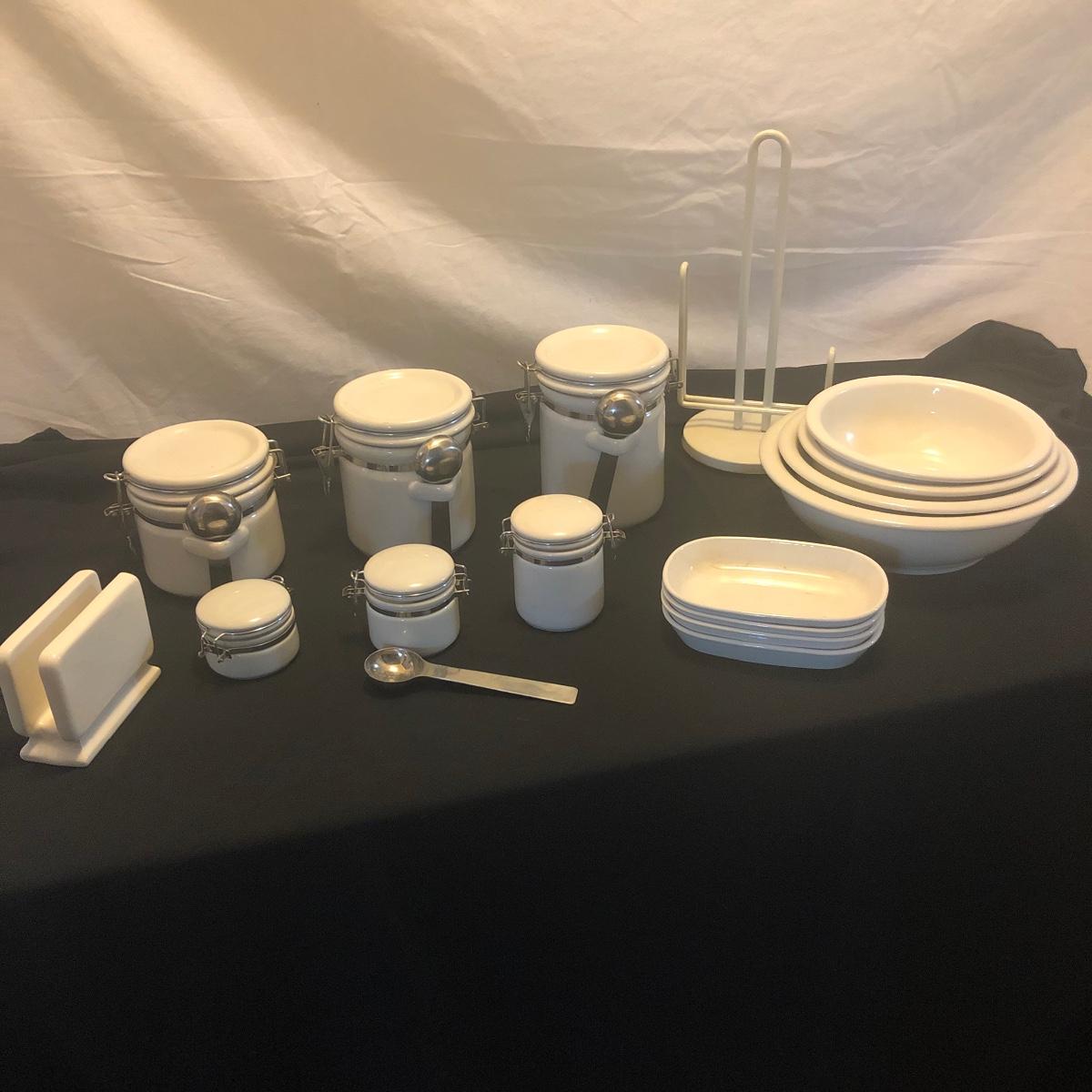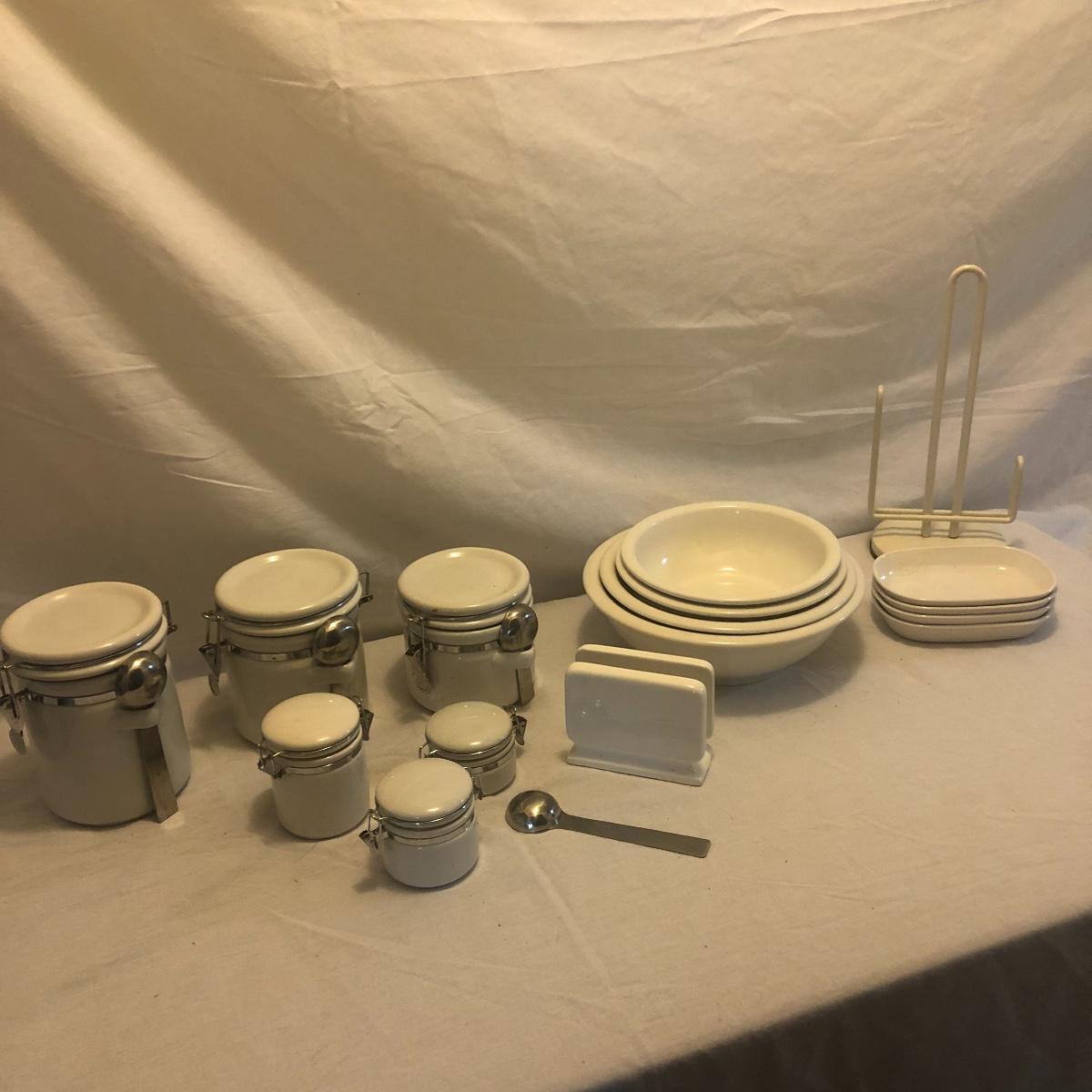This lot includes six canisters-three of which have spoons on the side of them, a paper towel holder, four side dishes, one napkin holder and four mixing bowls. Shipping Available.