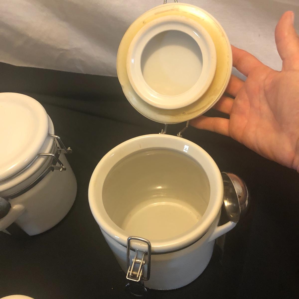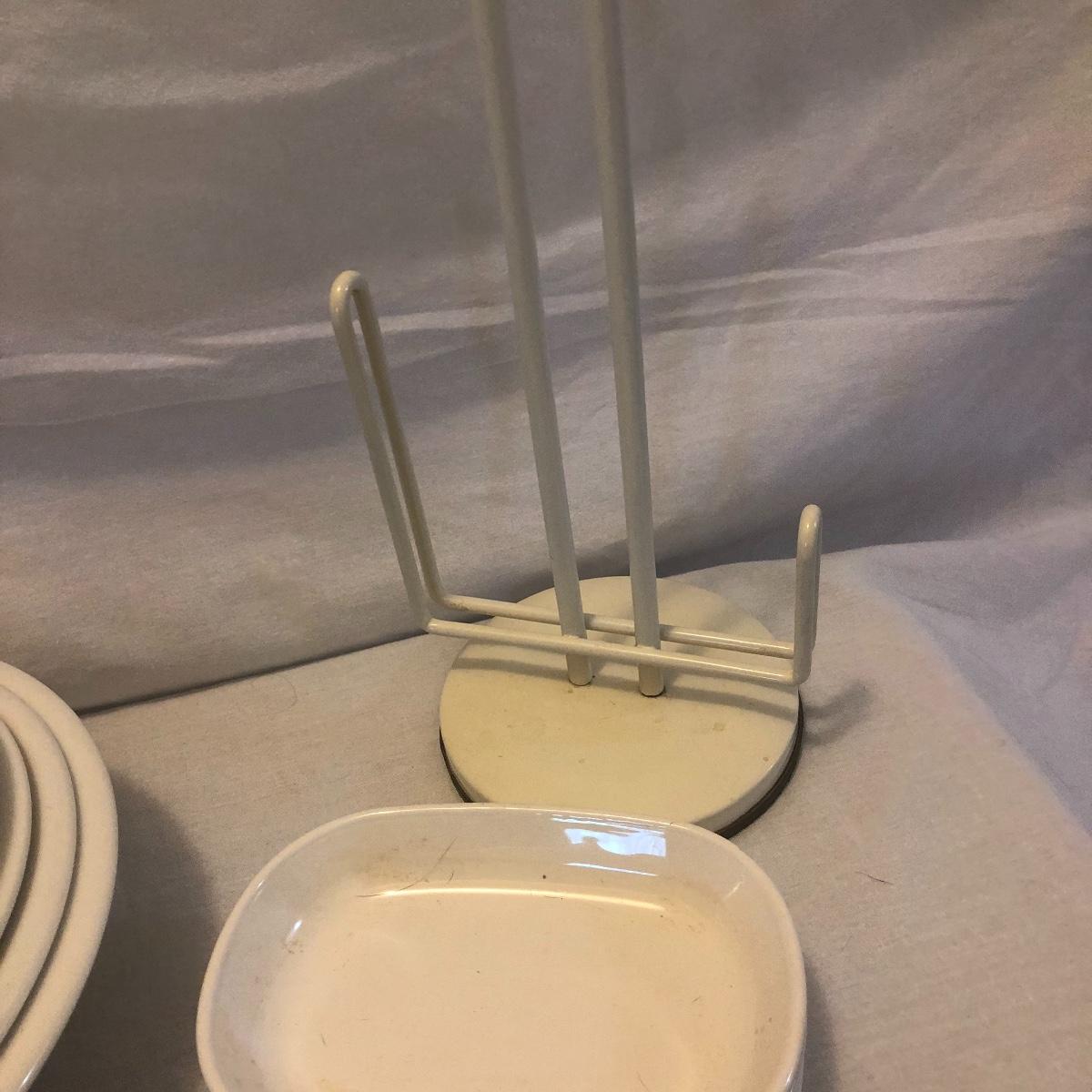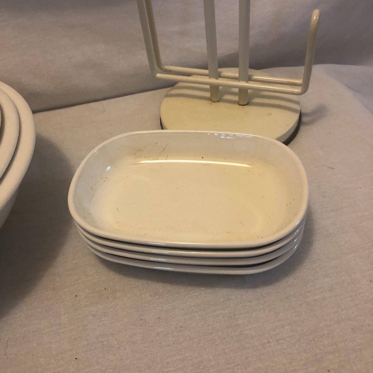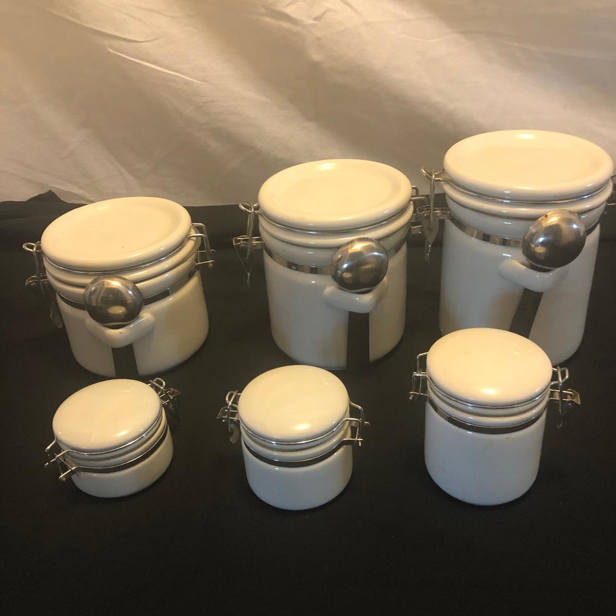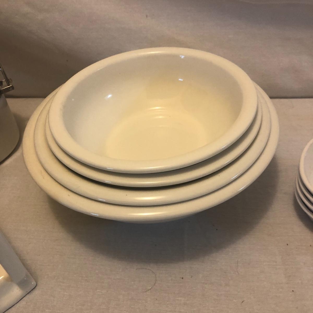 This lot includes six canisters-three of which have spoons on the side of them, a paper towel holder, four side dishes, one napkin holder and four mixing bowls. Shipping Available.