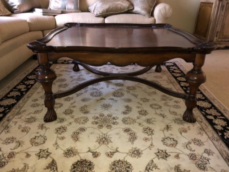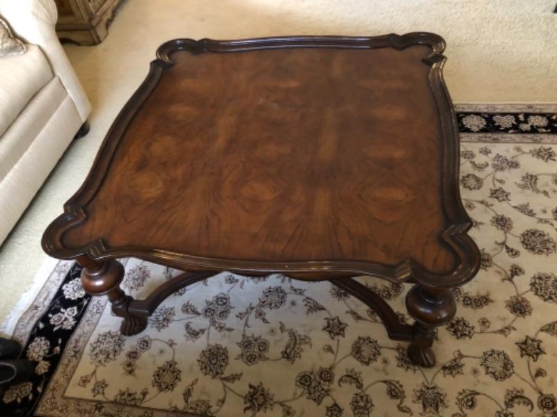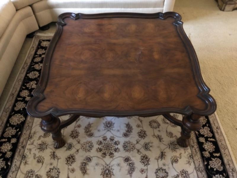 Lot 48. Wooden coffee table 42” square 20” high in walnut--WAS $65““NOW $48.75