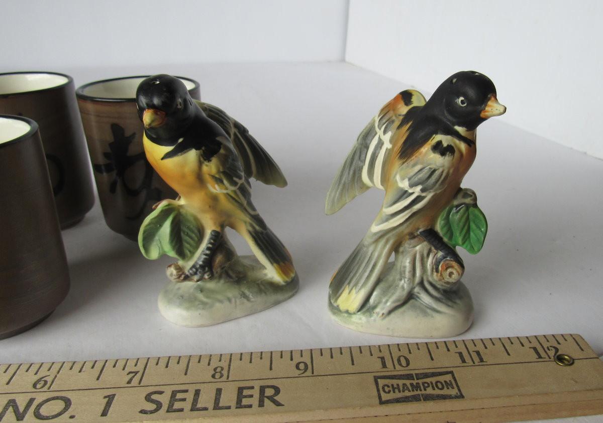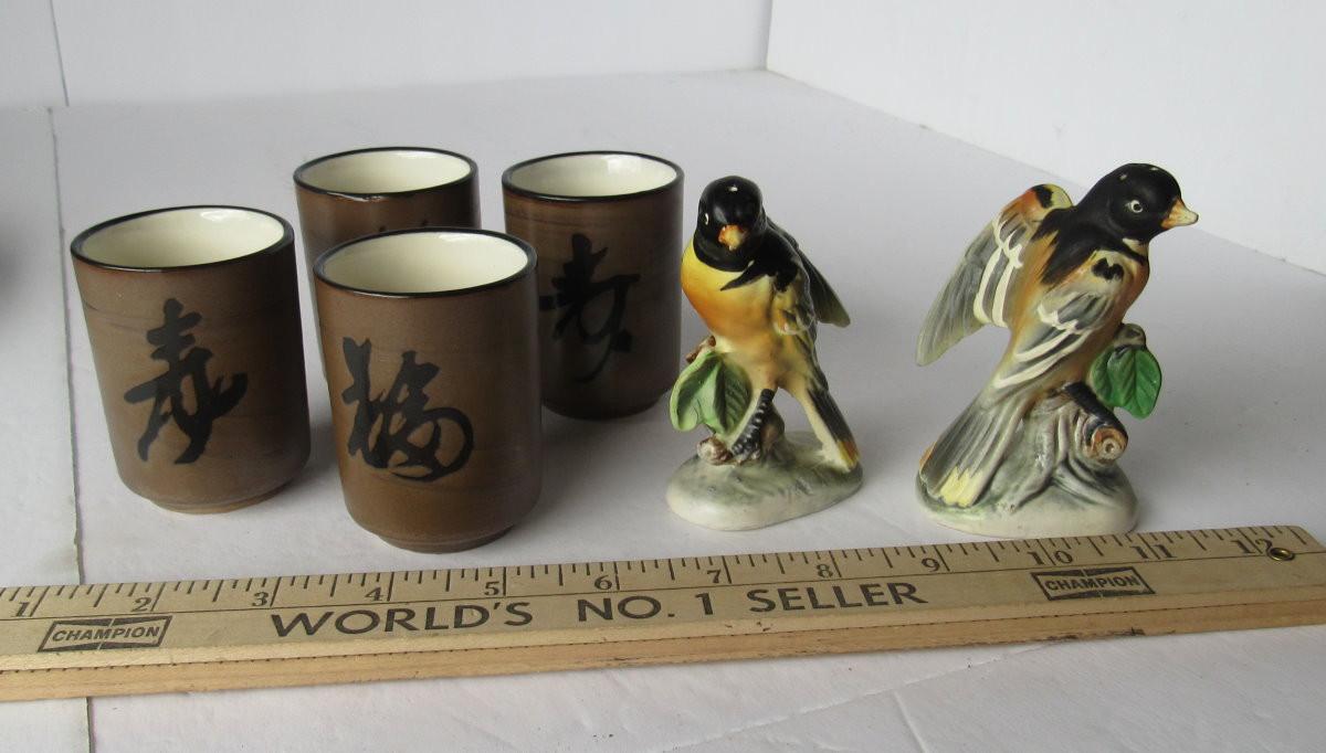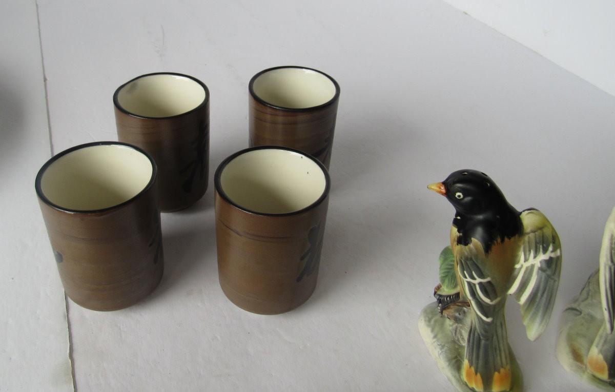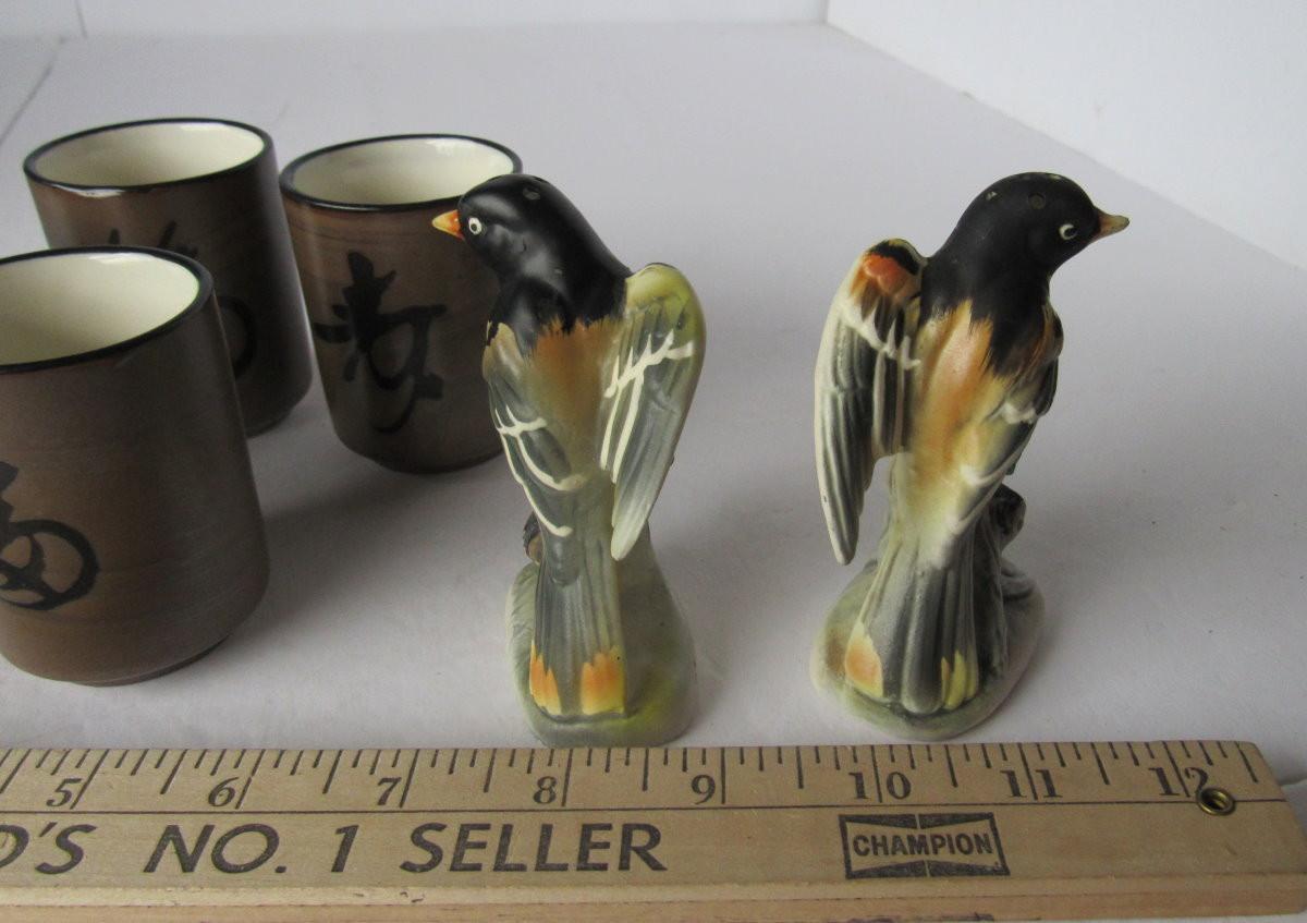 Lot 480: Set of 4 Sake Cups and Birds Salt/Pepper