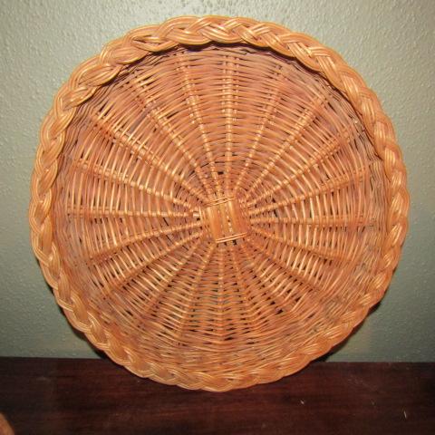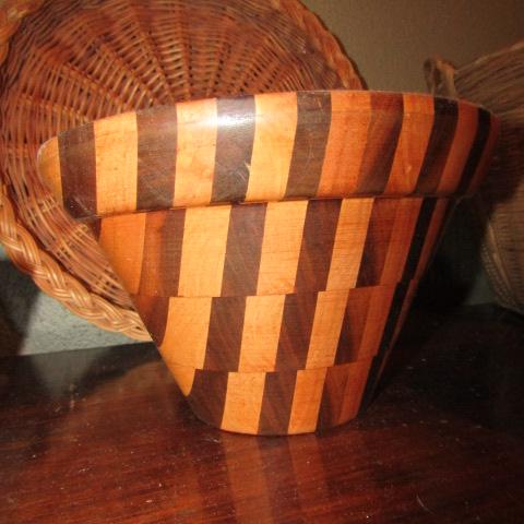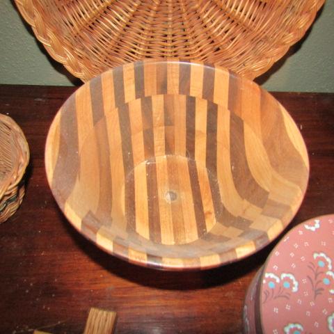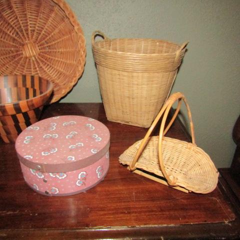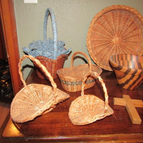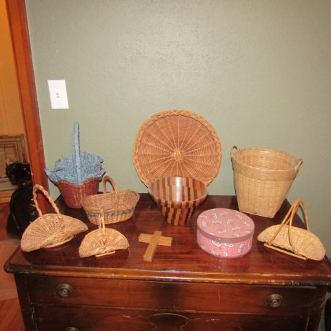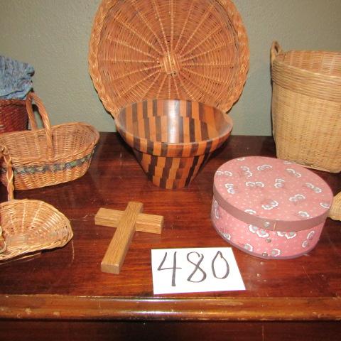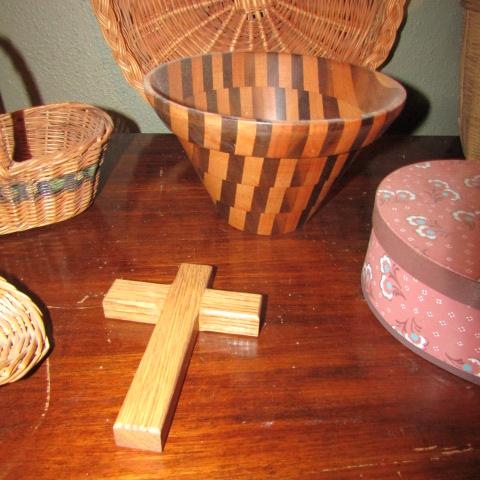 WOODEN FLOWER POT, WICKER BASKETS, ROUND BOX AND WOOD CROSS WALL HANGING