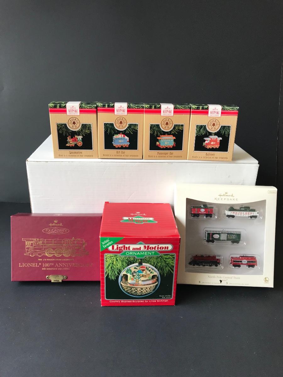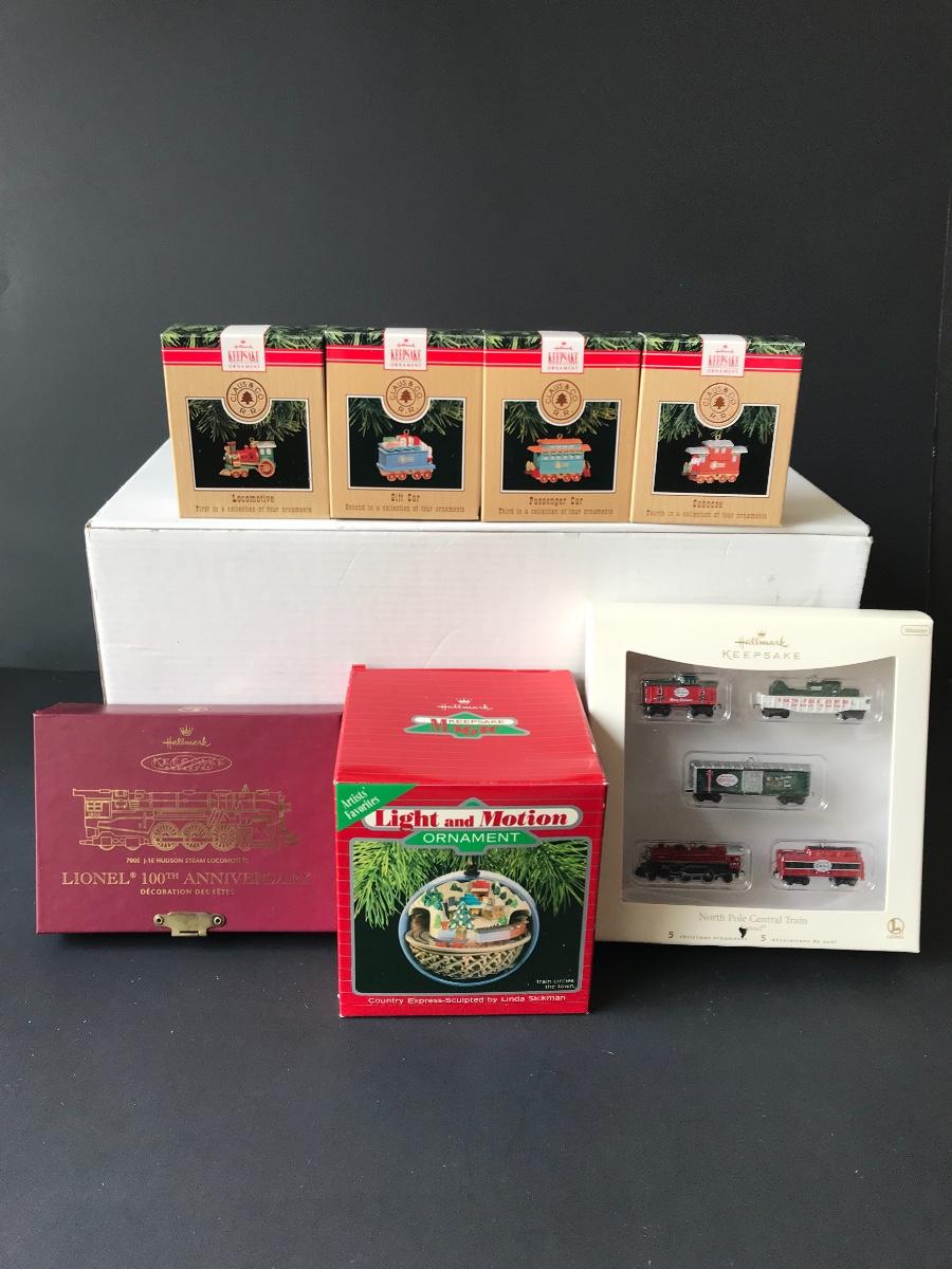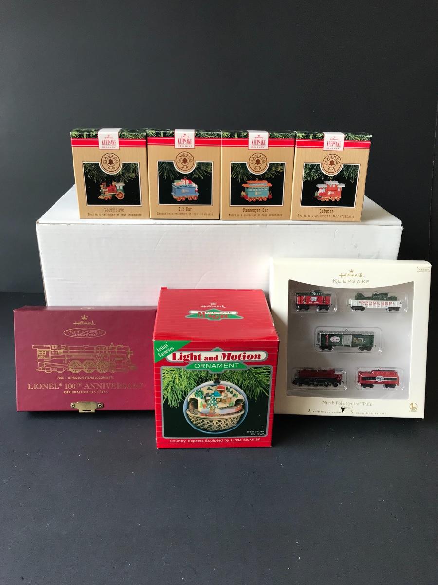 Train Christmas Ornaments - Hallmark Keepsake. All Holiday items in this auction are as-seen. The client collected a lot of holiday pieces and some are new in box, some were displayed once and come with original box, and some have been displayed and come with no box. They are all pre-owned in some fashion and have been stored in an attic or on shelf in library. Please see all pictures. The pictures show condition, measurements if taken, and what is included in the lot. Due to the large amount that we photograph and the time frame, we are not always able to take measurements. All items unless noted, are pre-owned and have been used. Thank you