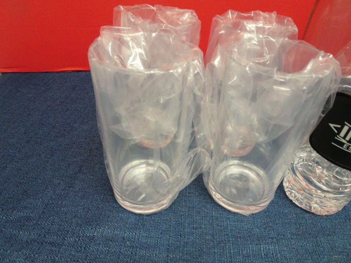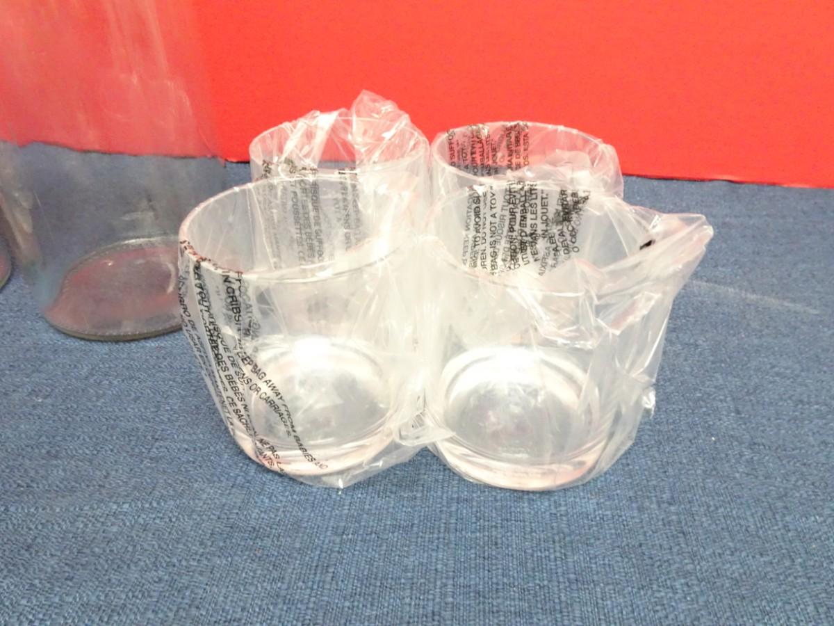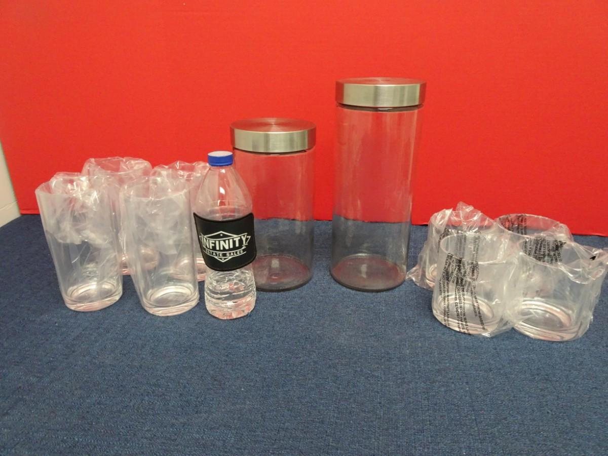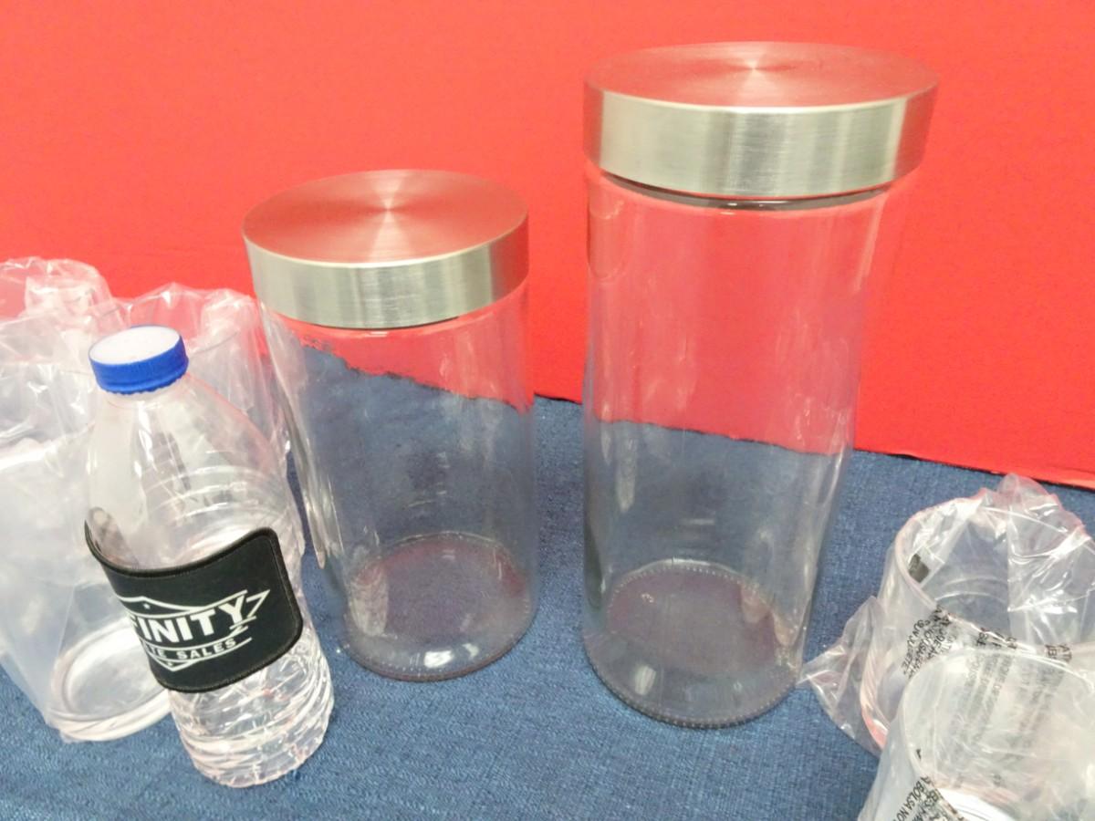 LOT 481 TWO GLASS CANISTERS AND PLASTIC CUPS