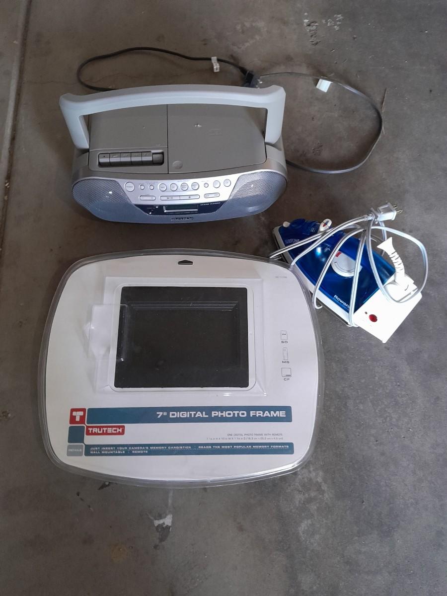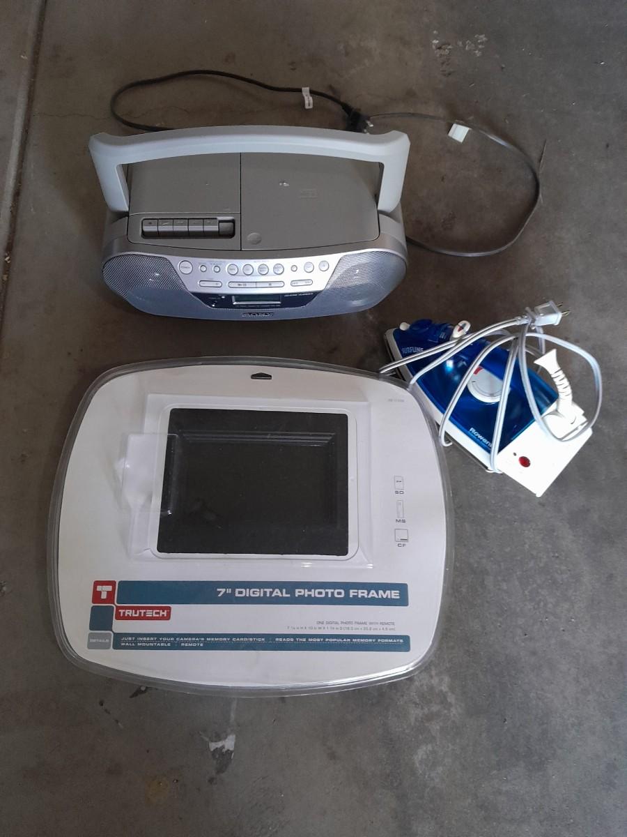 ROWENTA CLOTHES IRON, SONY AM/ FM CD PLAYER RADIO, AND BRAND NEW 7" DIGITAL PHOTO FRAME
