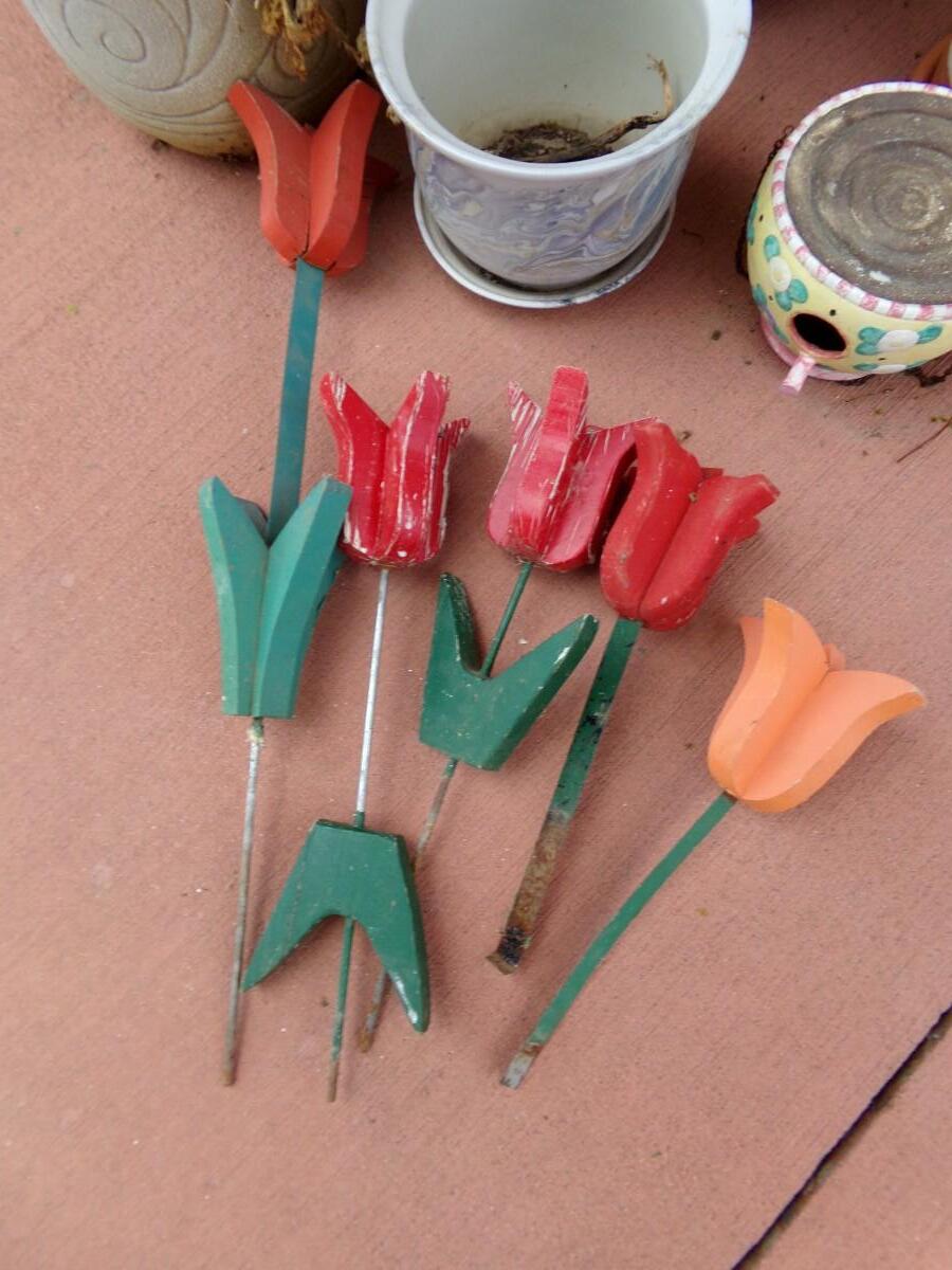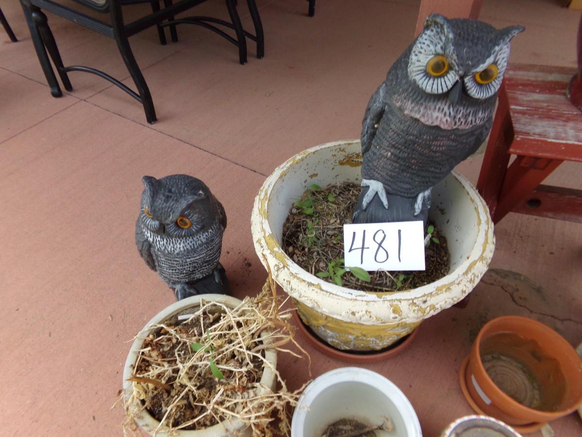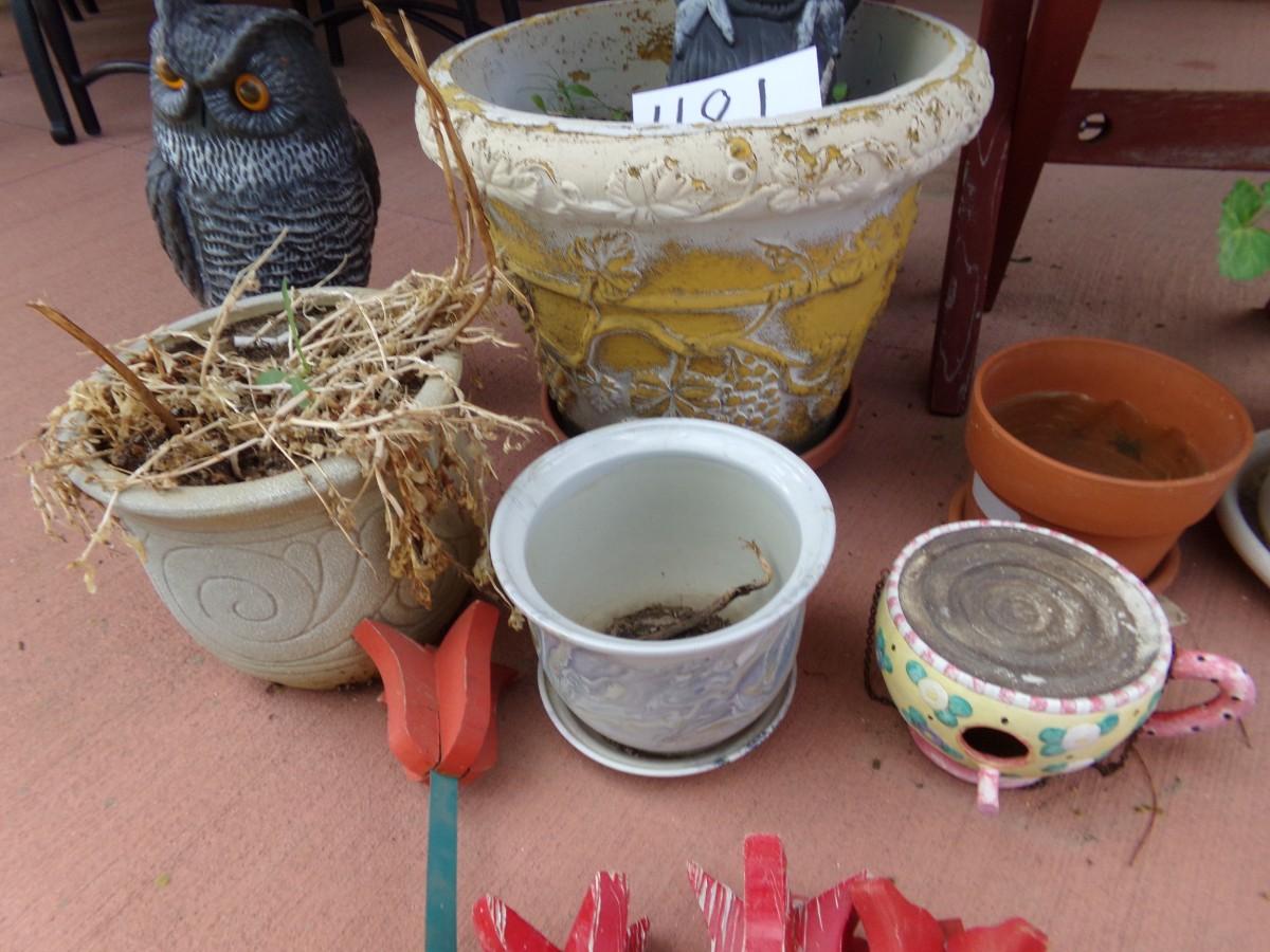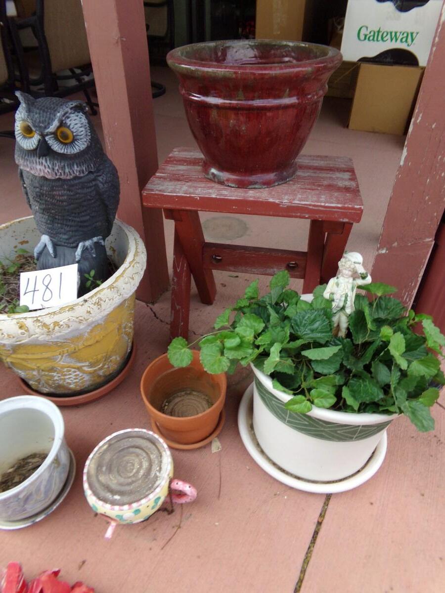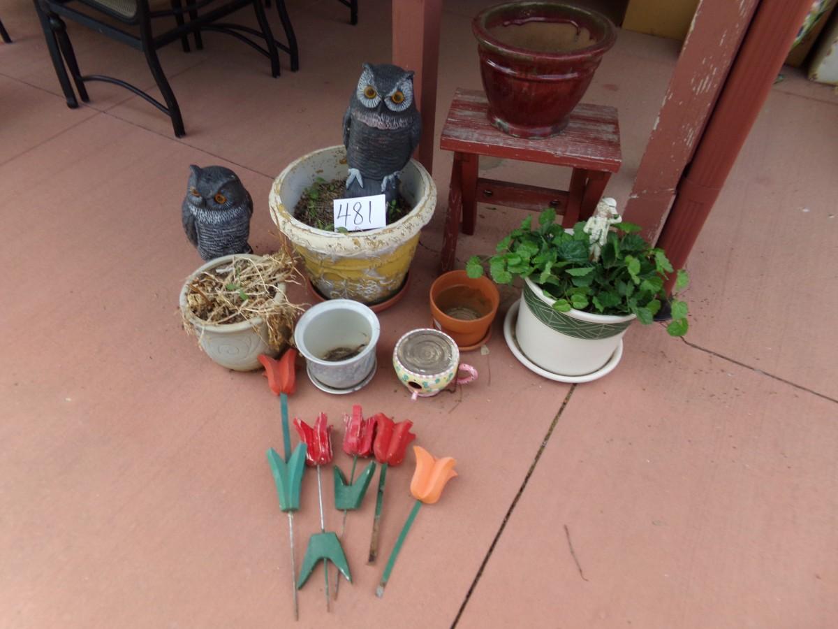 7 DIFFERENT PLANT POTS, 2 PLASTIC OWLS AND WOODEN FLOWERS THAT YOU CAN PLACE IN YOUR YARD OR GARDEN.