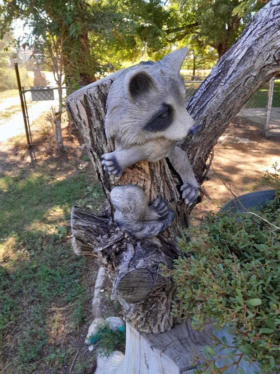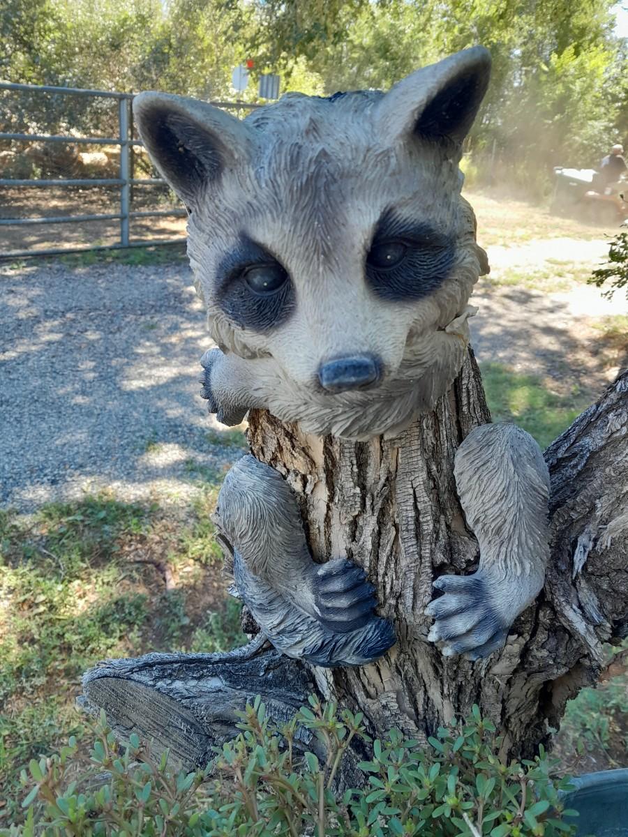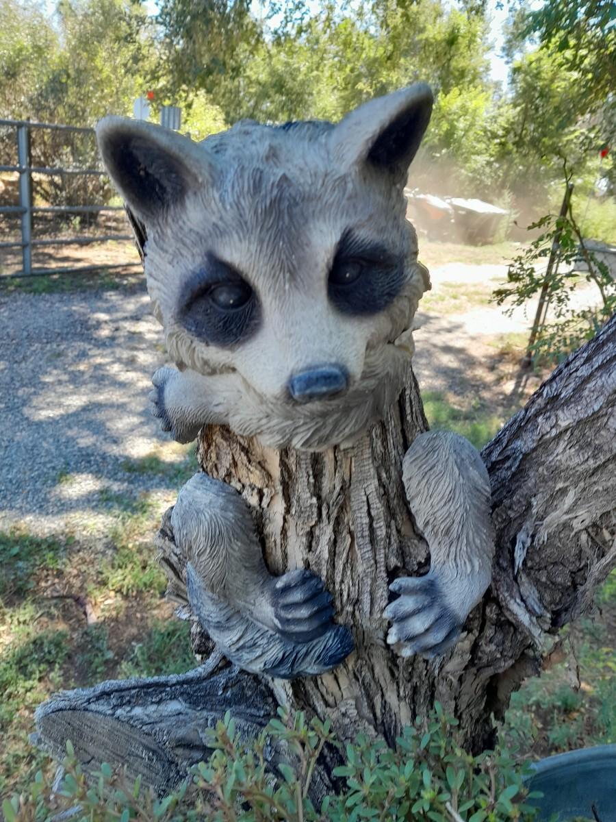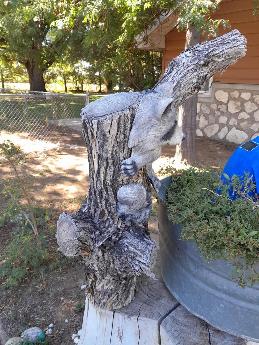 RACCOON FIGURE ON A STUMP. HE CAN BE MOVED AND ADJUSTED TO ANY PIECE OF WOOD, HEAD, AND EACH FOOT ARE SEPERATE PIECES.