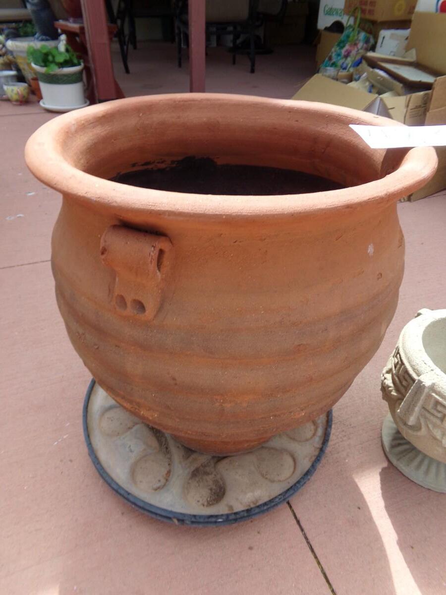 2 PLANTERS, LARGE TERRA COTTA PLANT POT ON BASE WITH CASTERS, AND THE OTHER IS CONCRETE