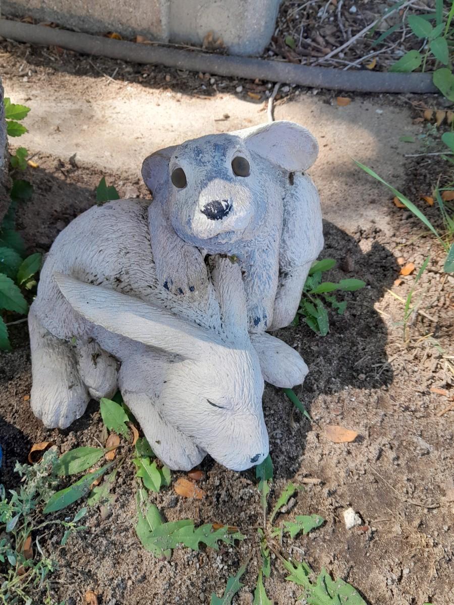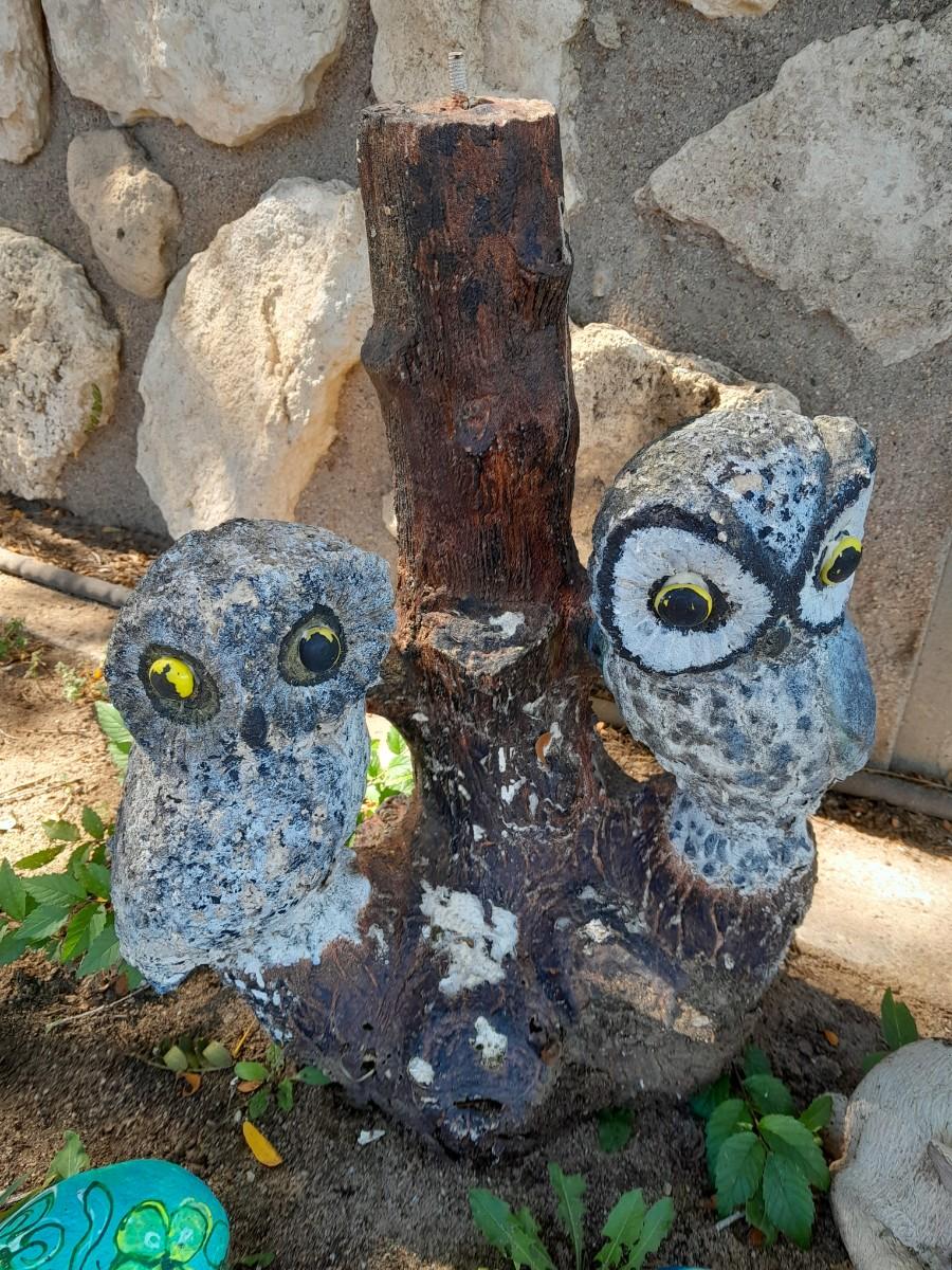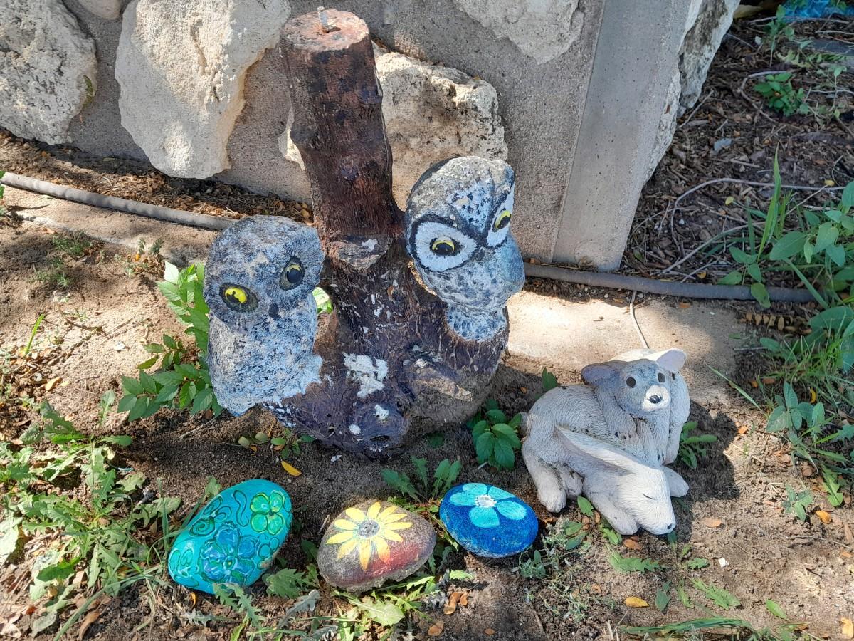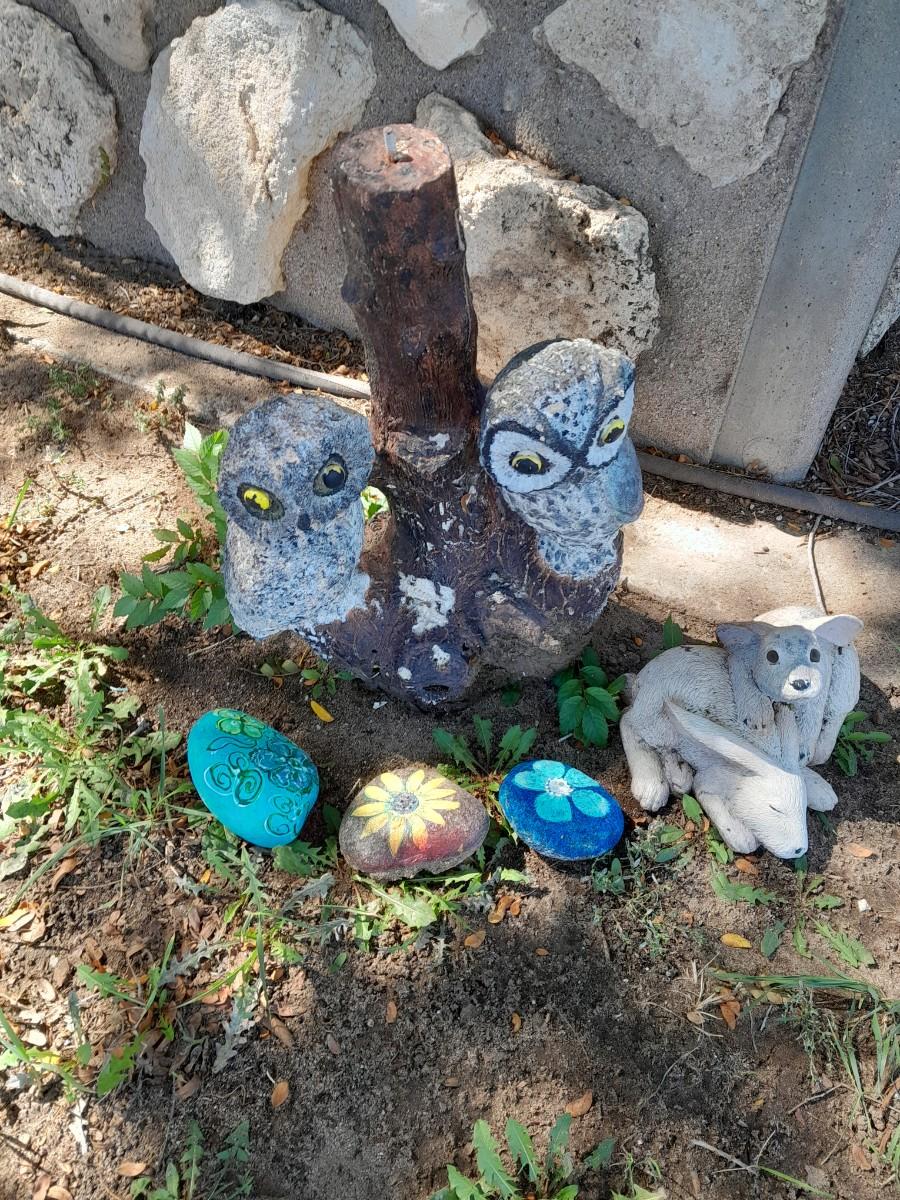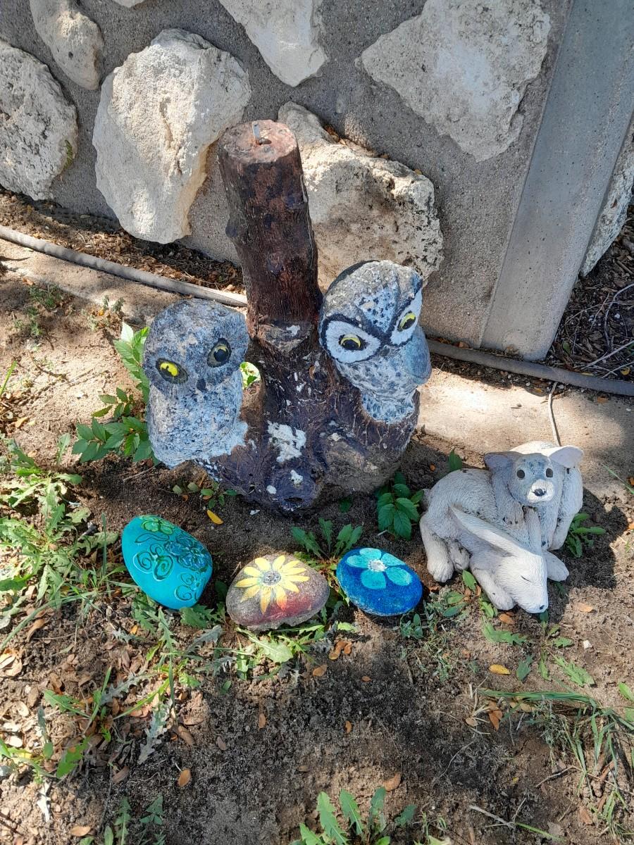 20" CEMENT OWLS, HAND PAINTED ROCKS, AND BUNNIES FOR THE GARDEN
