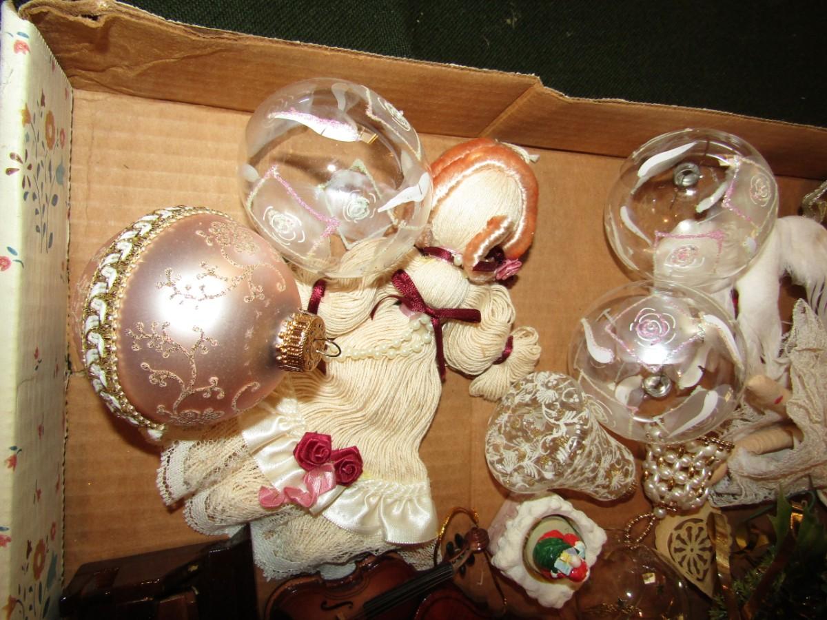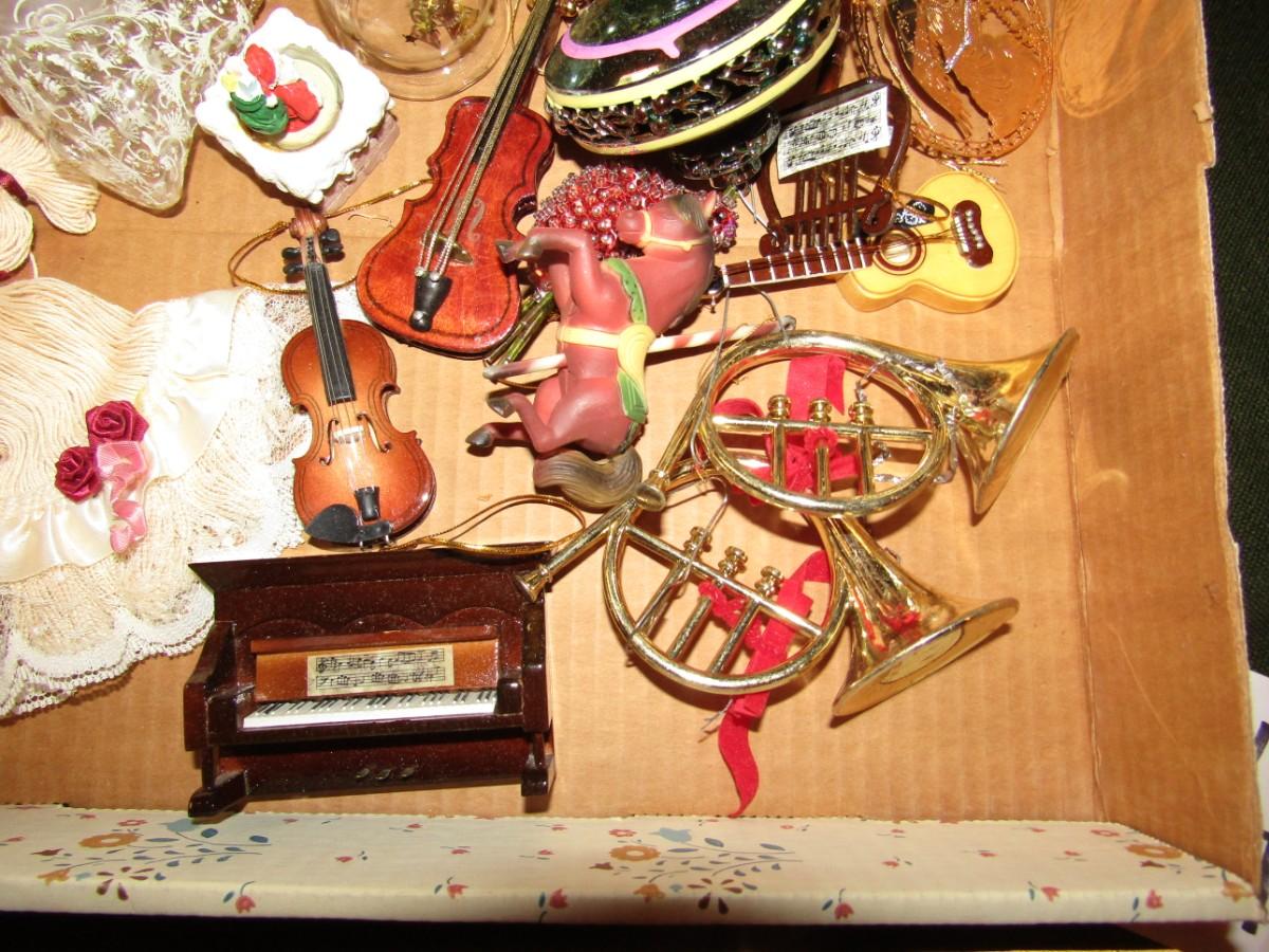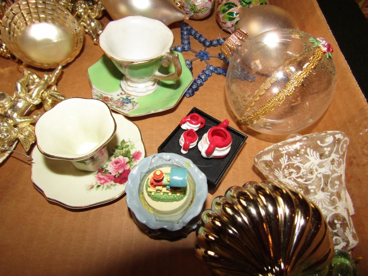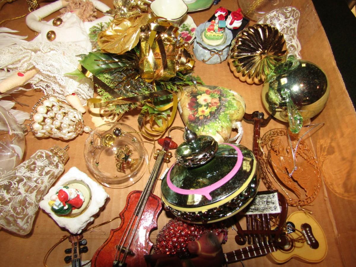GLASS, MUSICAL INSTRUMENTS, CHINA CUPS & SAUCERS AND OTHER CHRISTMAS ORNANENTS