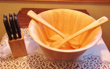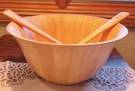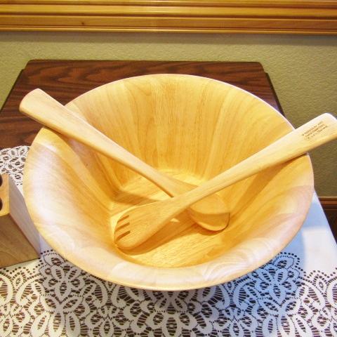 BEAUTIFUL SOLID WOOD SALAD BOWL WITH WOODEN SERVING UTENSILS