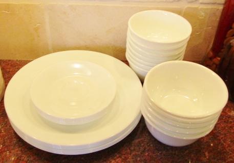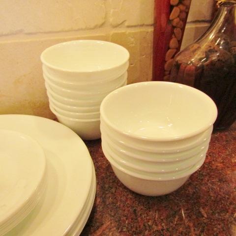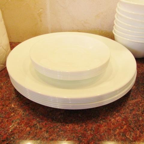CORELLE DINNER PLATES, DEEP BOWLS AND SAUCERS