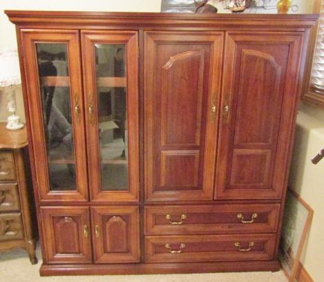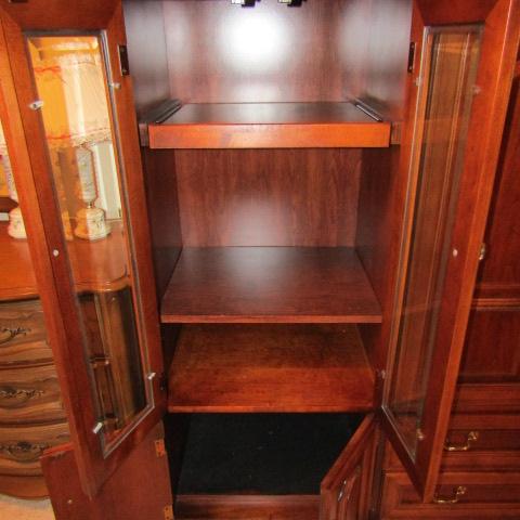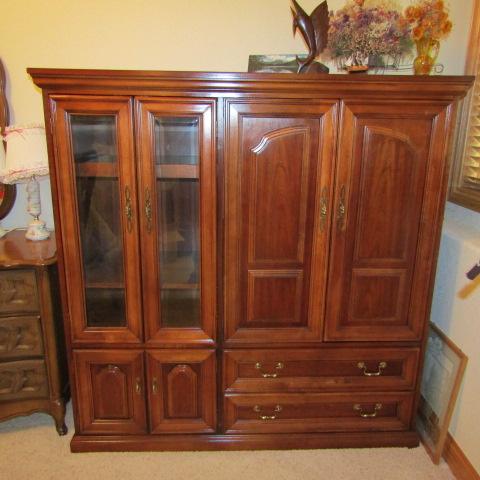 IT HAS A PULL OUT SHELF FOR A TV, 2 DRAWERS, SMALLER CABINET AND GLASS FRONT CABINETS