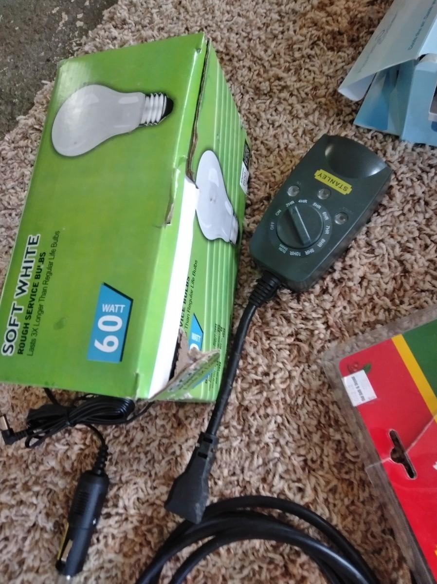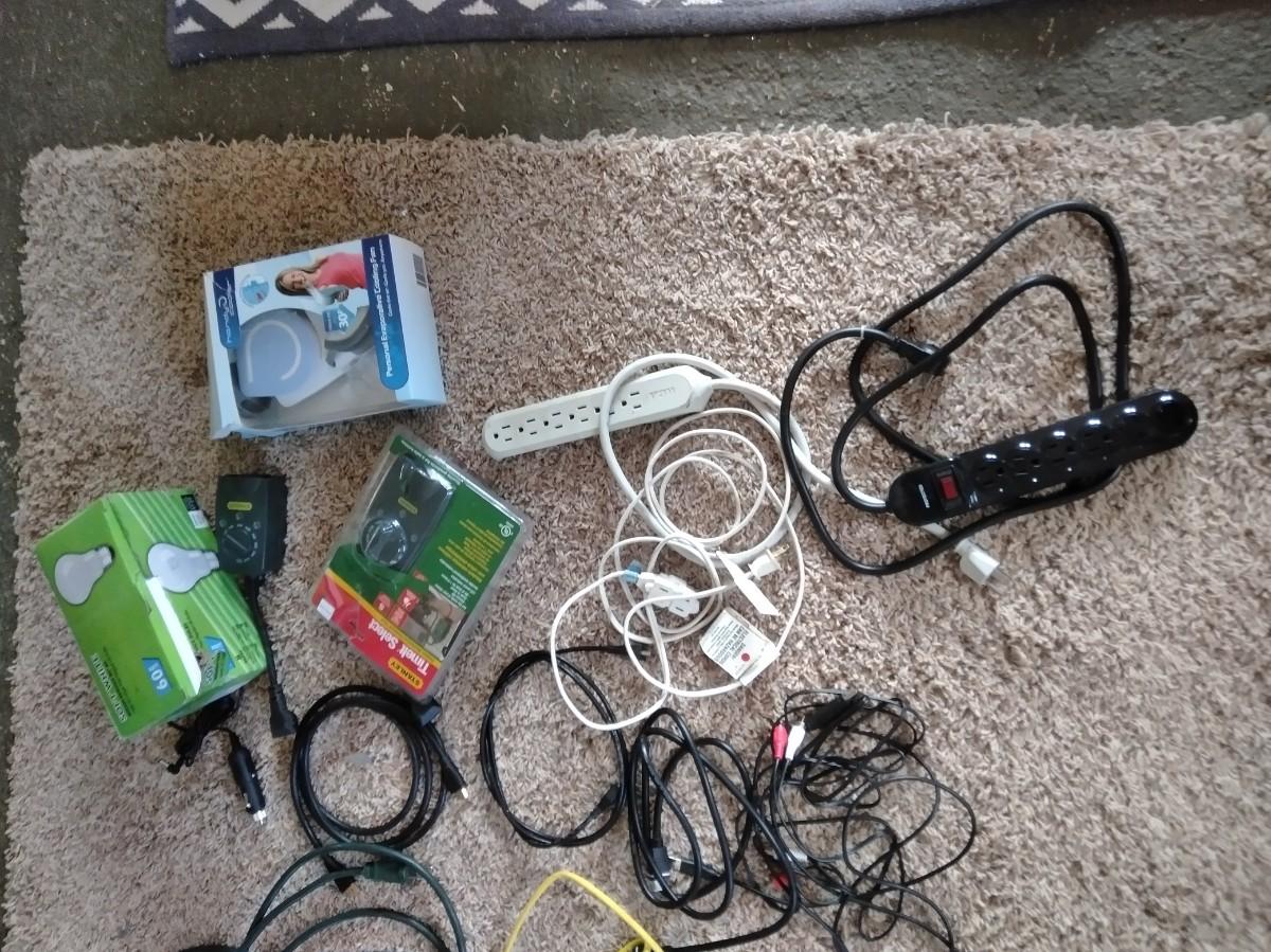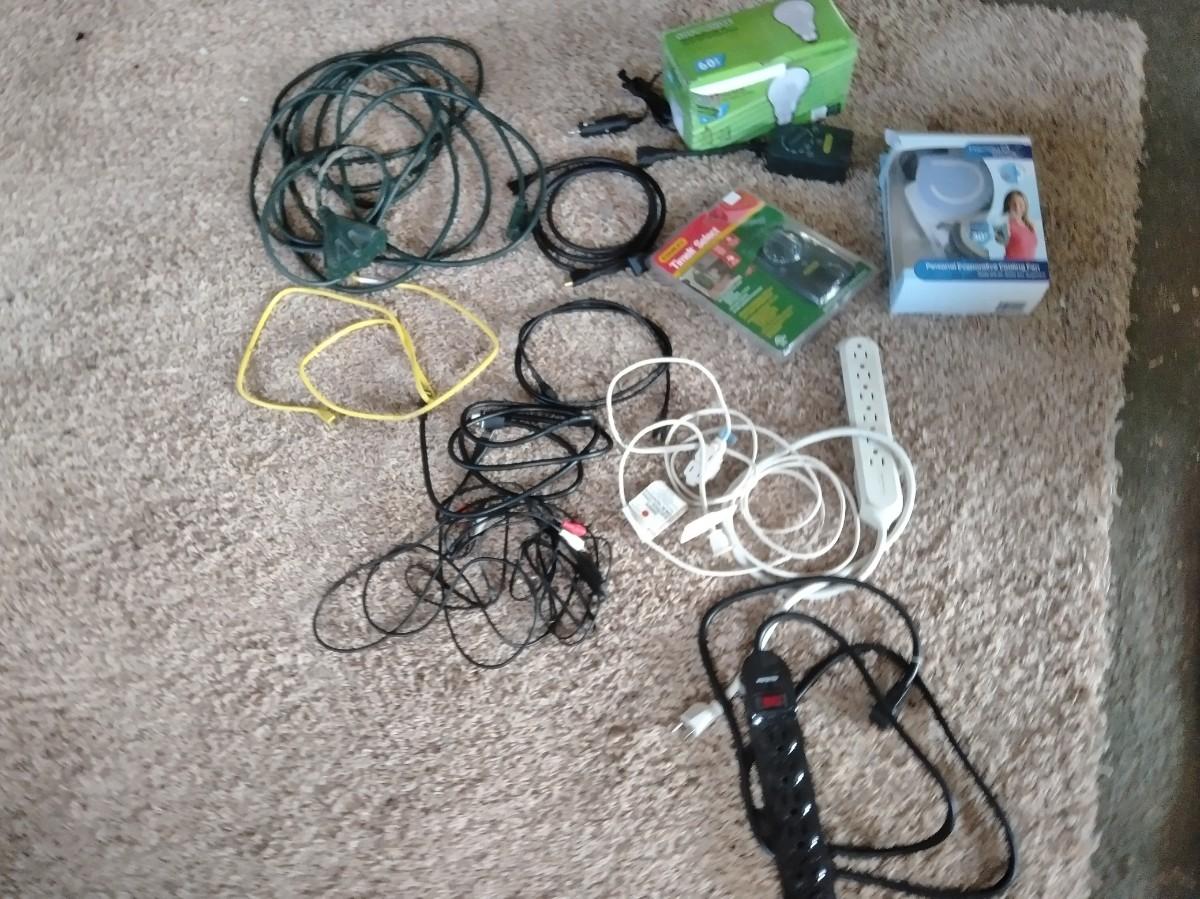 ASSORTMENT OF POWER CORDS, PACKAGE OF LIGHT BULBS, AND A HANDY COOLING FAN