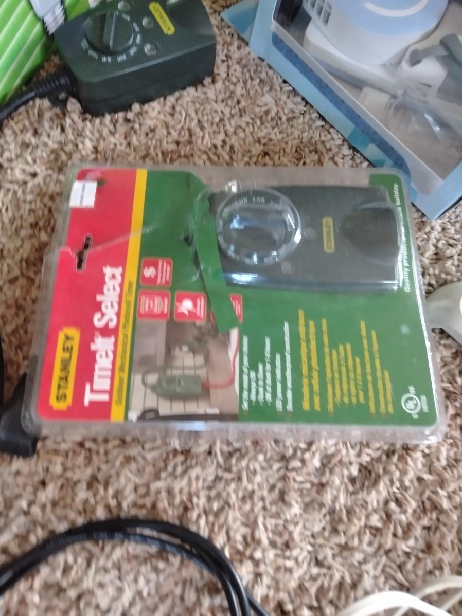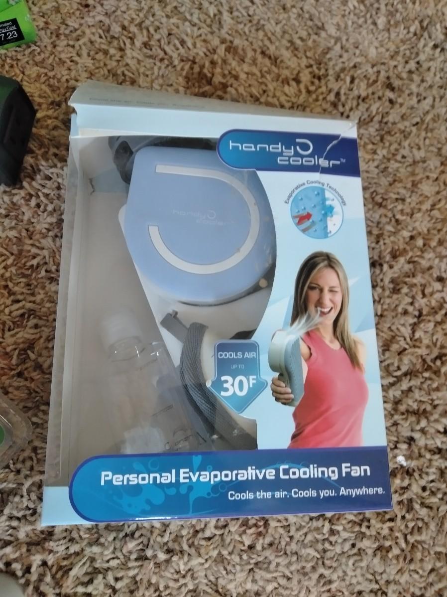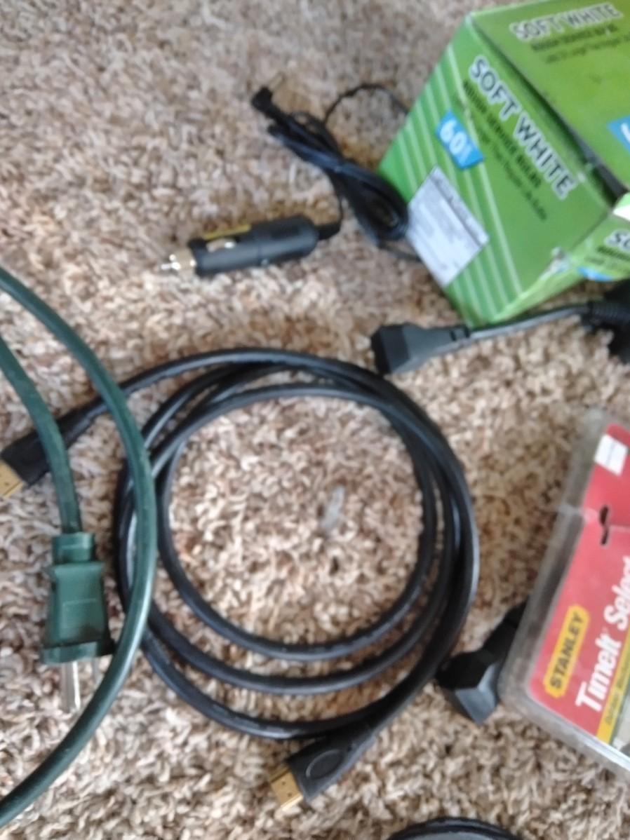 ASSORTMENT OF POWER CORDS, PACKAGE OF LIGHT BULBS, AND A HANDY COOLING FAN