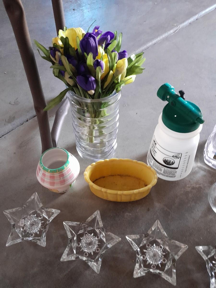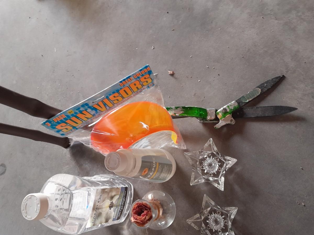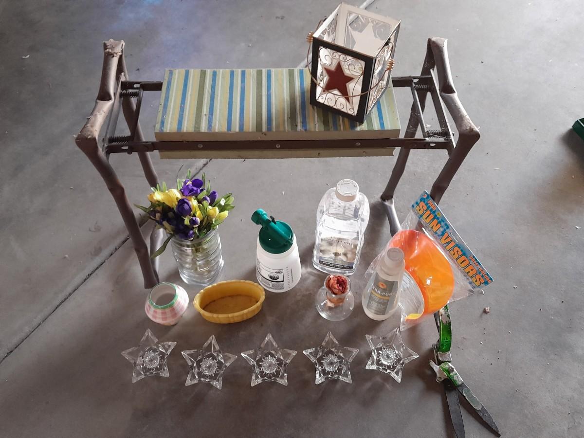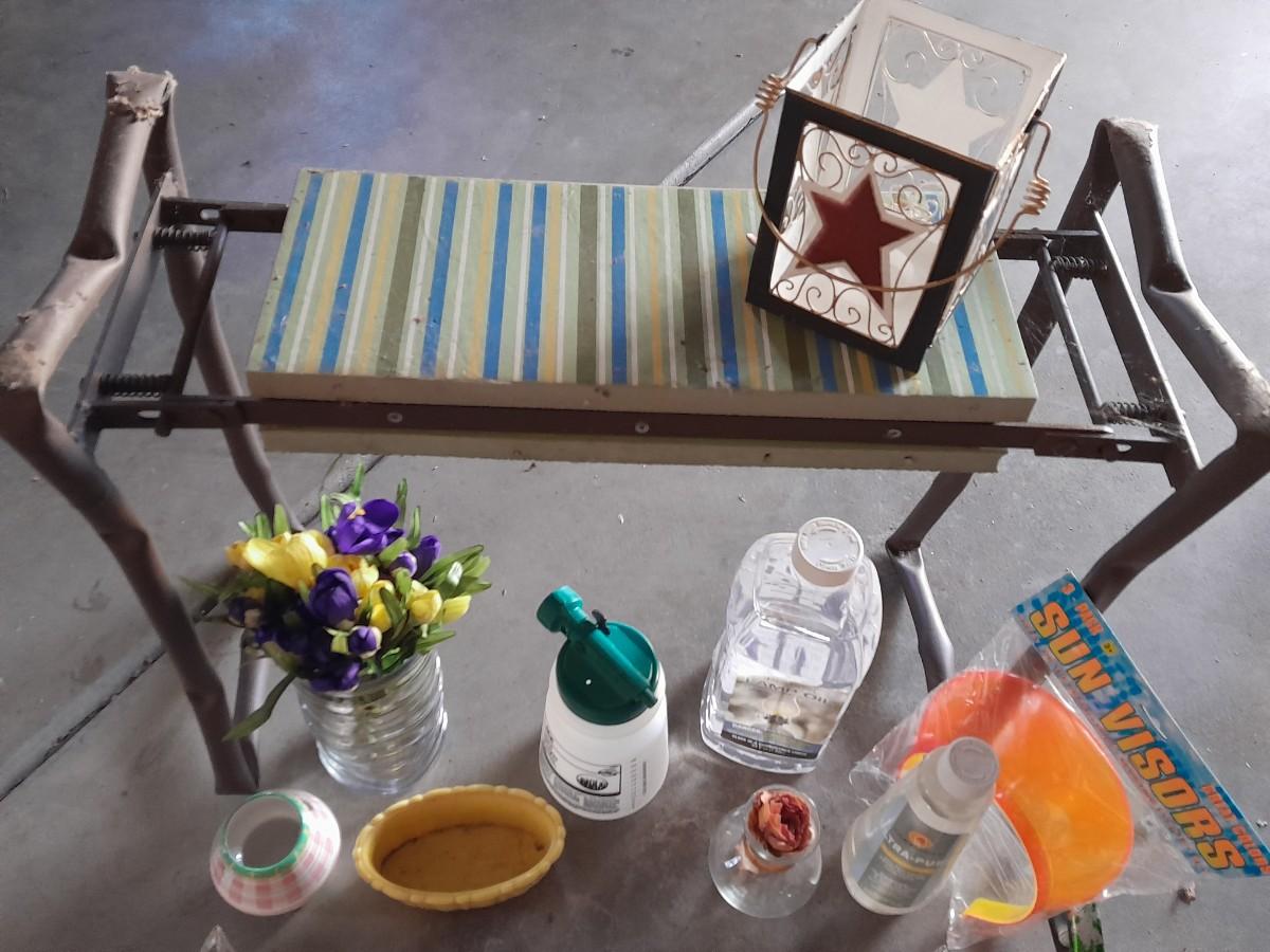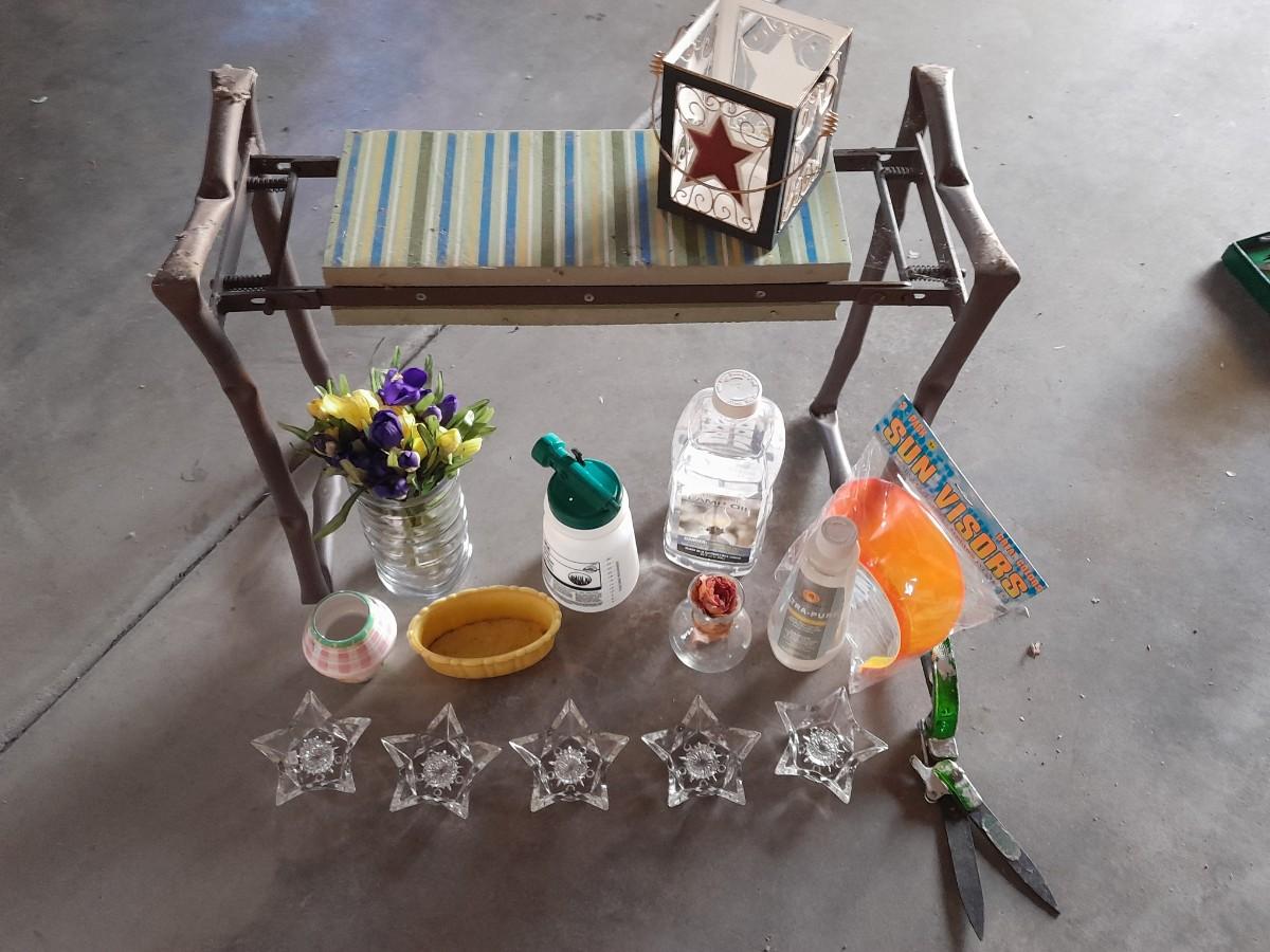 GARDEN BENCH, DECORATIVE ITEMS, AND HAND SANITIZER