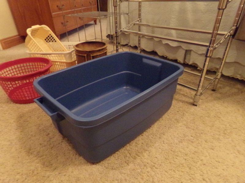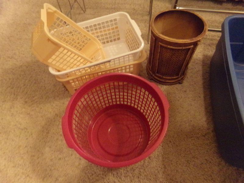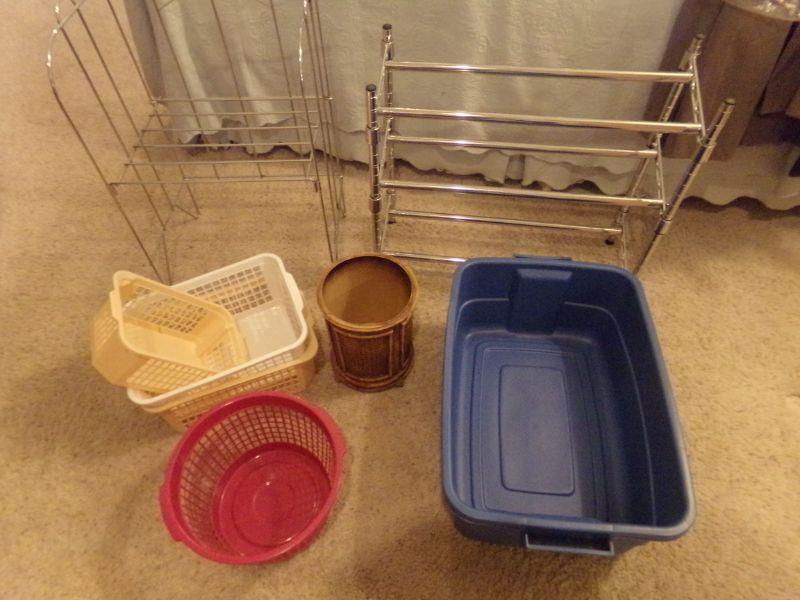 VARIOUS BASKETS, BLUE TOTE, SHOE & BLANKET CHROME RACK