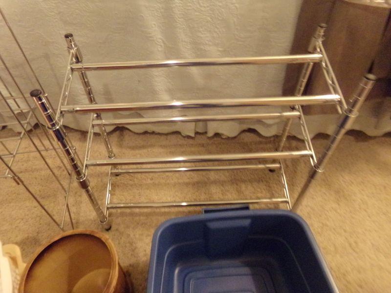 LOT 213 VARIOUS BASKETS, BLUE TOTE, SHOE & BLANKET CHROME RACKS