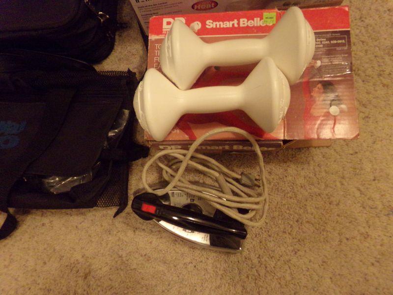 LOT 214  CARRY ON BAGS, MASSAGER, BRIEF CASE, HAND WEIGHTS, TRAVEL IRON