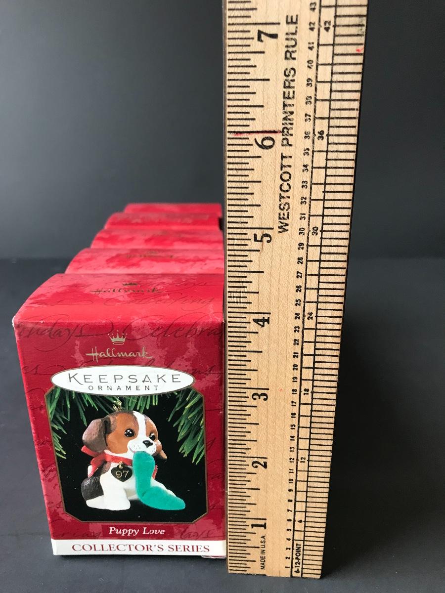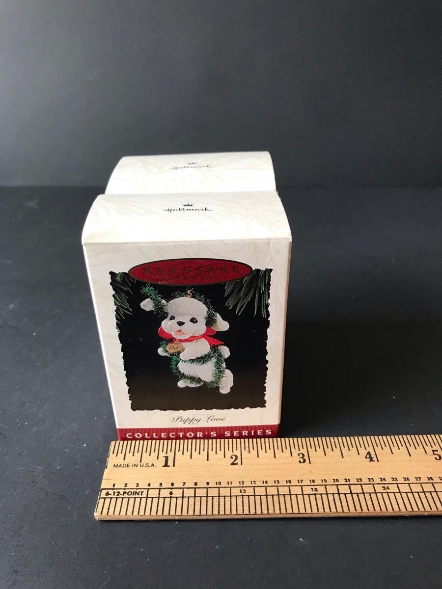 Puppy Love Hallmark Keepsake Dog Christmas Ornaments. All Holiday items in this auction are as-seen. The client collected a lot of holiday pieces and some are new in box, some were displayed once and come with original box, and some have been displayed and come with no box. They are all pre-owned in some fashion and have been stored in an attic or on shelf in library. Please see all pictures. The pictures show condition, measurements if taken, and what is included in the lot. Due to the large amount that we photograph and the time frame, we are not always able to take measurements. All items unless noted, are pre-owned and have been used. Thank you