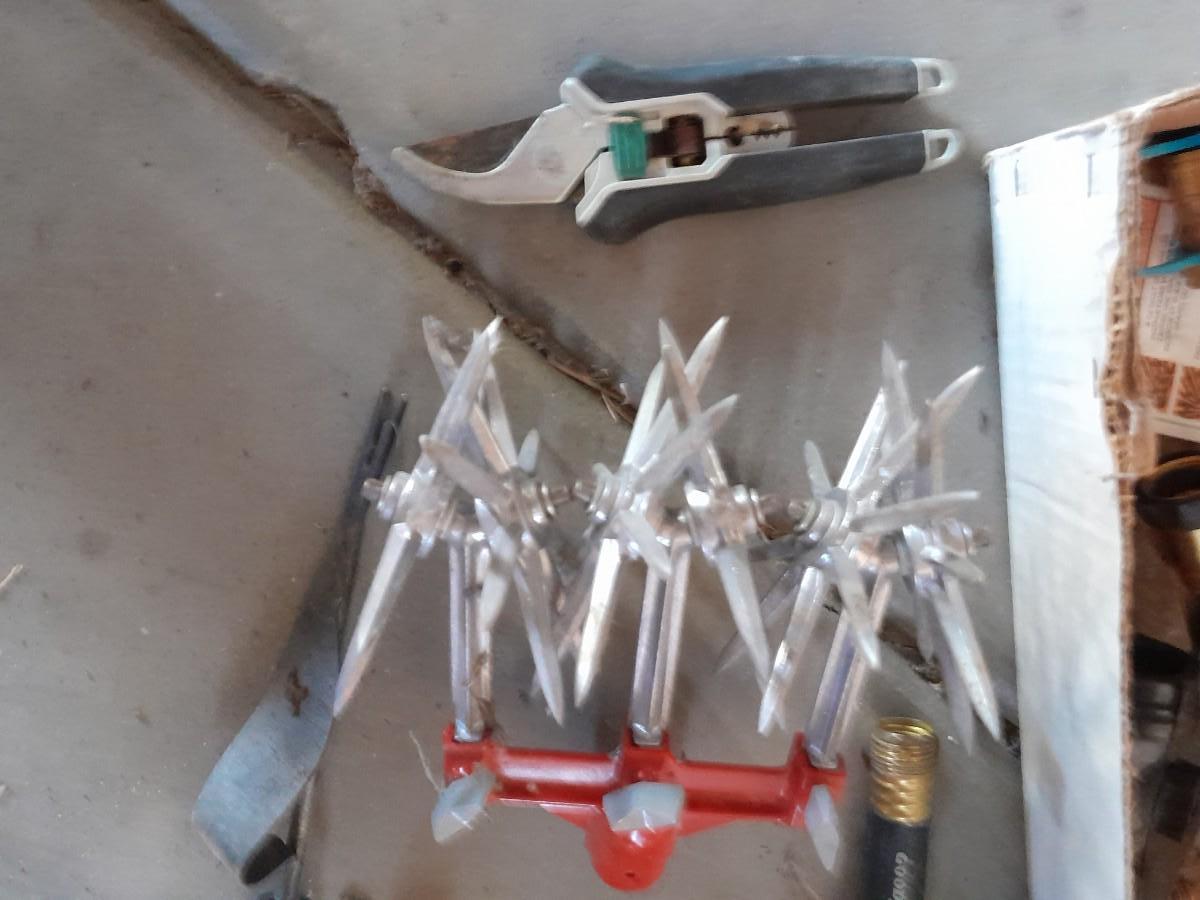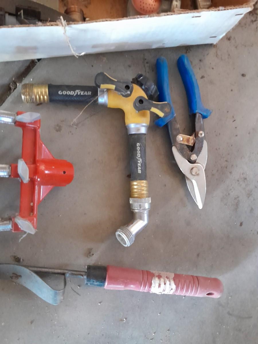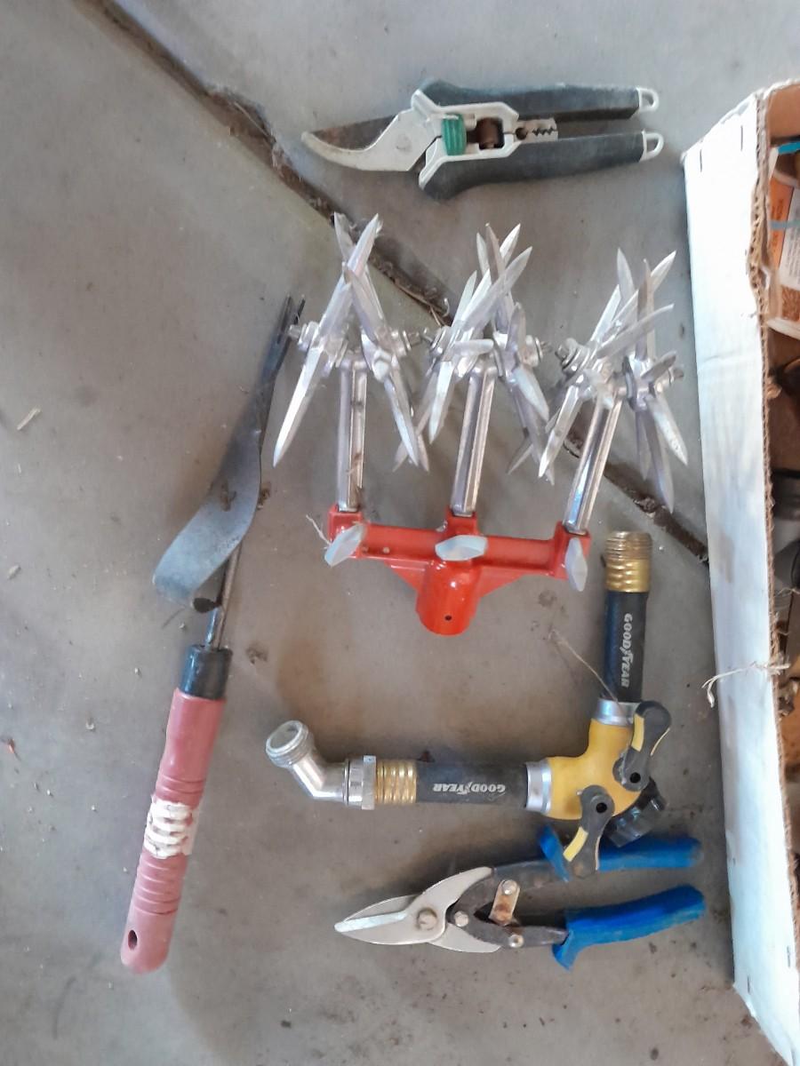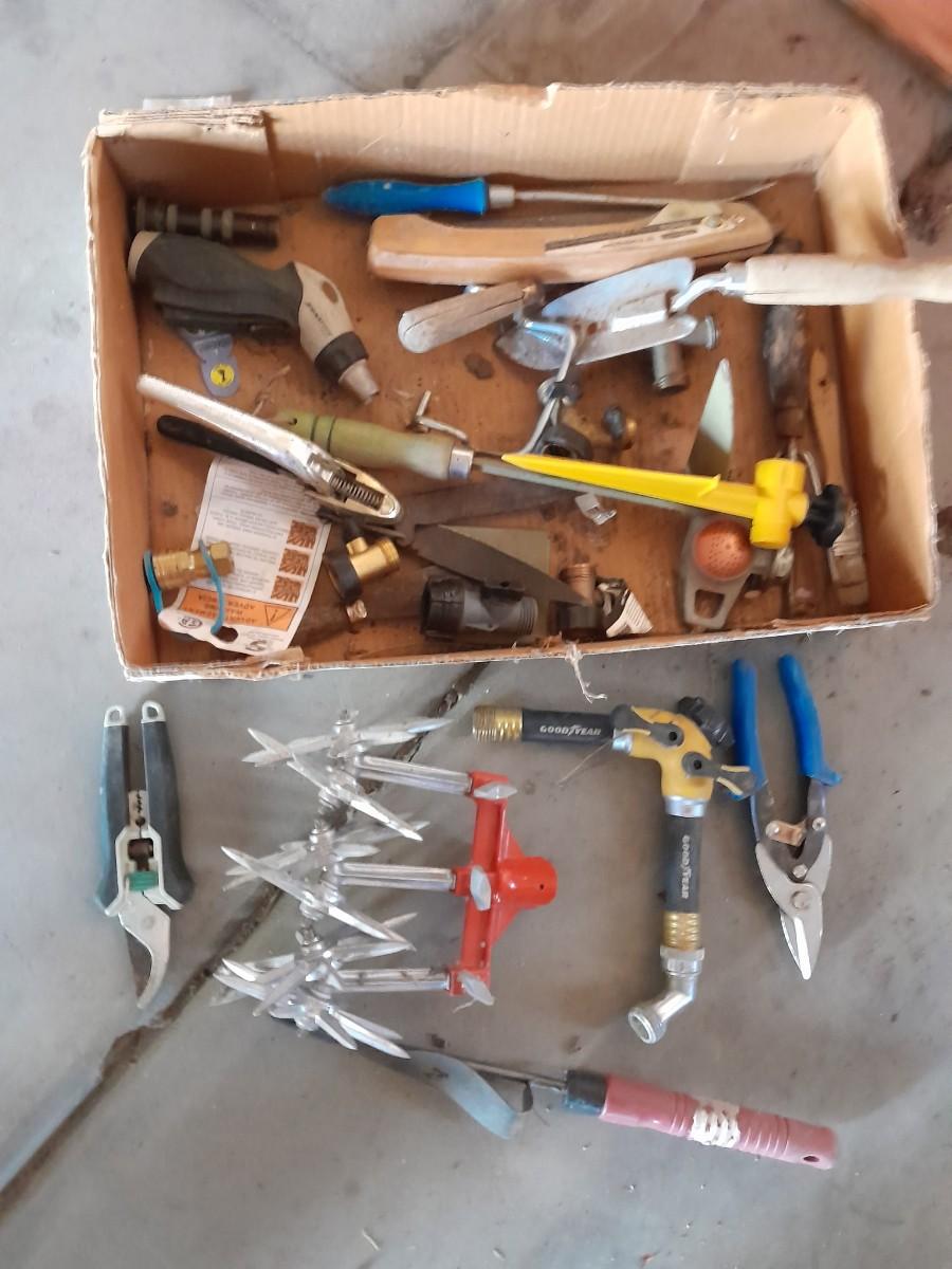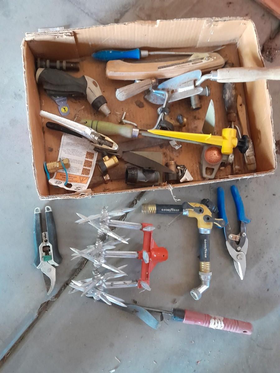 BOX OF GARDENING TOOLS, SPRINKLERS AND MORE