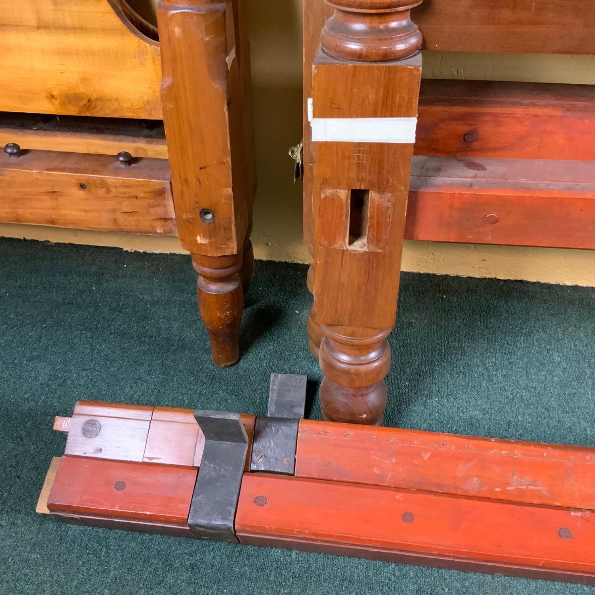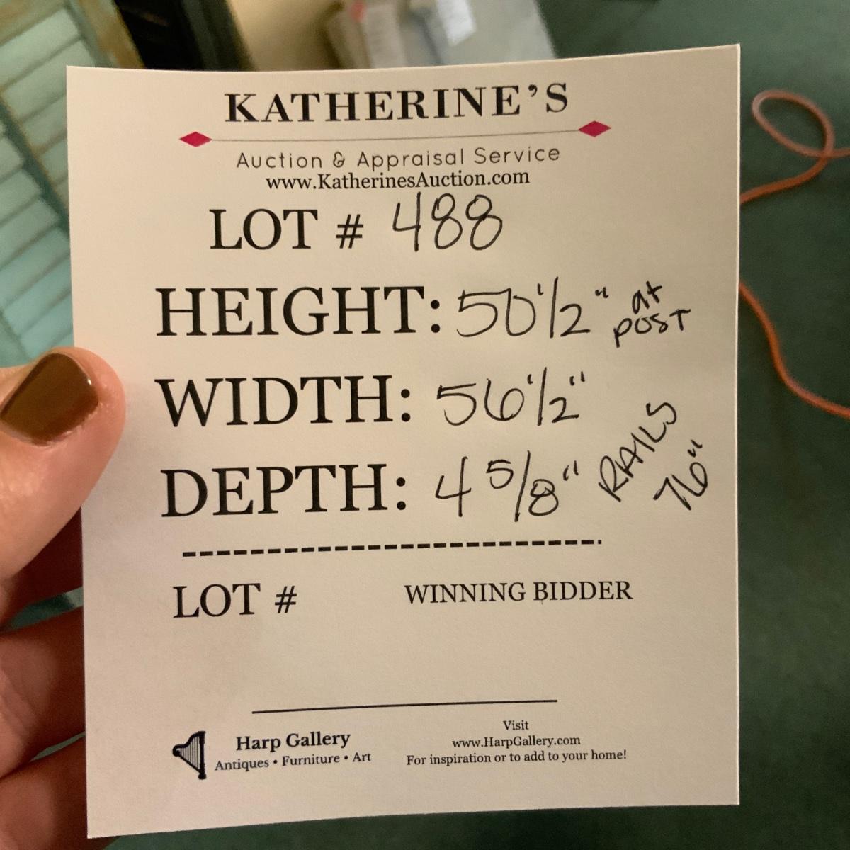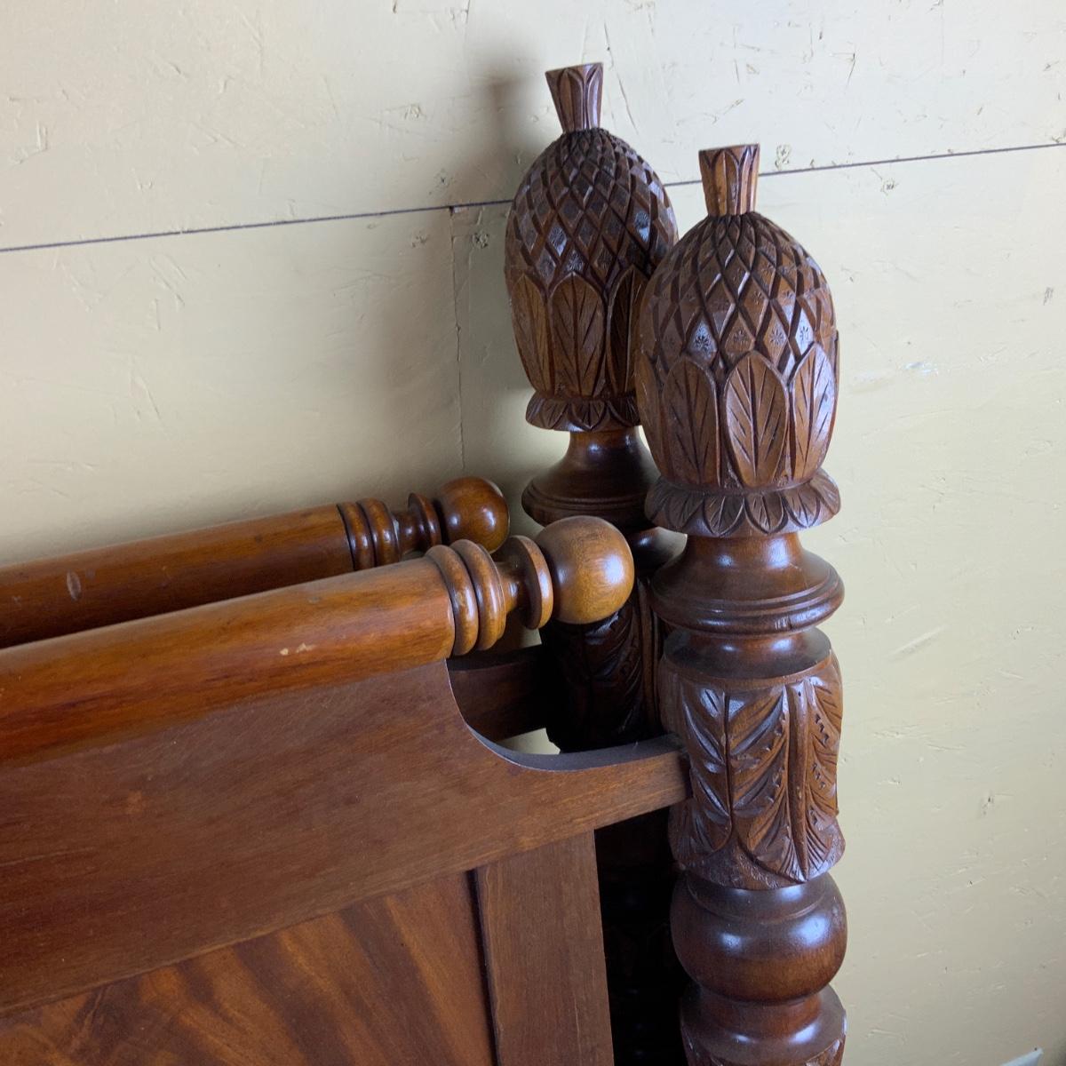 Impressive Pineapple Head and Footboard, with heavy duty rails. Rustic and timeless. The front and back panels look the same on either side. //::\\ Please see photos for details and condition. No attempt has been made to hide any imperfections. All items listed in this auction are warehouse items, and need to be cleaned. A majority of the items need restoration as well. All items are sold AS IS and WITHOUT GUARANTEE. If you are uncertain about an item, DO NOT BID. Due to the nature of this online auction in-person inspection is HIGHLY recommended. All Sales are FINAL. Pick Up Times are FIRM. Please confirm with your own schedule that you can pick up in the scheduled times listed in the Terms and Conditions. Any questions please message the auctioneer. DO NOT Contact The Harp Gallery.