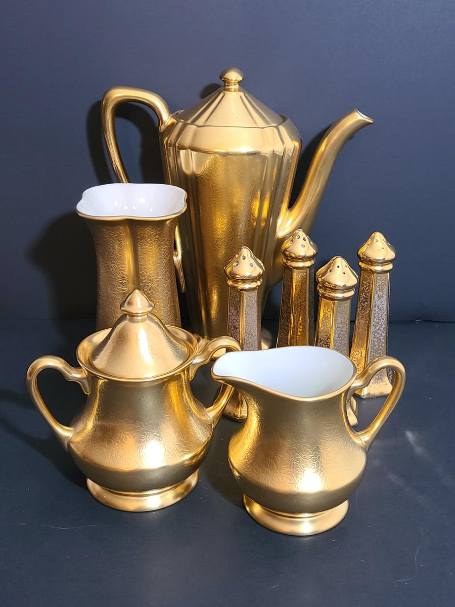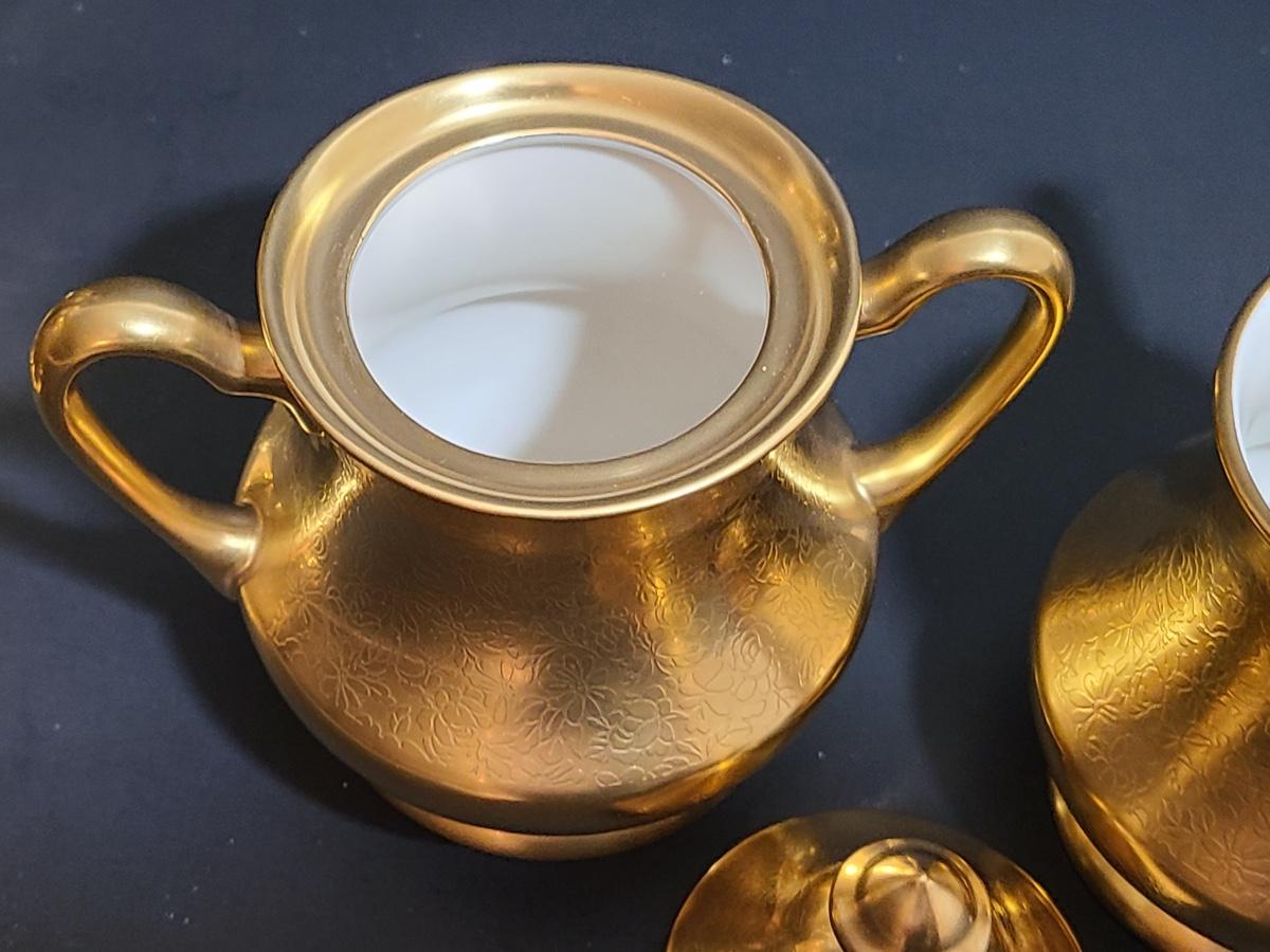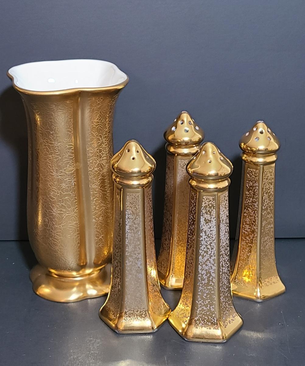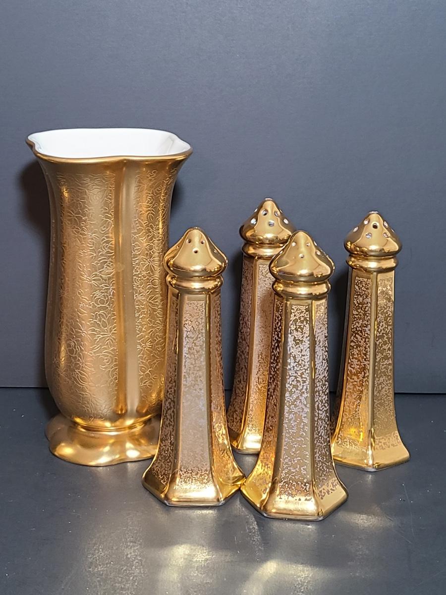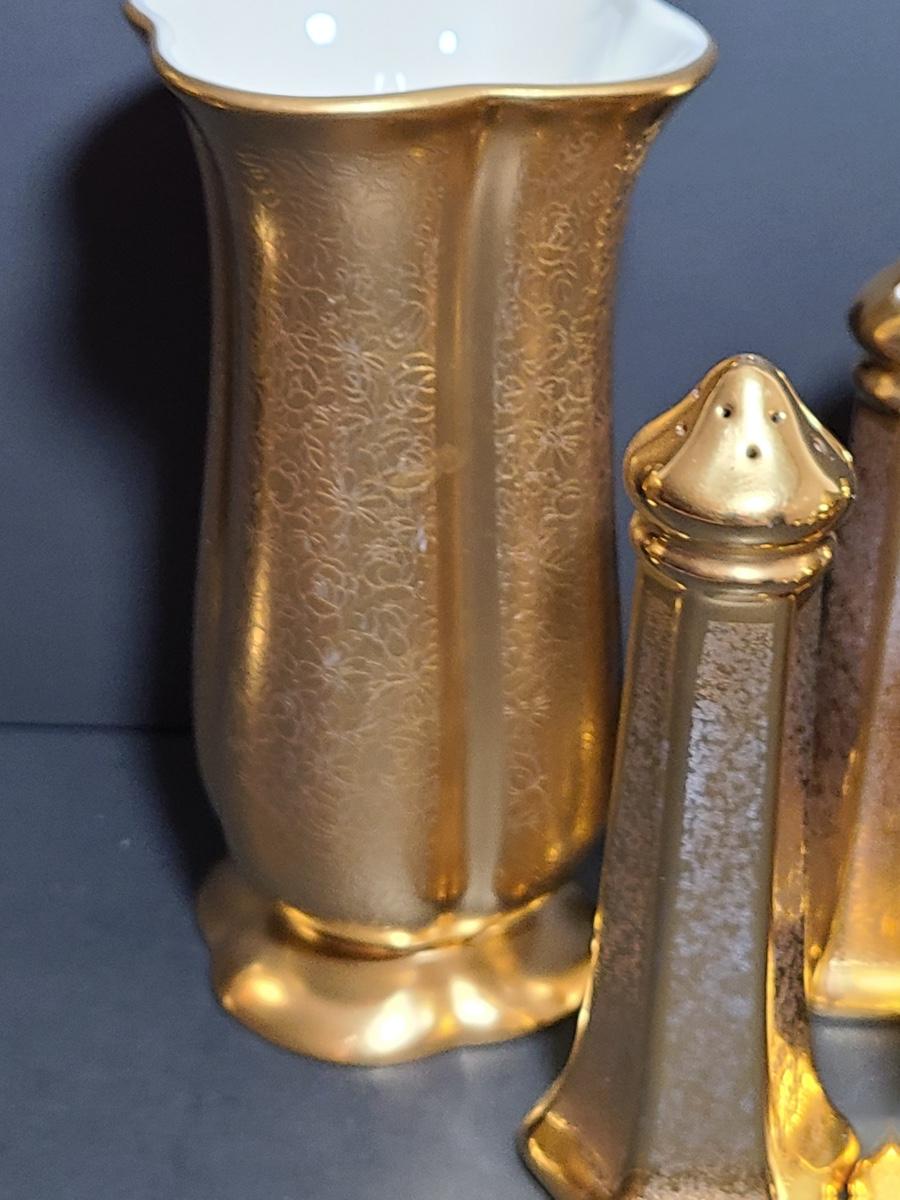 Lot 488: Vintage Pickard "Gold" Tea Set, Vase, and Salt/Pepper Sets