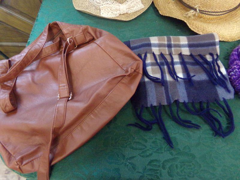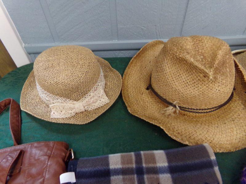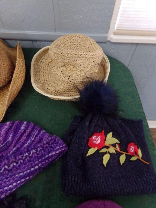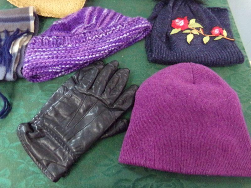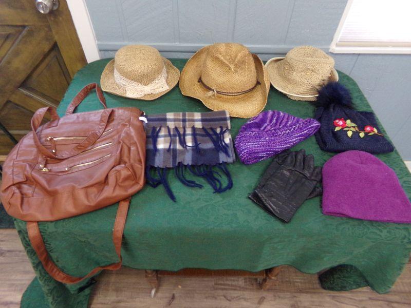 SEVERAL LADIES HATS AND BEANIES,PAIR OF GLOVES AND THERE IS ALSO A BROWN HANDBAG.