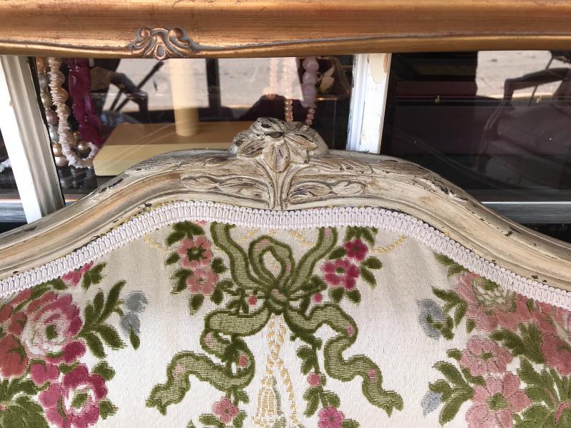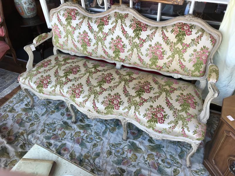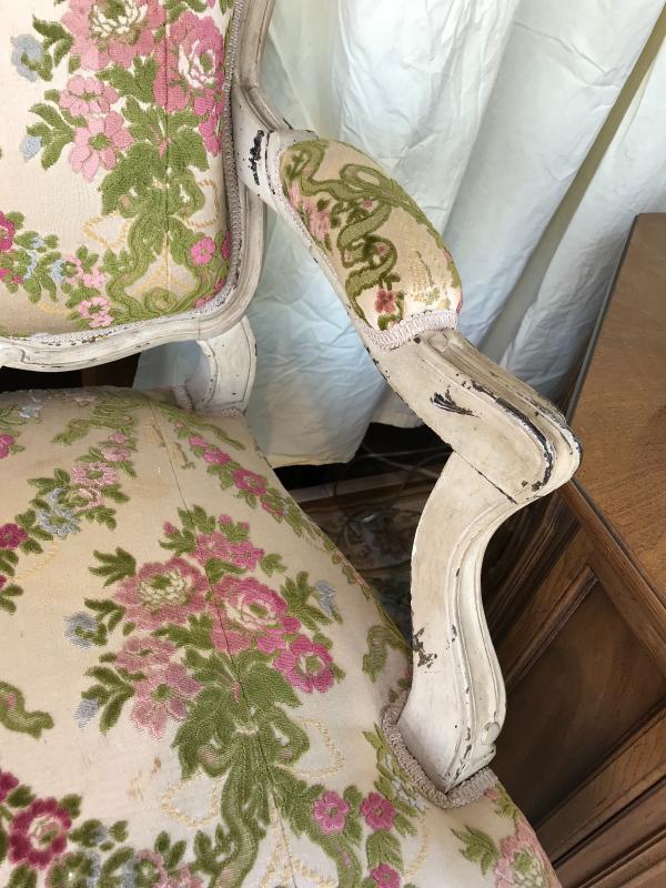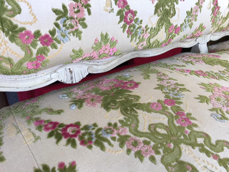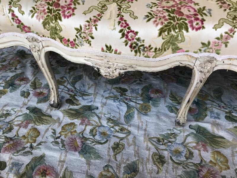 Beautiful antique 19th century French Canape or sofa. Louis XV style in carved walnut with original white finish. Original period correct cut velvet upholstery. 30" x 38" x 68" L