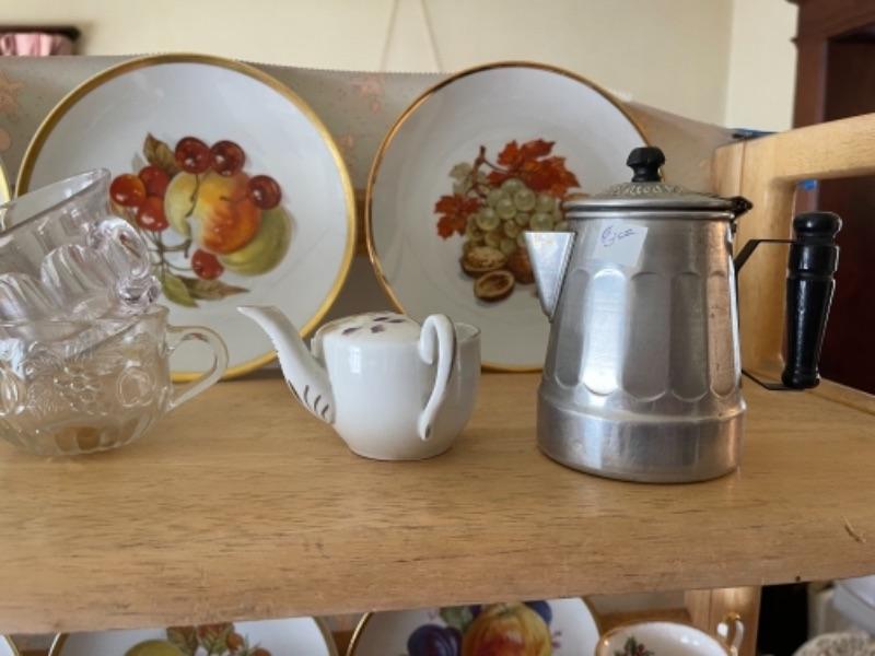 Lot 48DR. Large selection of saucers, china, Royal Albert demitasse cups/saucers, creamer/sugar dessert dishes, children’s toy kitchenware--Was $65 - -NOW $30