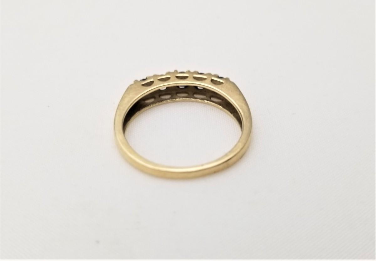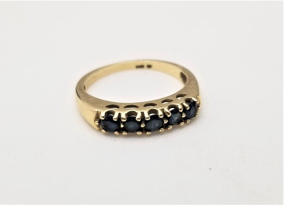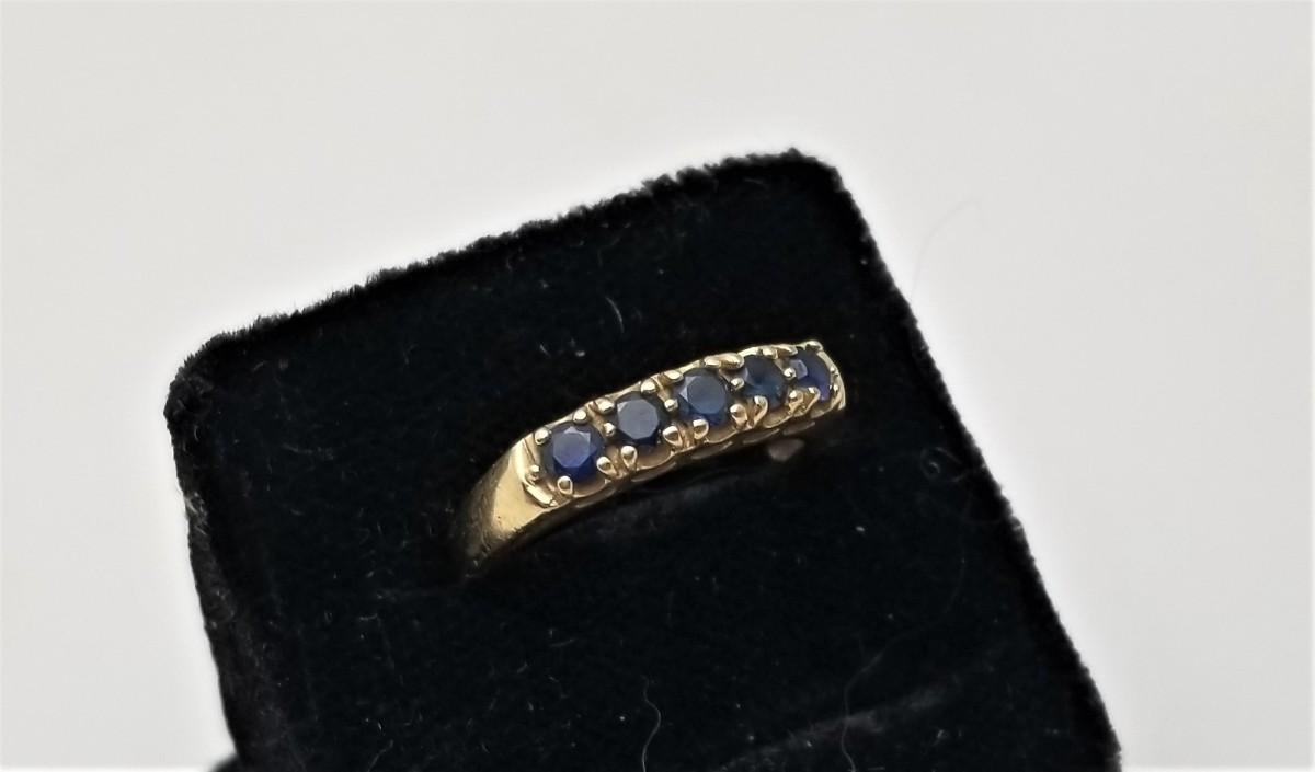 Nice piece of estate jewelry - 14kt yellow gold (marked and tested) set with five small sapphires, size 6.5. Good condition.