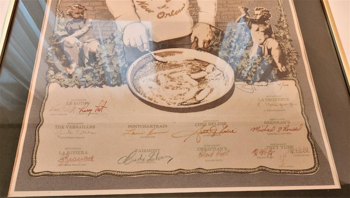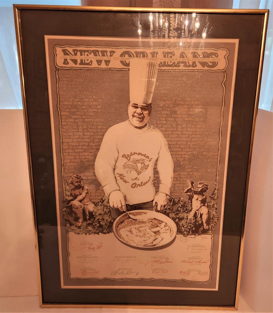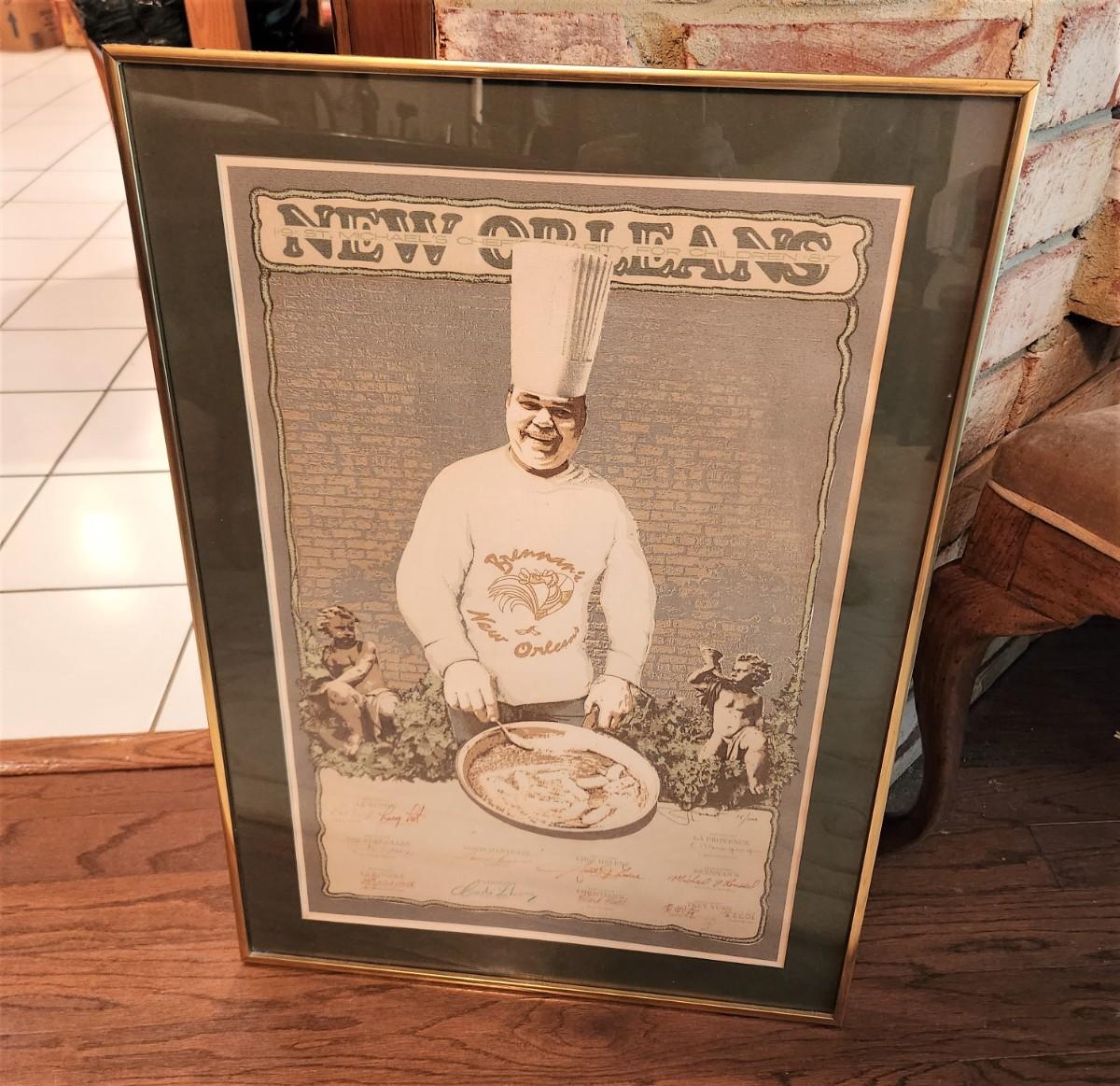 1987 Limited edition poster full of Ain't Dere No More Restaurant Chef original signatures: LeRuth's, Versailles, La Riviera, Chez Helene, Ponchartrain, Trey Yuen, La Provence, Fairmont...numbered 18/100 - 1987 edition. Framed, 28" x 20" . This is a true collectible.