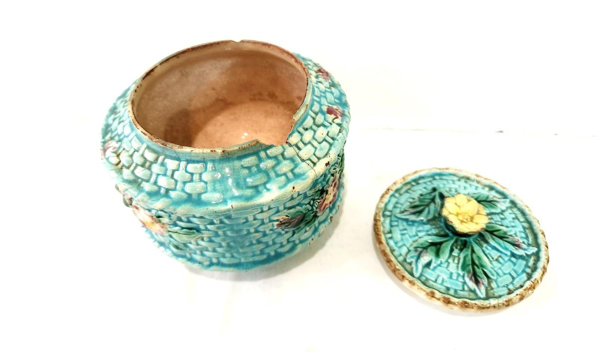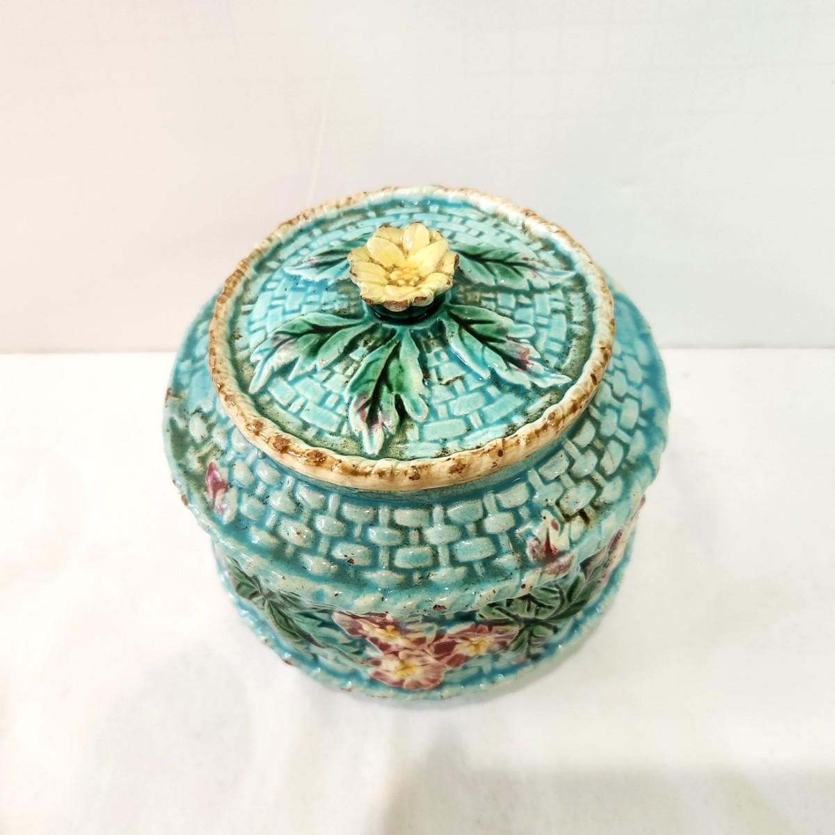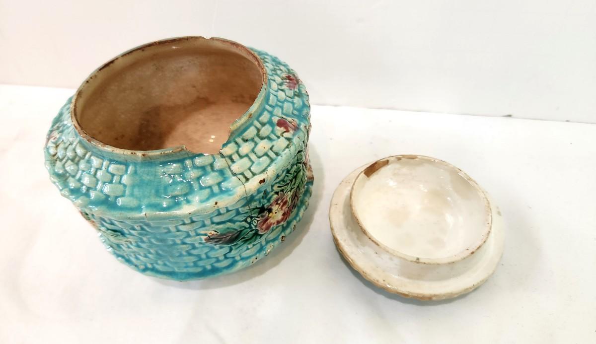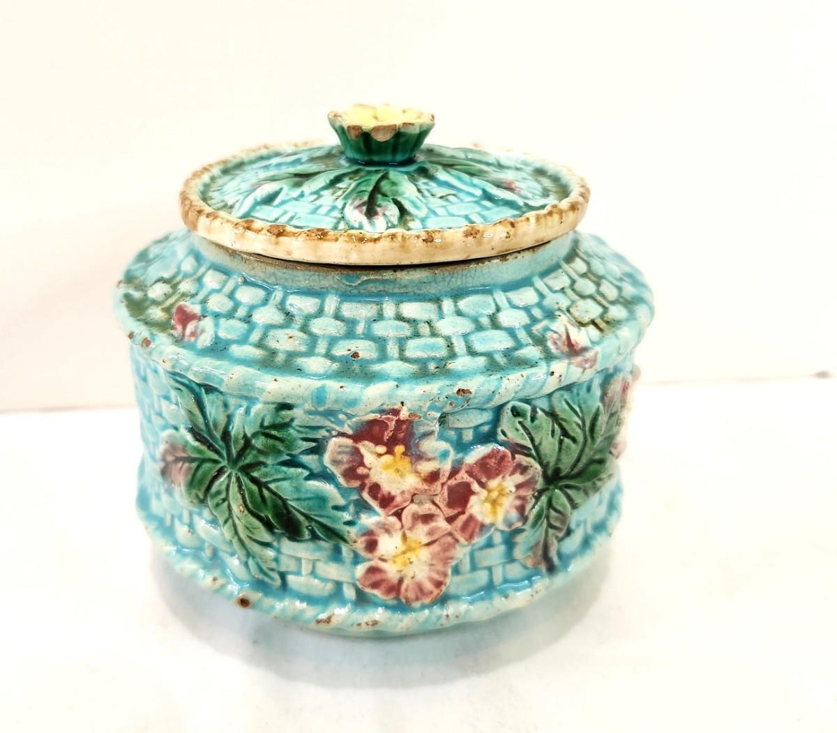 Classic 19th Century Majolica Jar w/lid - losses as shown - floral motif, likely English. 4.5" tall, 5" across.