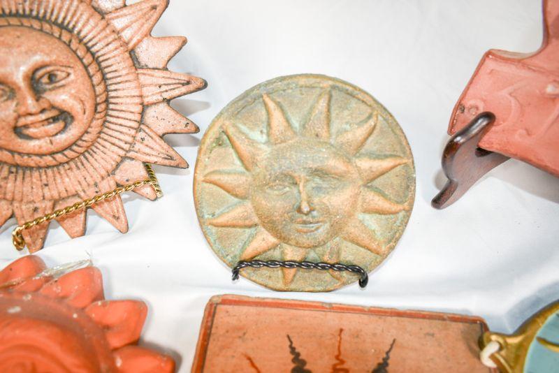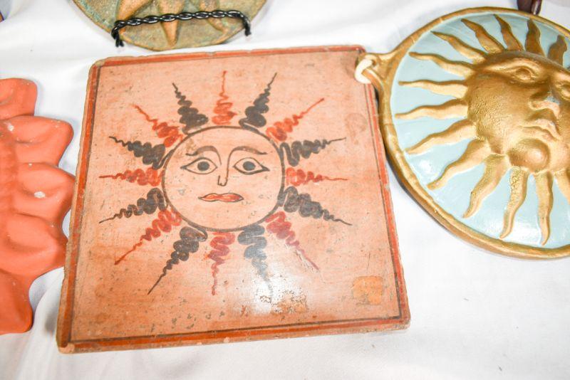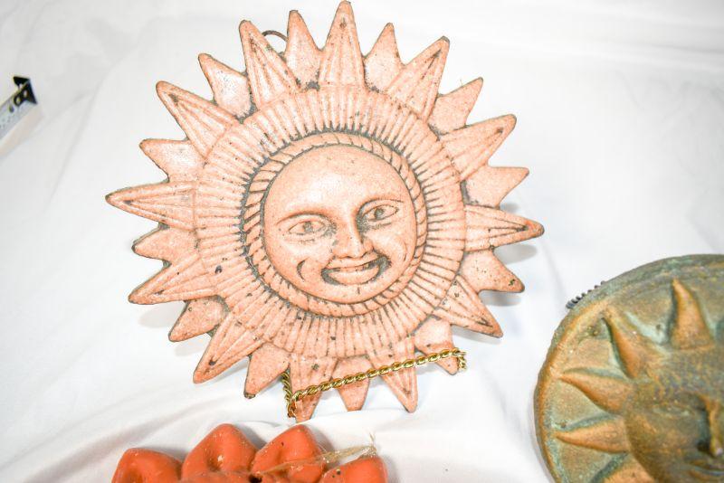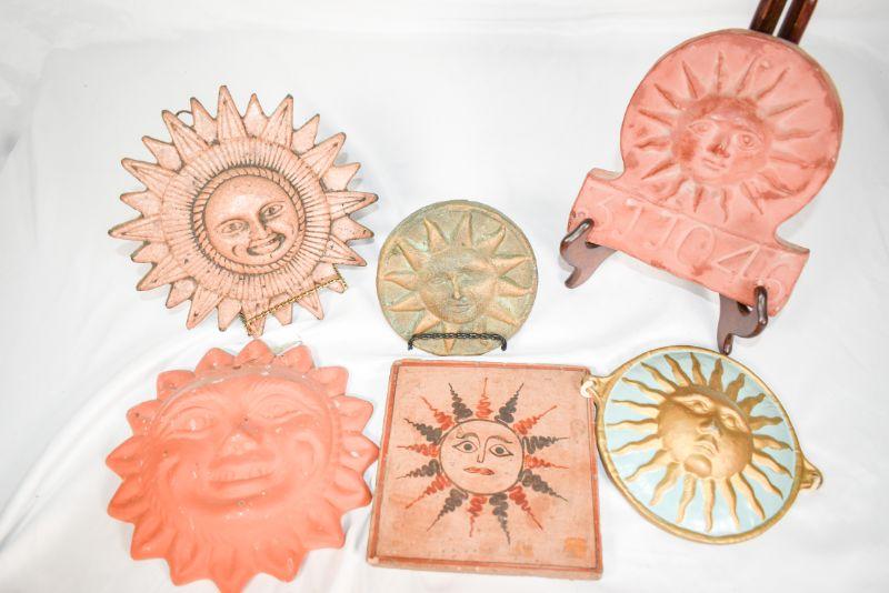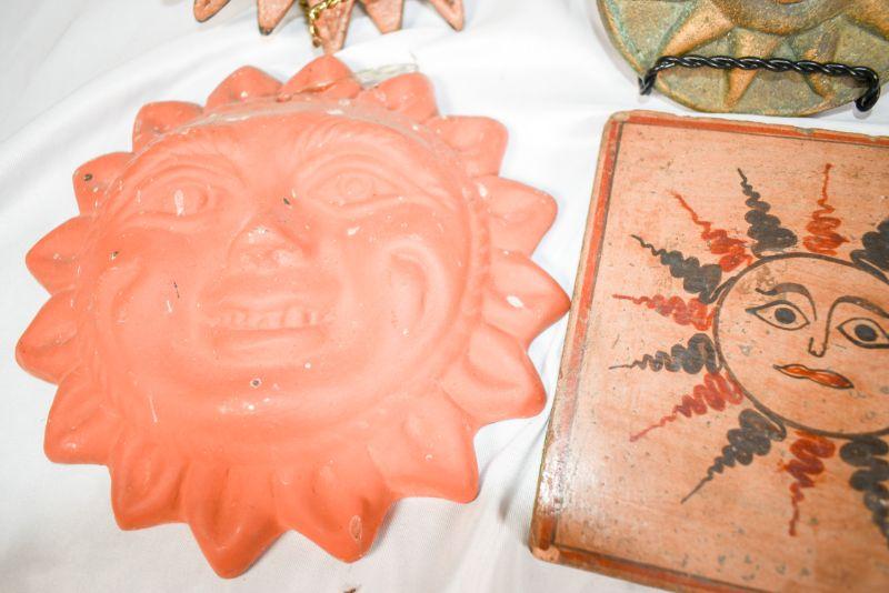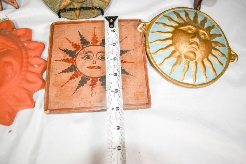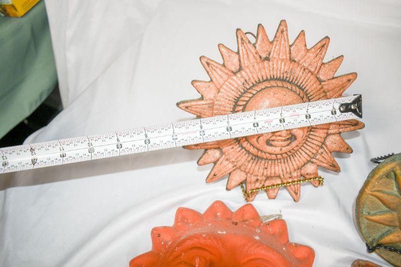 6 decorativesuns. Mostly shades of red. Plaster, clay, and metal.**Please read Terms and Conditions before placing a bid. Pick up is Sunday, December 22 from 11am to 3pm or Monday, December 23 from 4pm-7pm in Mantua, NJ. All sales are final. All sales are as is, where is. Please review all photos. Props are not included. Measurements are approximate.