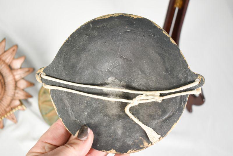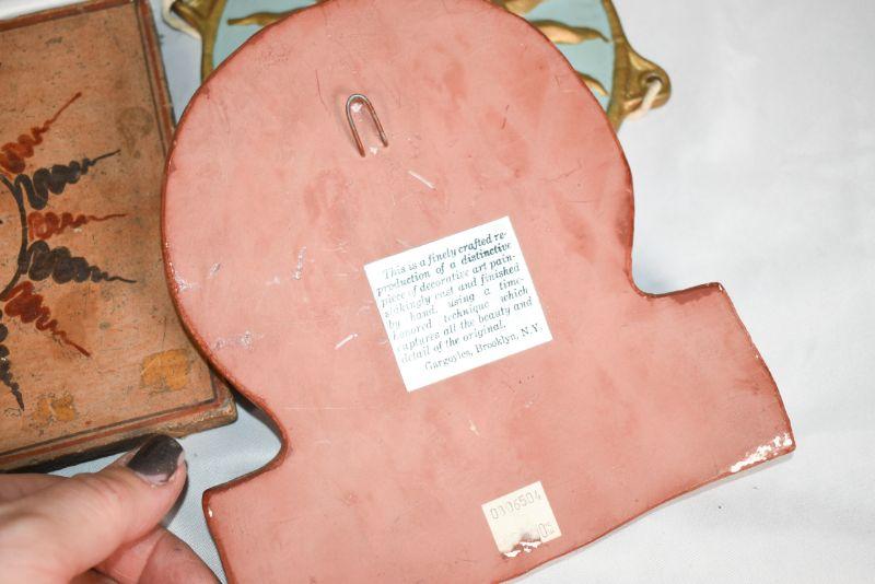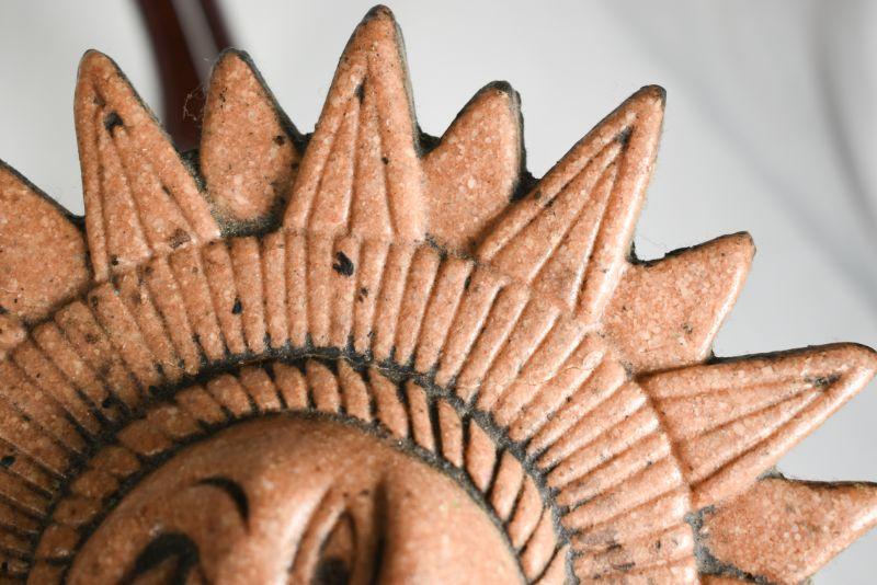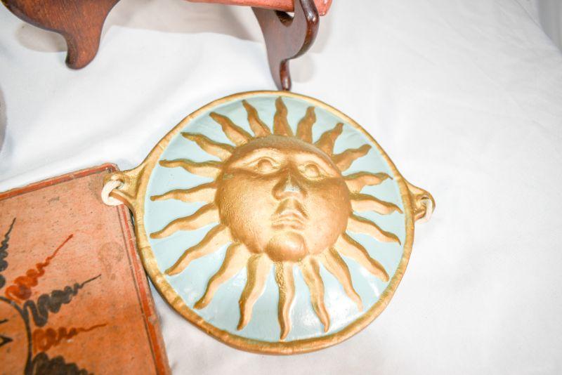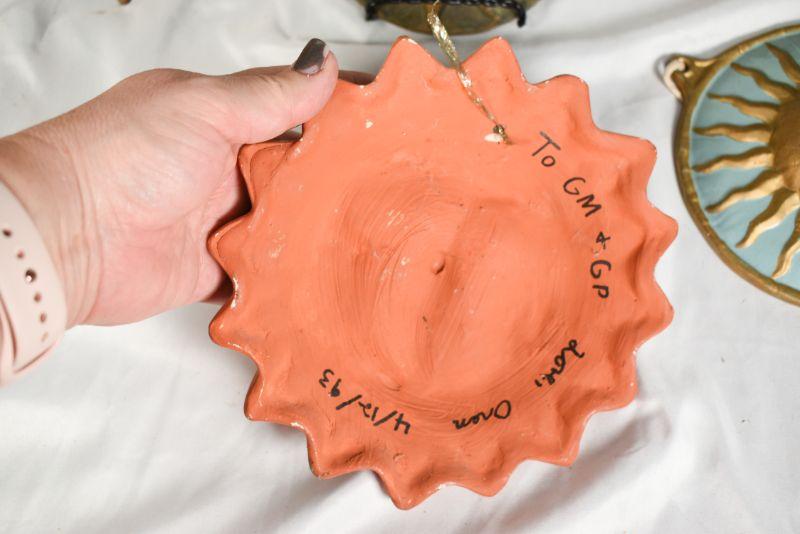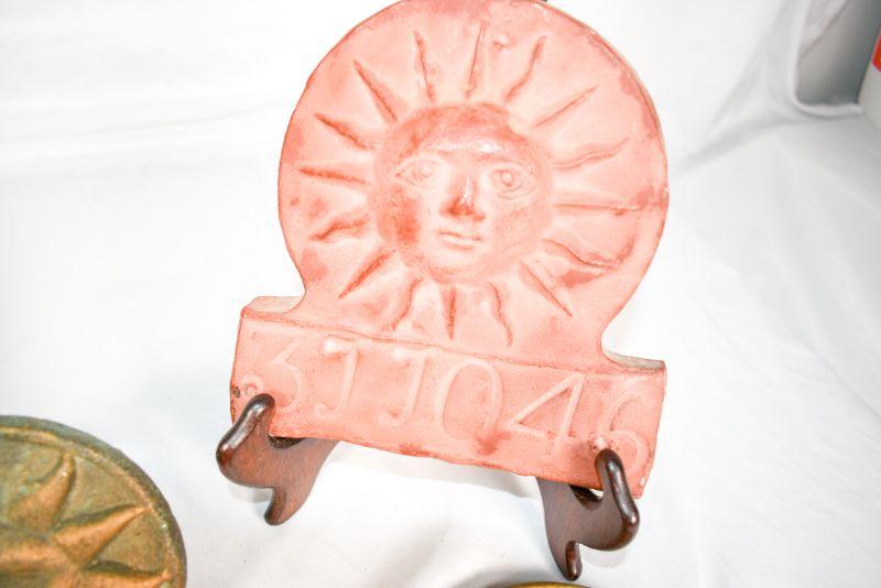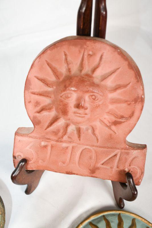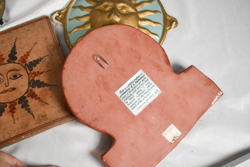 6 decorativesuns. Mostly shades of red. Plaster, clay, and metal.**Please read Terms and Conditions before placing a bid. Pick up is Sunday, December 22 from 11am to 3pm or Monday, December 23 from 4pm-7pm in Mantua, NJ. All sales are final. All sales are as is, where is. Please review all photos. Props are not included. Measurements are approximate.