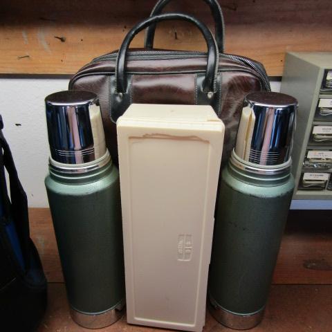 THERMOS BRAND CARRY BAG WITH PLASTIC STORAGE CONTAINER AND 2 THERMOSES