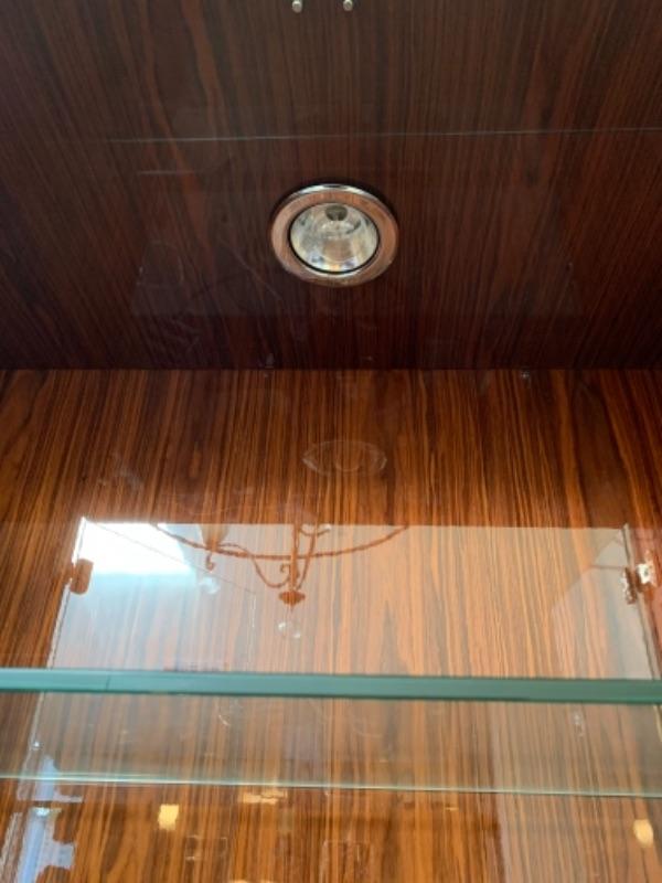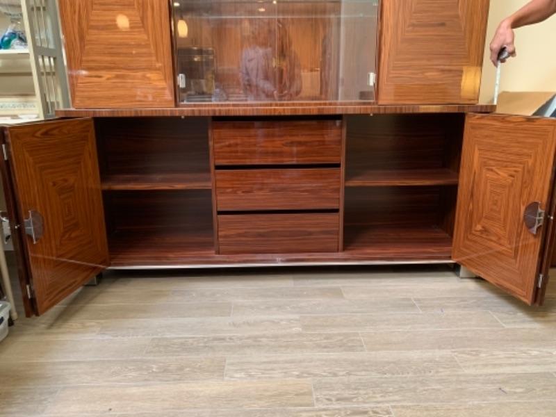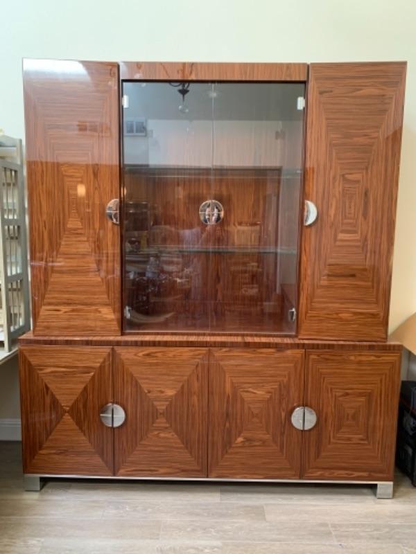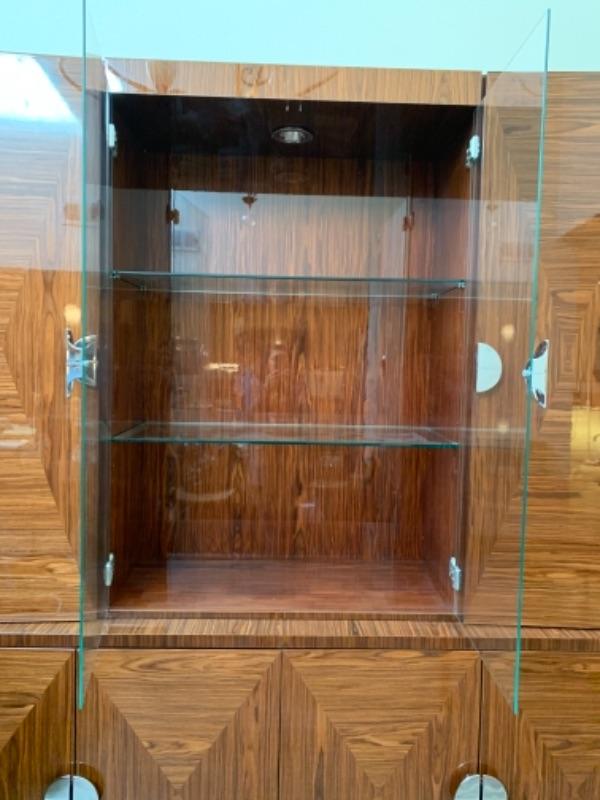 Lot 49. Amazing Giorgio Collection lighted breakfront, whisky colored with geometric design, glass doors and chrome fixtures.  Total measurements“”76” wide, 20” deep, 85” high--$4900