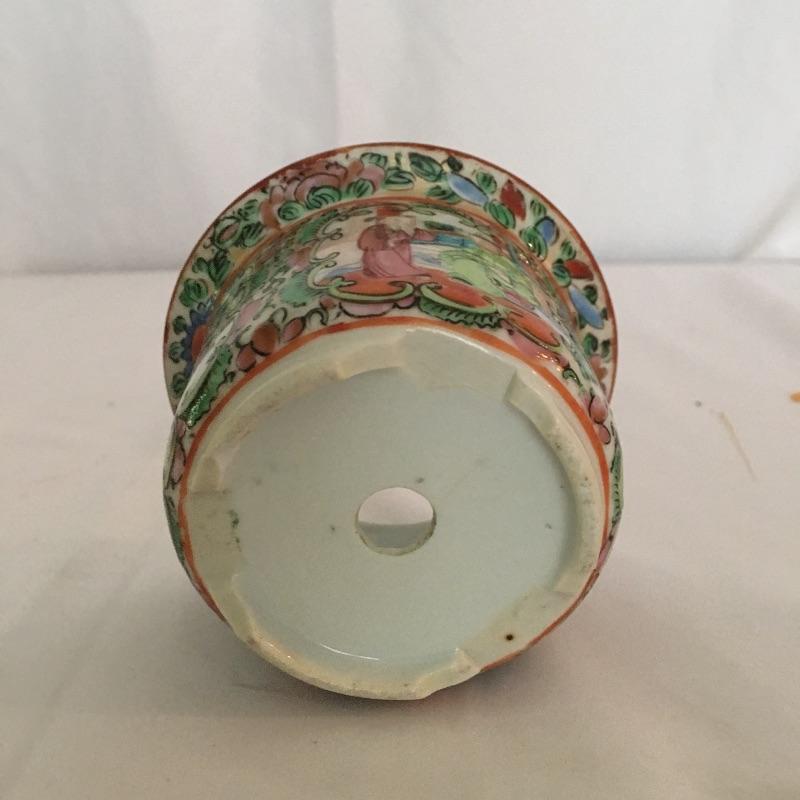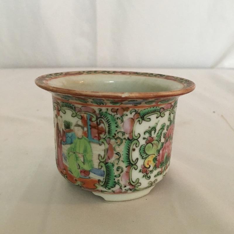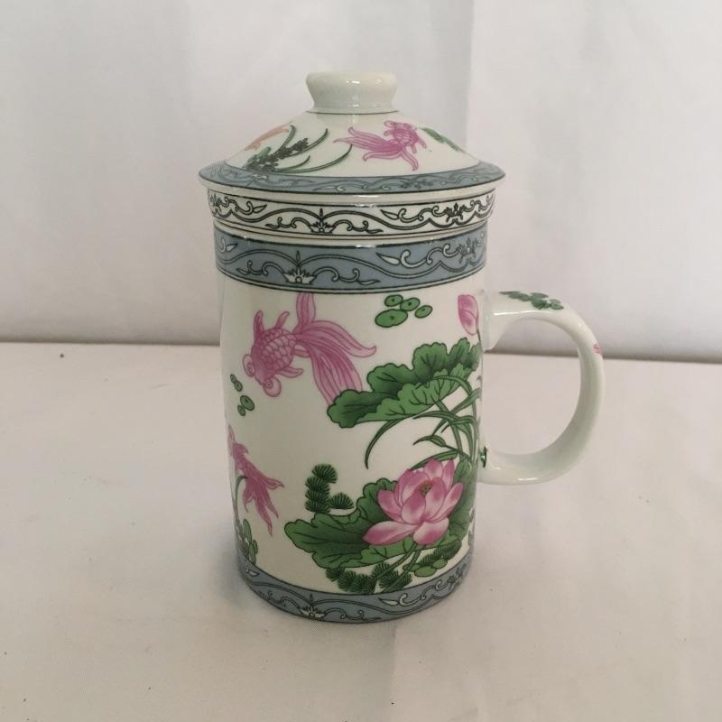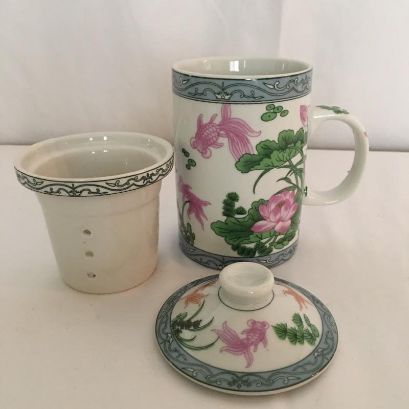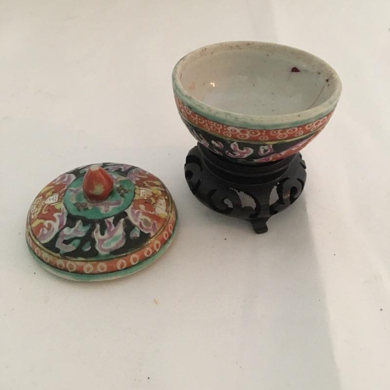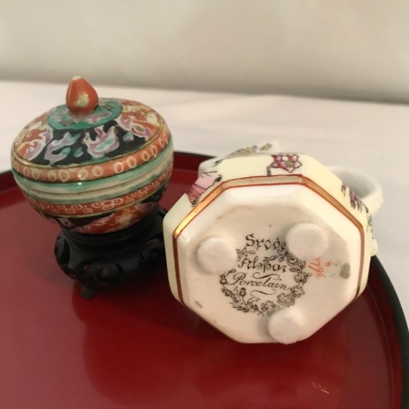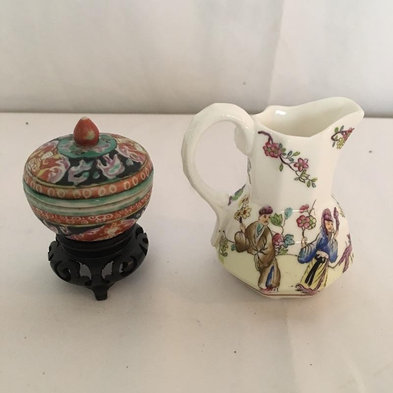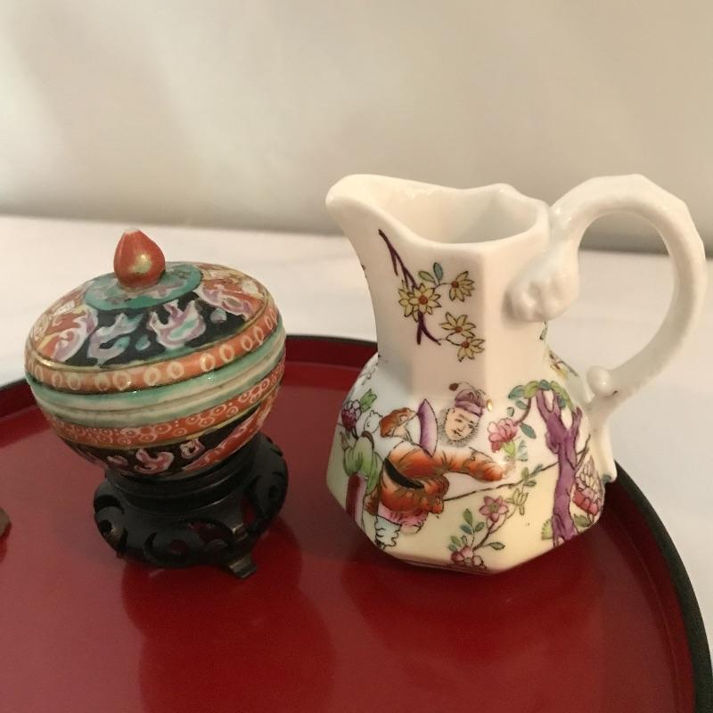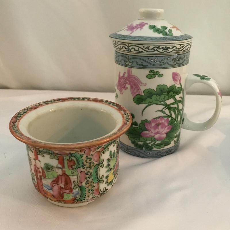 Asian collectibles including Tea cup with strainer and lid, mini pitcher pot plant and bowl with small figure.