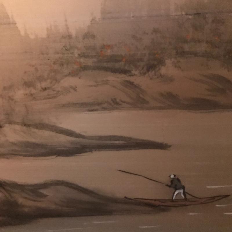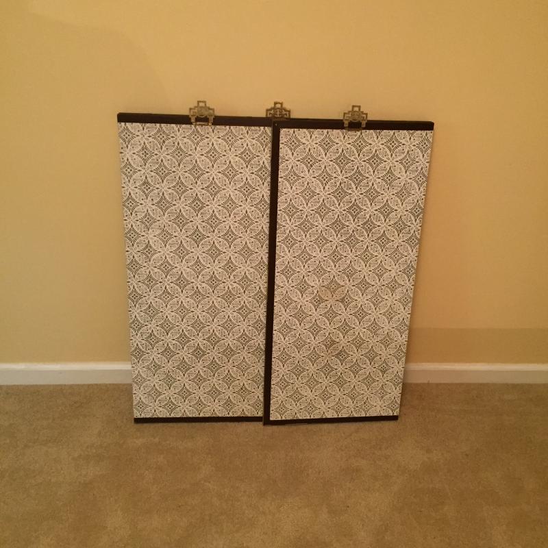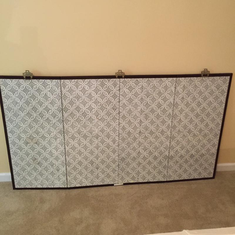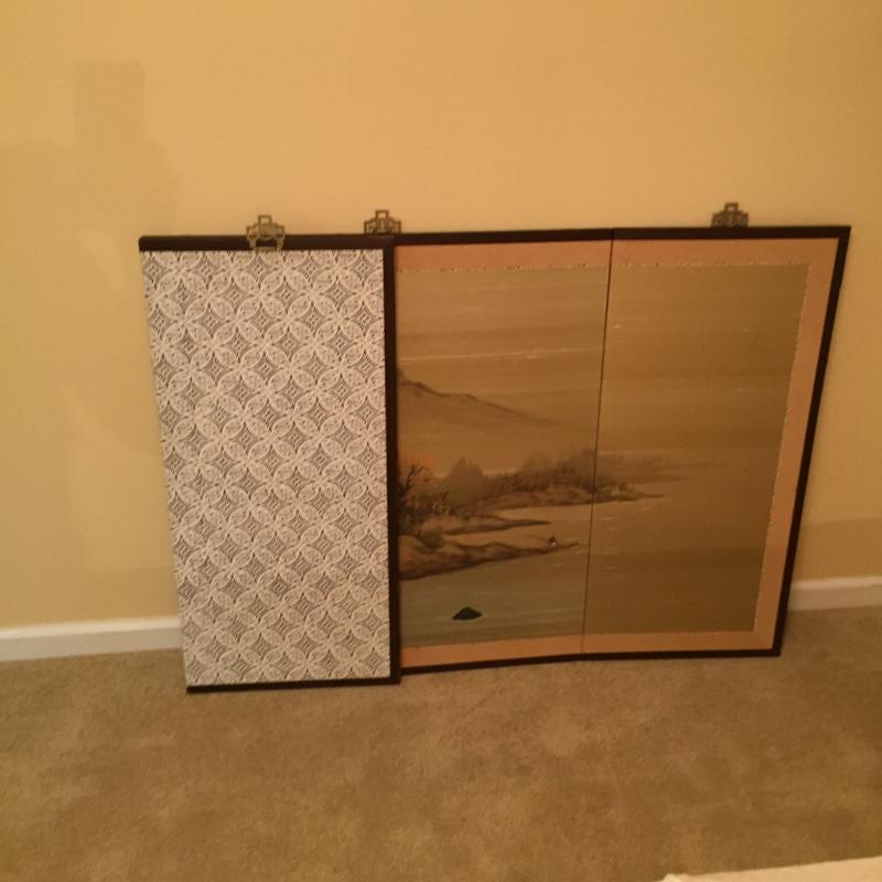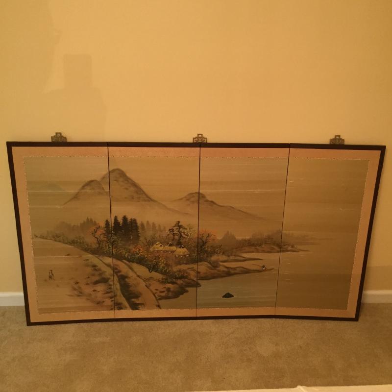 Silk Folding Screen for Wall or table top. Gorgeous painted mountain and ocean scene on gold fabric. Back has patterned fabric. Has nice brass hanging hardware. Looks to be in good condition. Measures 66”x36” . Local Pickup Only