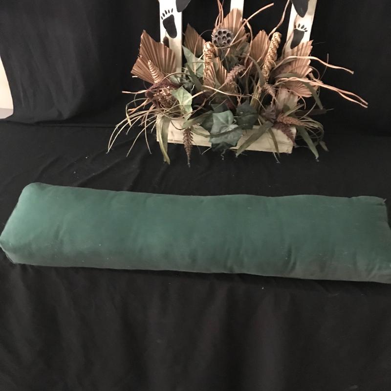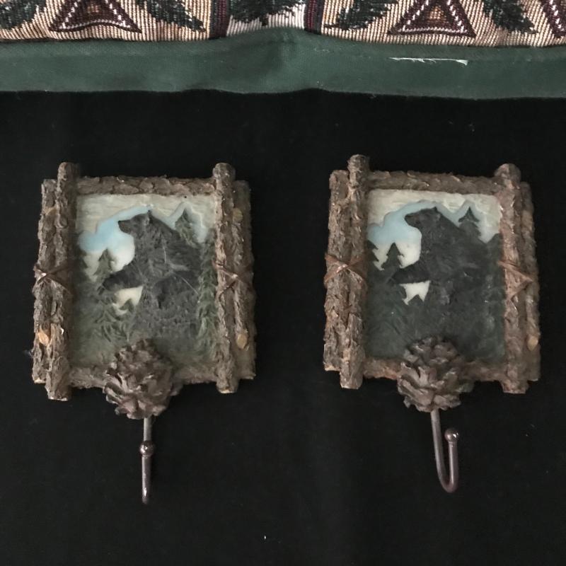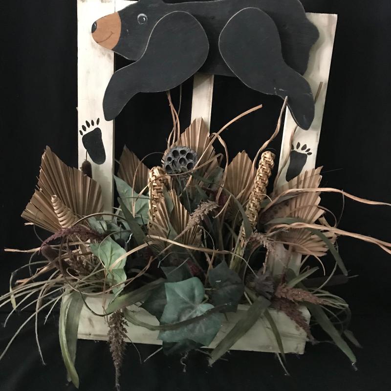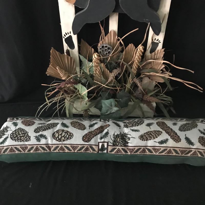 Cute window box with bear, made from wood and dried and fake floral arrangement. Piece measures 18” x 10” x 25”. Round pillow with pine cone design is 34” long with two bear hooks. Lot is available for local pick up in Maggie Valley, NC only.