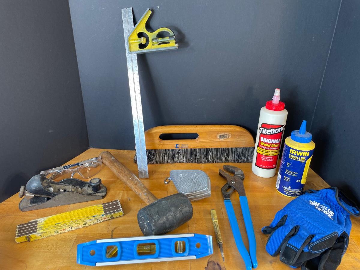 Planer, safety goggles, level, gloves, mallet, carpenter's square, pliers, slump line, natural hair brush and wood glue