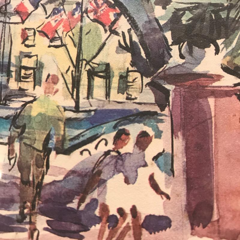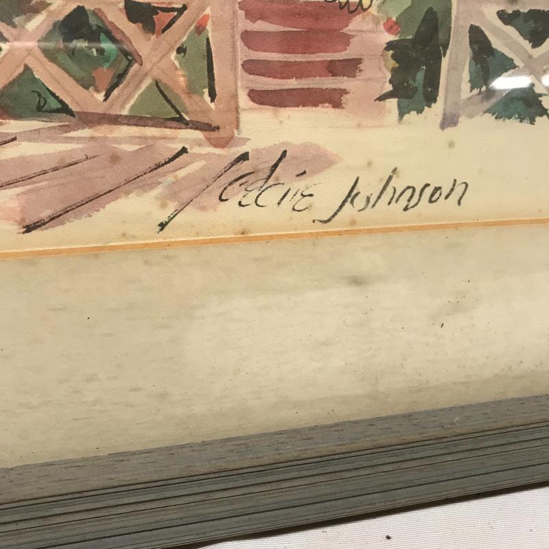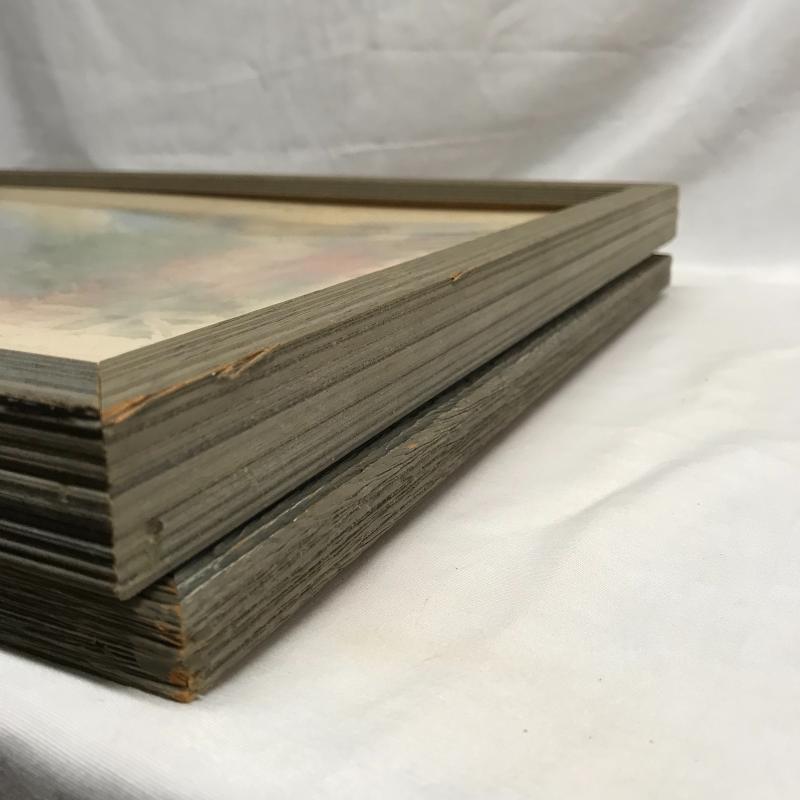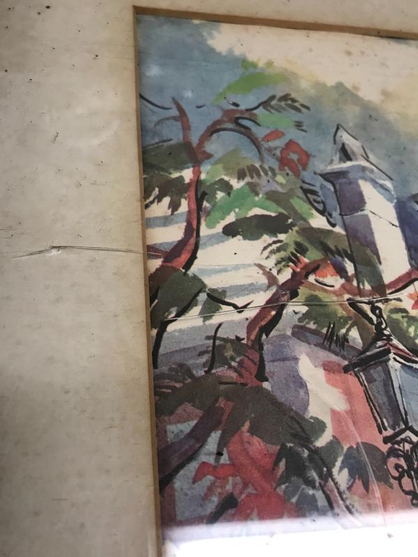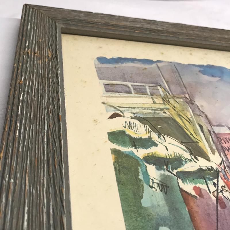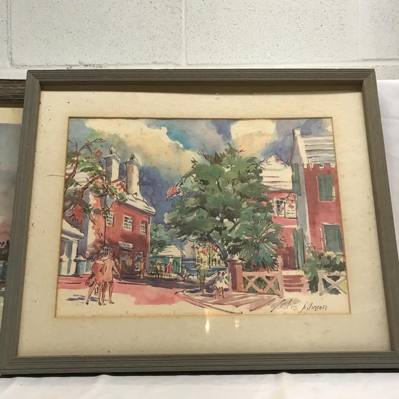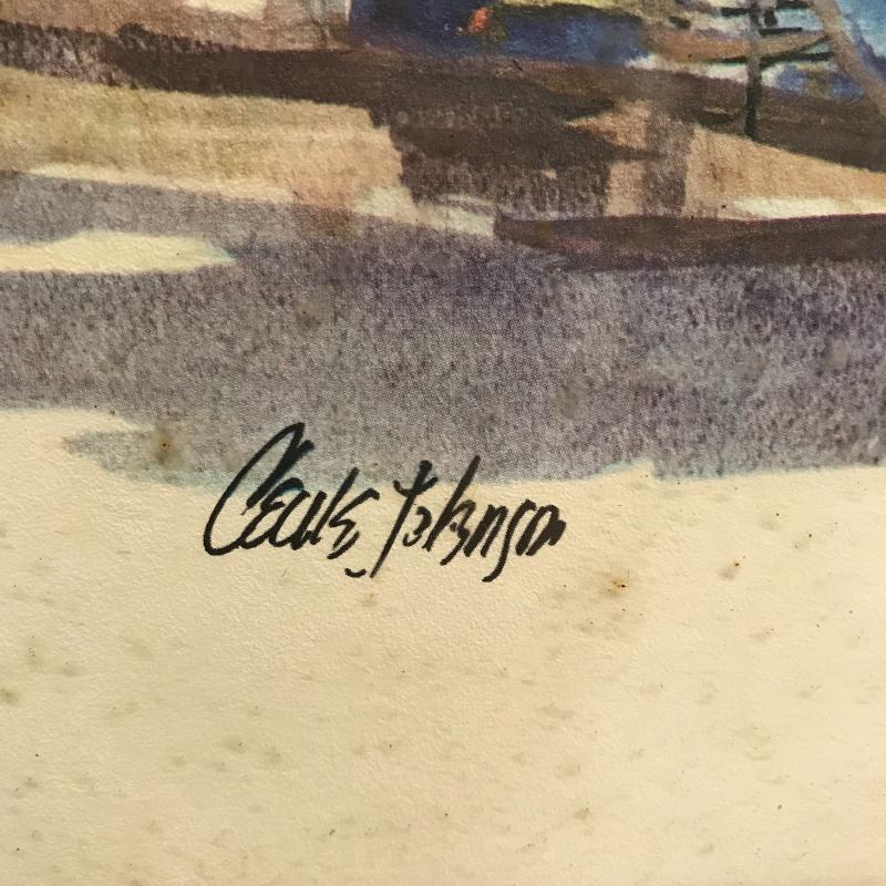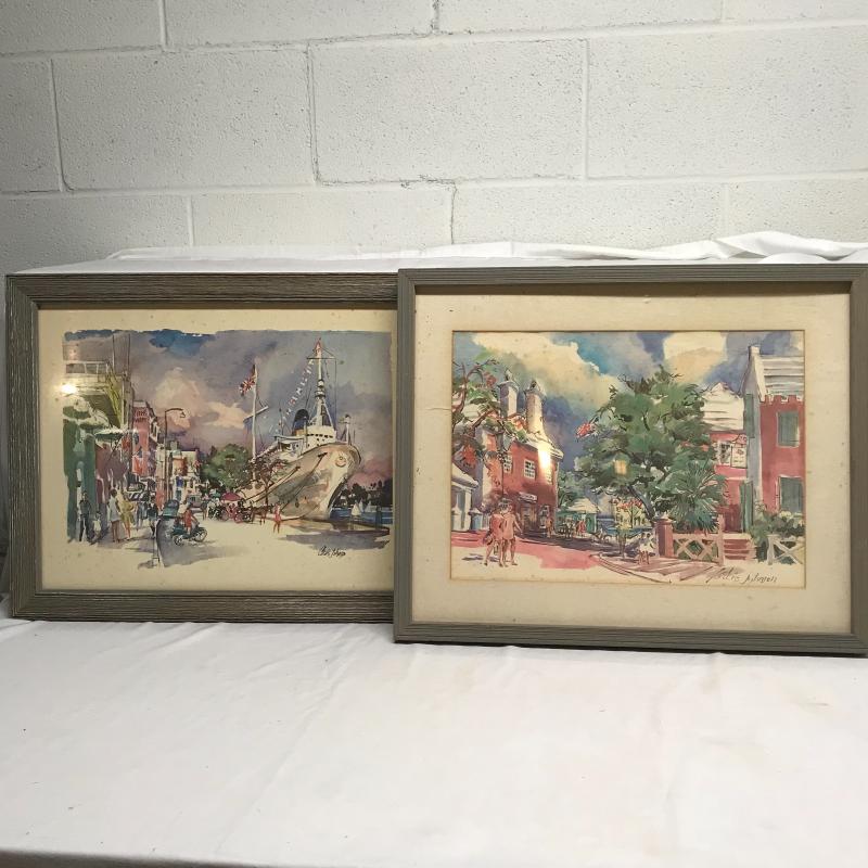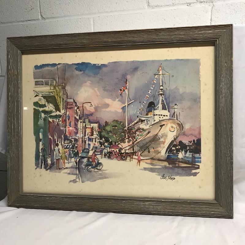 Two Cecile Johnson bustling city scenes in complementary wood frames. The first piece with the large tree has a plastic panel that needs to be replaced. The second scene with the ship as a prominent feature has a glass panel. Both need a little cleaning to be pristine. Shipping available, please call UPS for a quote prior to bidding.