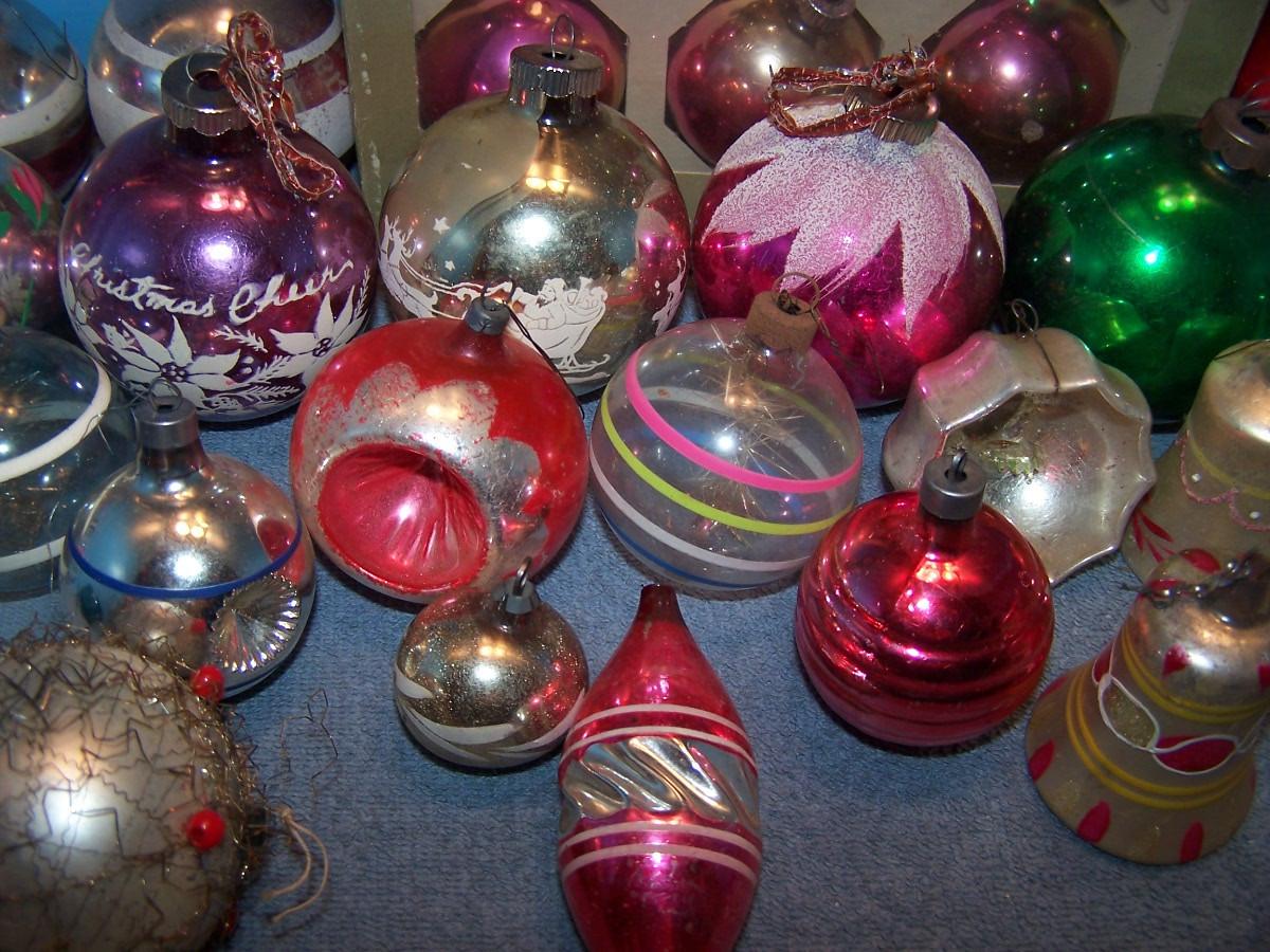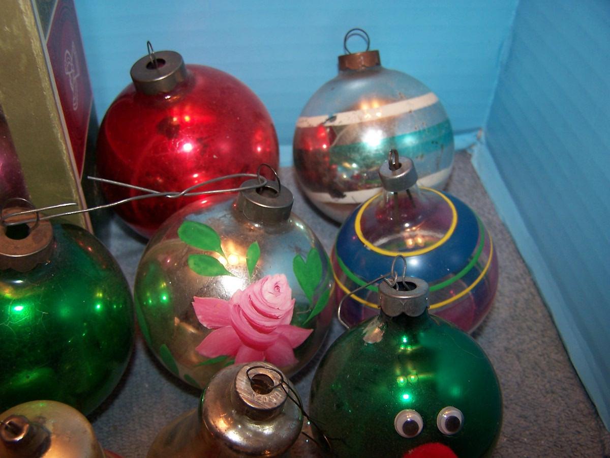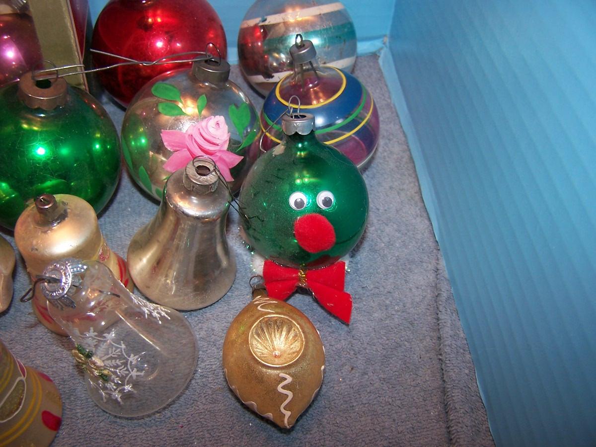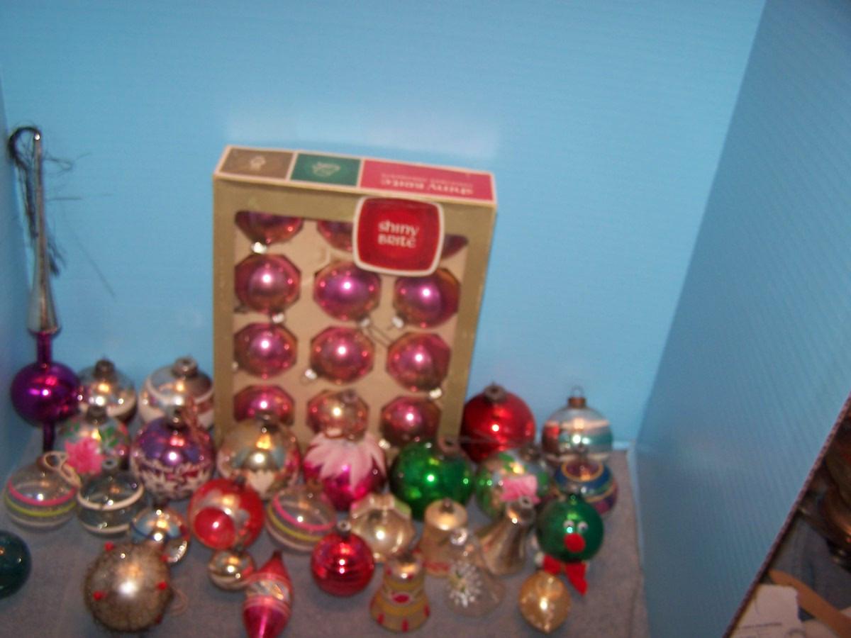 WONDERFUL ARRAY OF VINTAGE CHRISTMAS DECORATIONS... THE BOX OF ORNAMENTS IS DATED 1965... THERE IS SOME FADE....