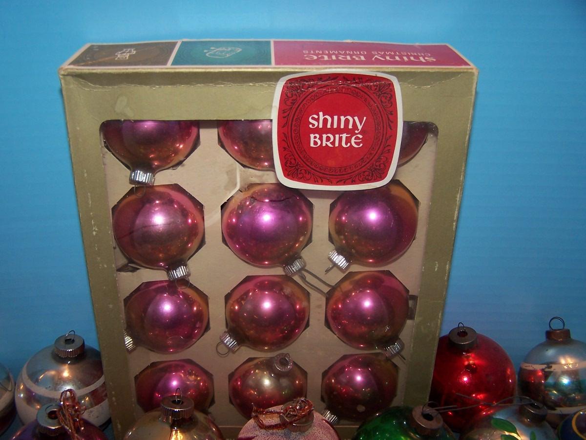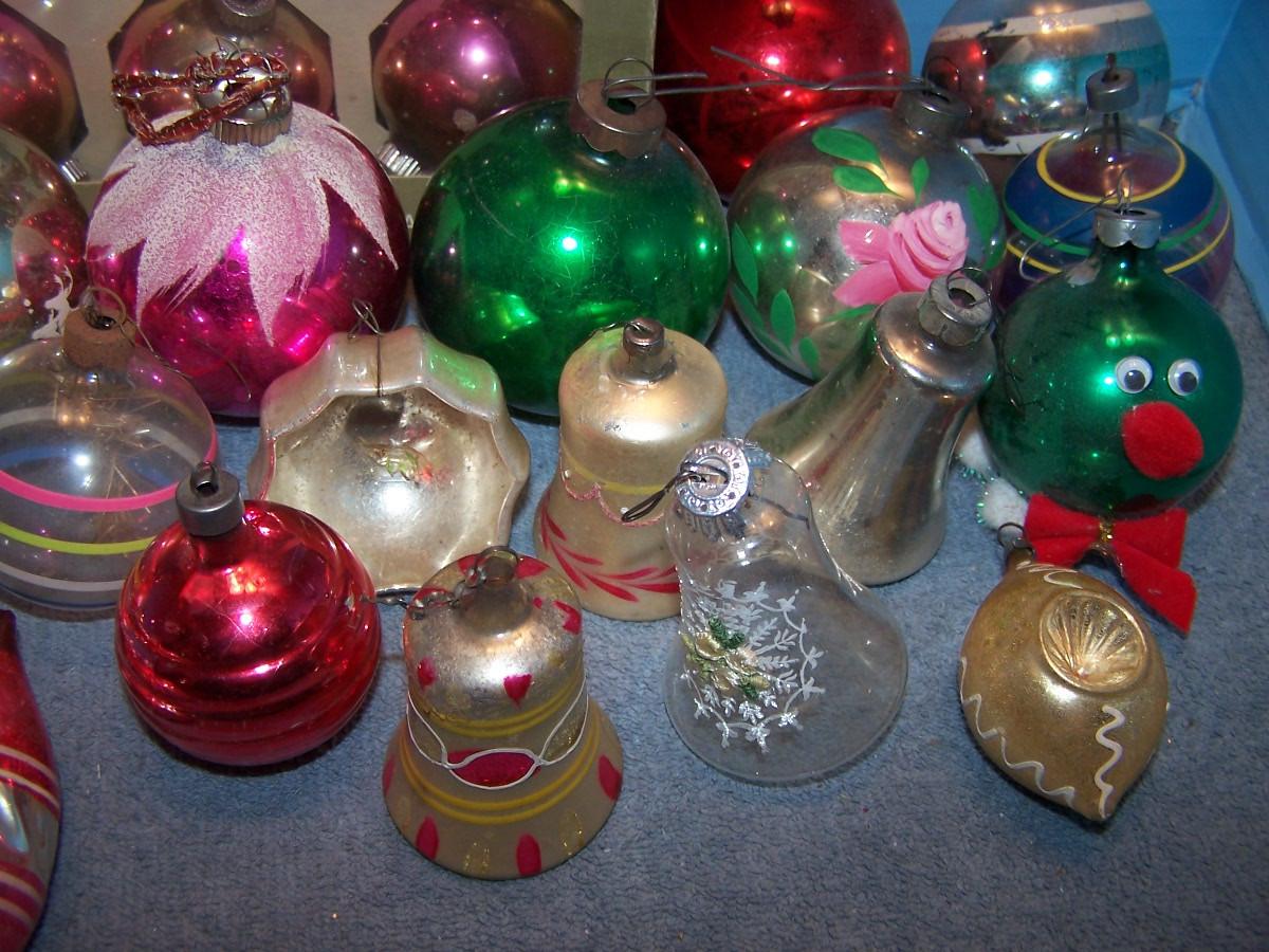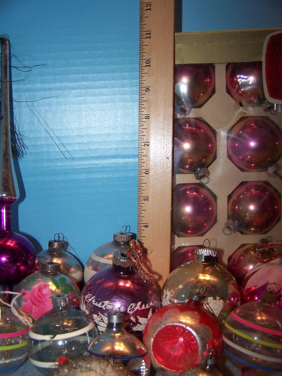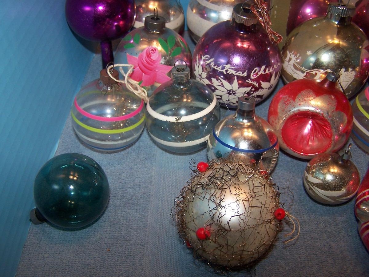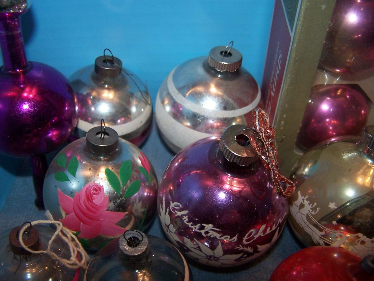 WONDERFUL ARRAY OF VINTAGE CHRISTMAS DECORATIONS... THE BOX OF ORNAMENTS IS DATED 1965... THERE IS SOME FADE....