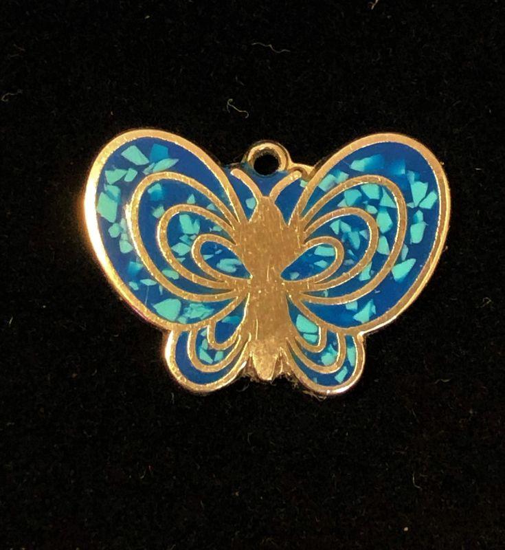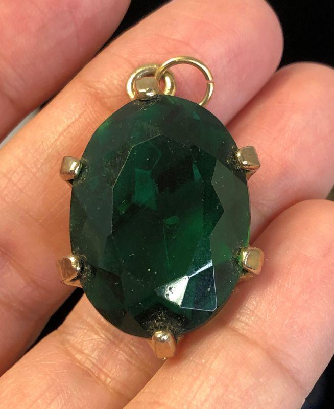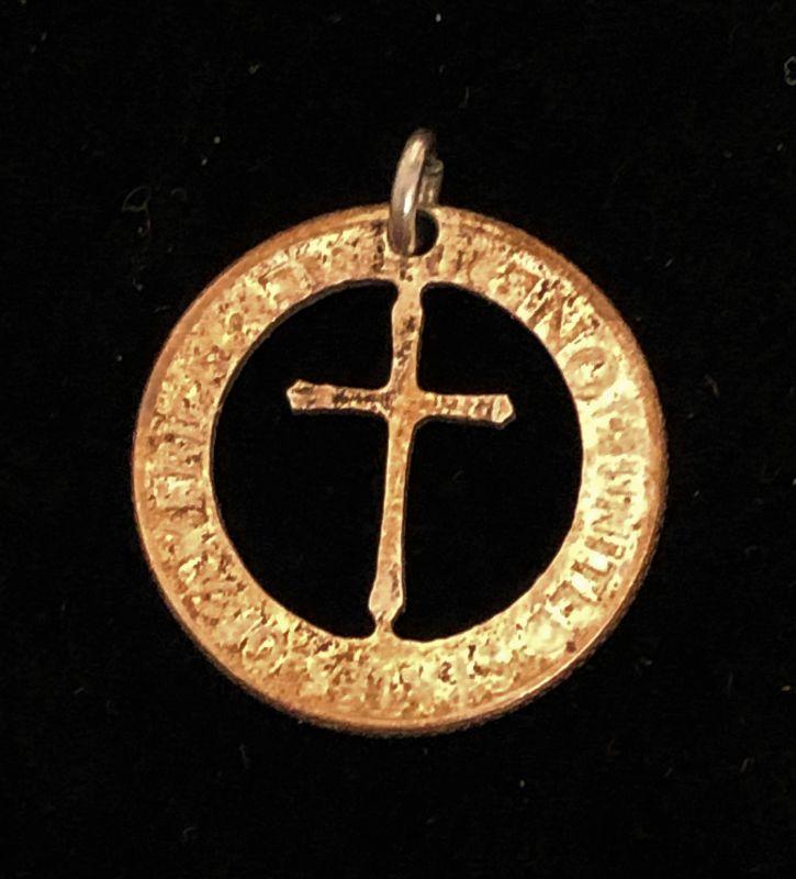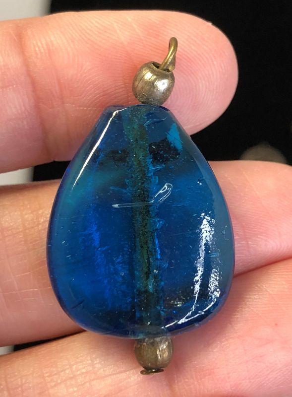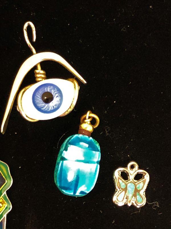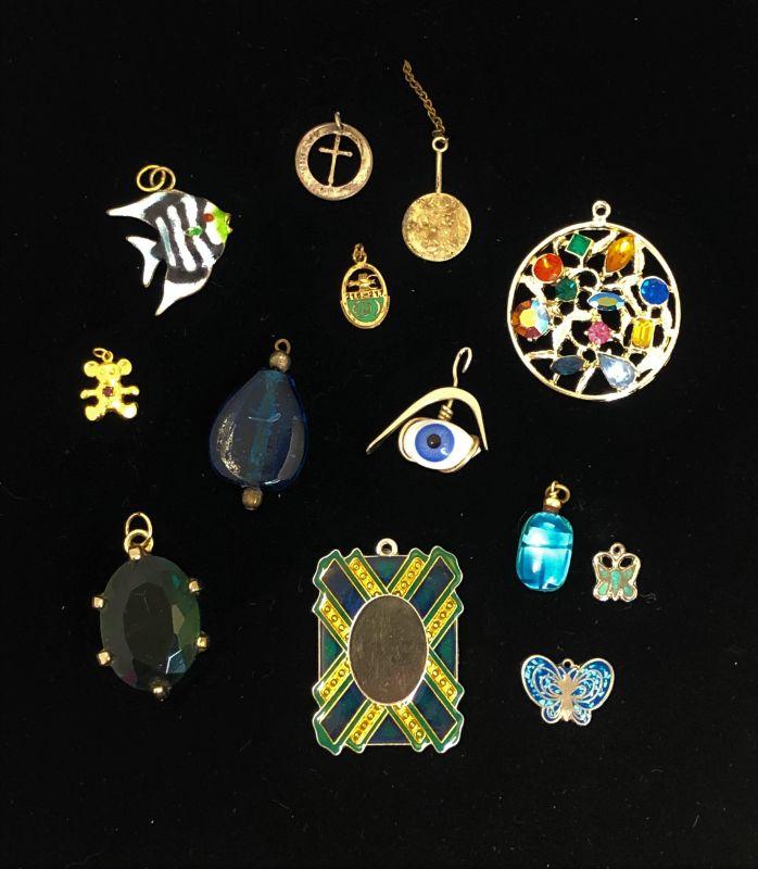 The large green pendant is a glass bead. The blue pendant is also glass, but more like blown glass onto what looks like silver. One of the pendants is a dime that was cut out to have a cross.