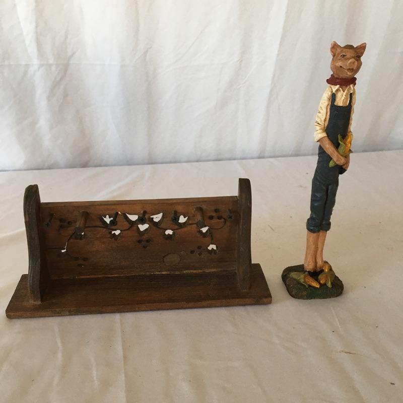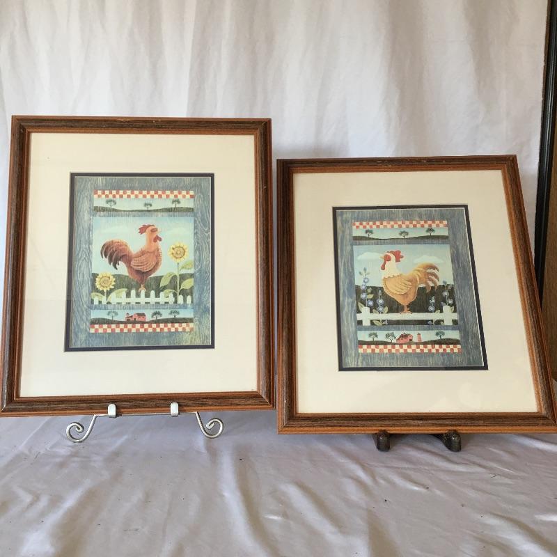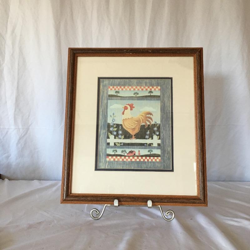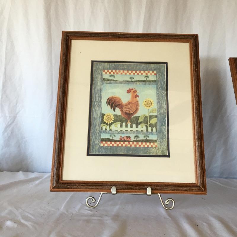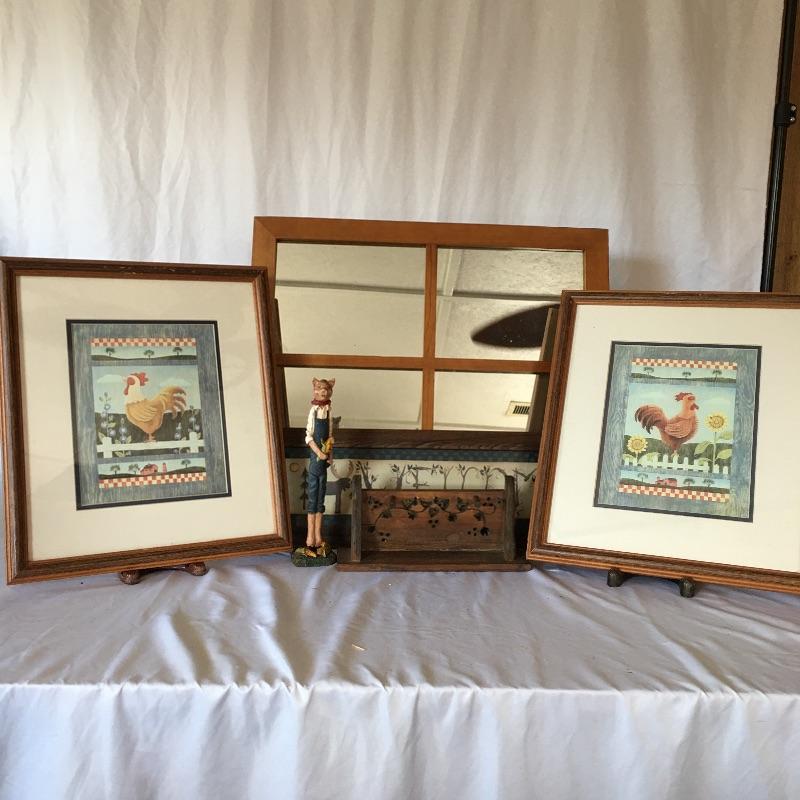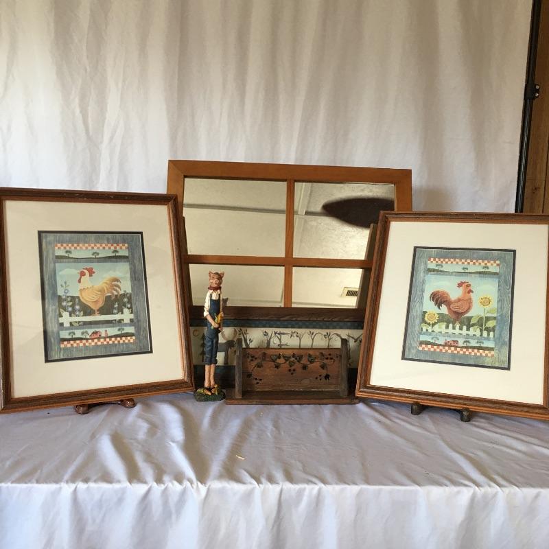 This country style lot includes two framed and matted rooster prints, mini wooden shelf, pig figurine in resin, framed welcome sign and a wood framed mirror made to look like a window that measures 18.5” x 22.5”.