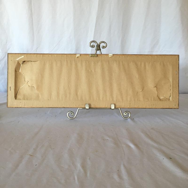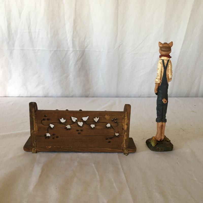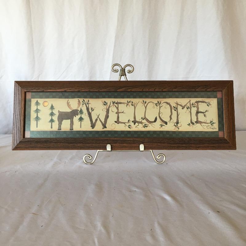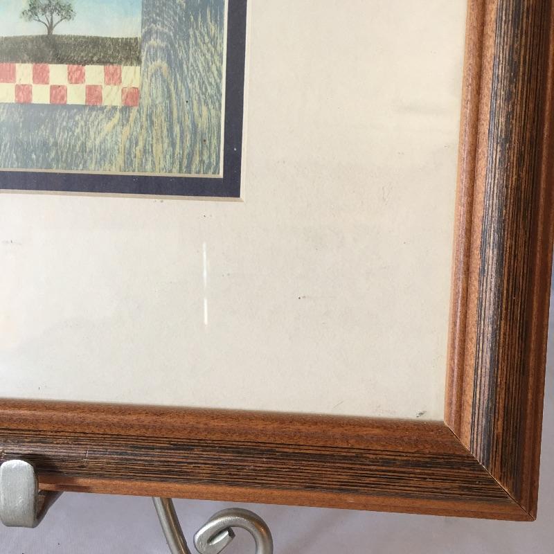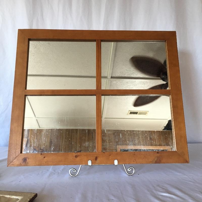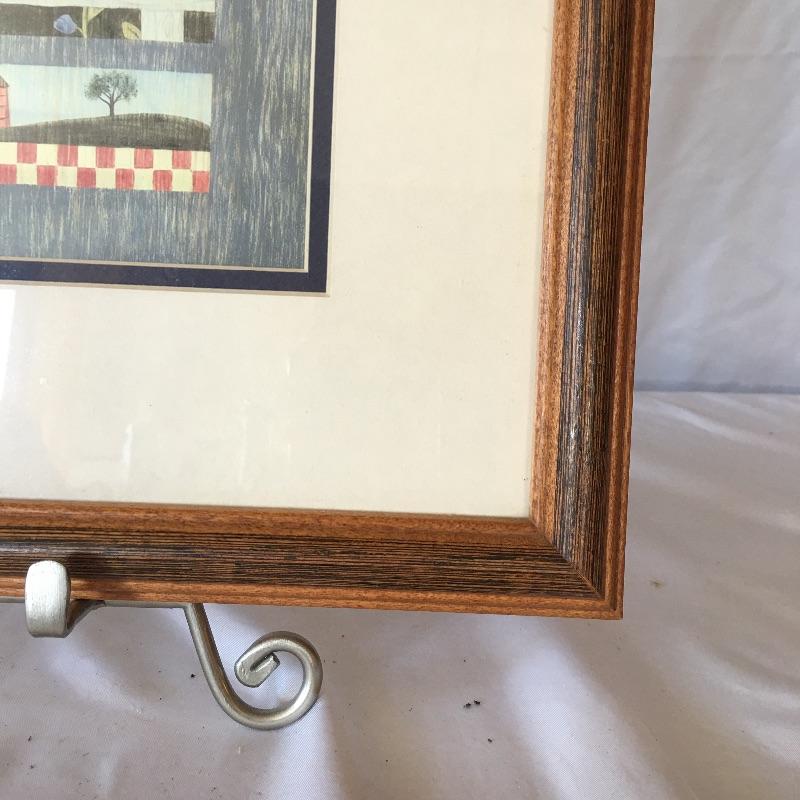 This country style lot includes two framed and matted rooster prints, mini wooden shelf, pig figurine in resin, framed welcome sign and a wood framed mirror made to look like a window that measures 18.5” x 22.5”.