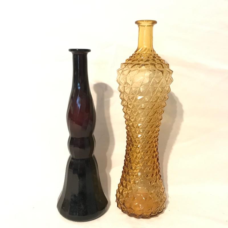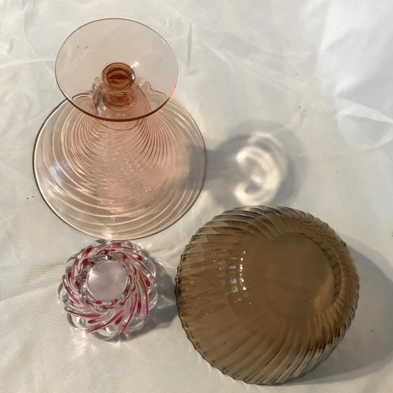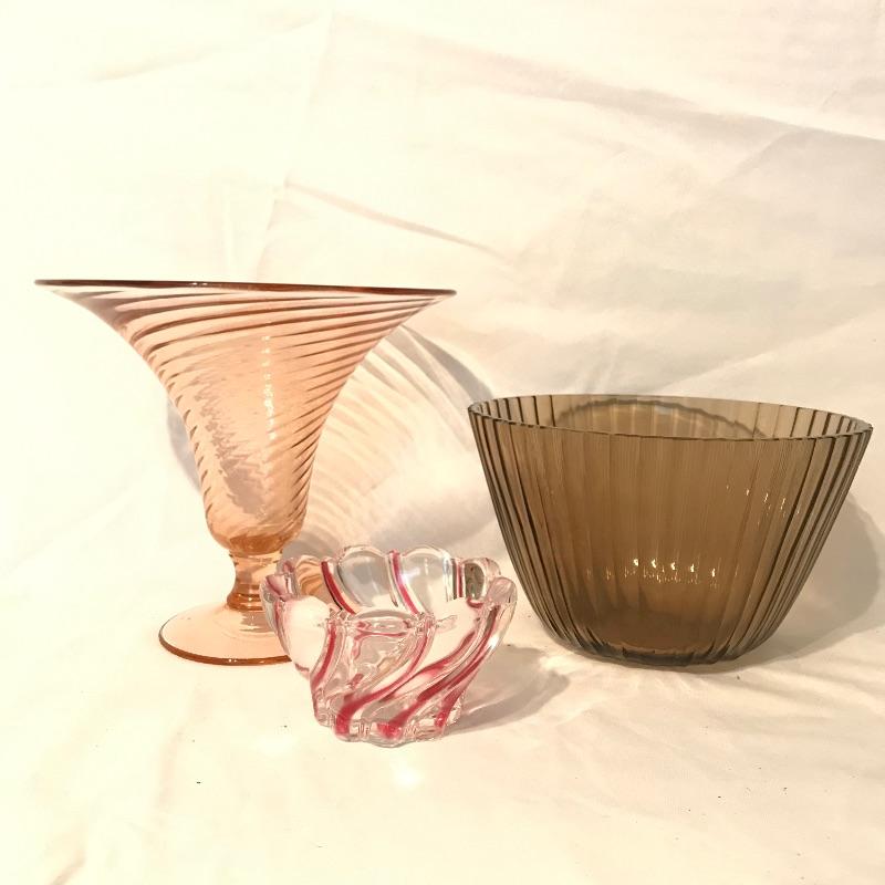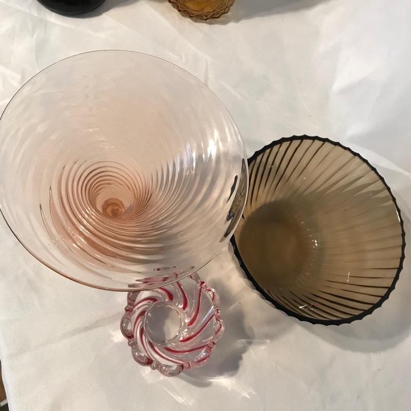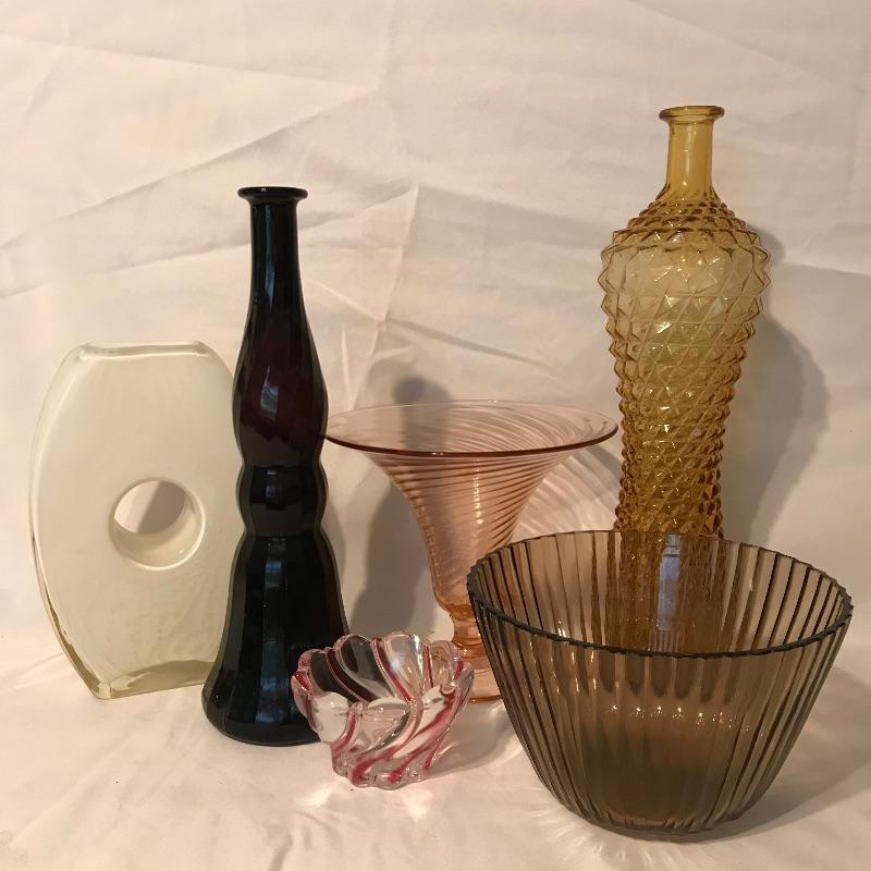 This is a great and colorful eclectic glass collection. Lot includes three vases. The white vase appears hand blown and the purple and amber colored vases seem to be formed glass. Lot also features a swirled footed tulip bowl with large and small bowls. The amber colored vase is the largest at about 16” tall. Local pick up only.