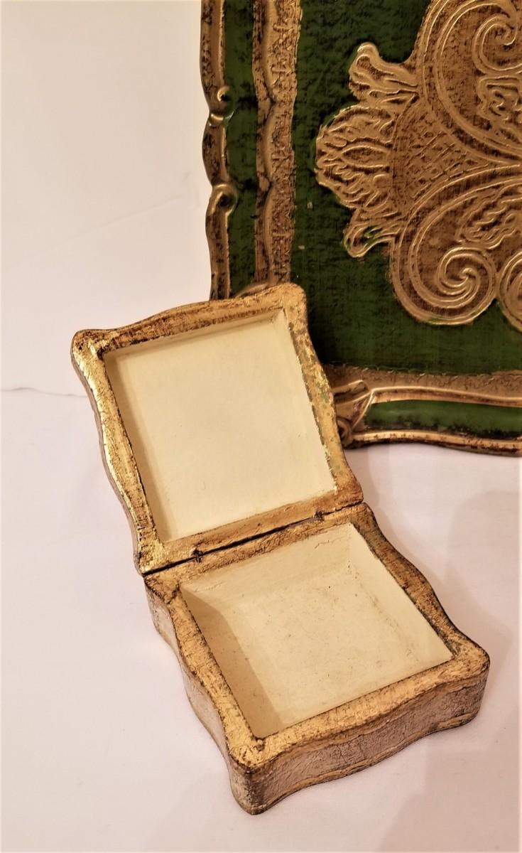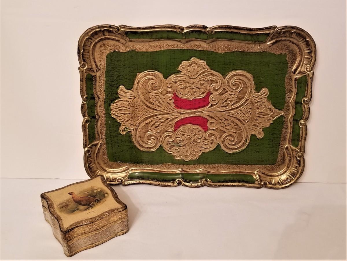 Nice Florentine box and tray - tray measures 10" x 14", trinket box is 3.5" across. Both in good condition.