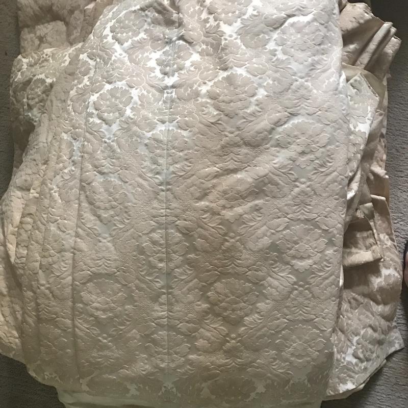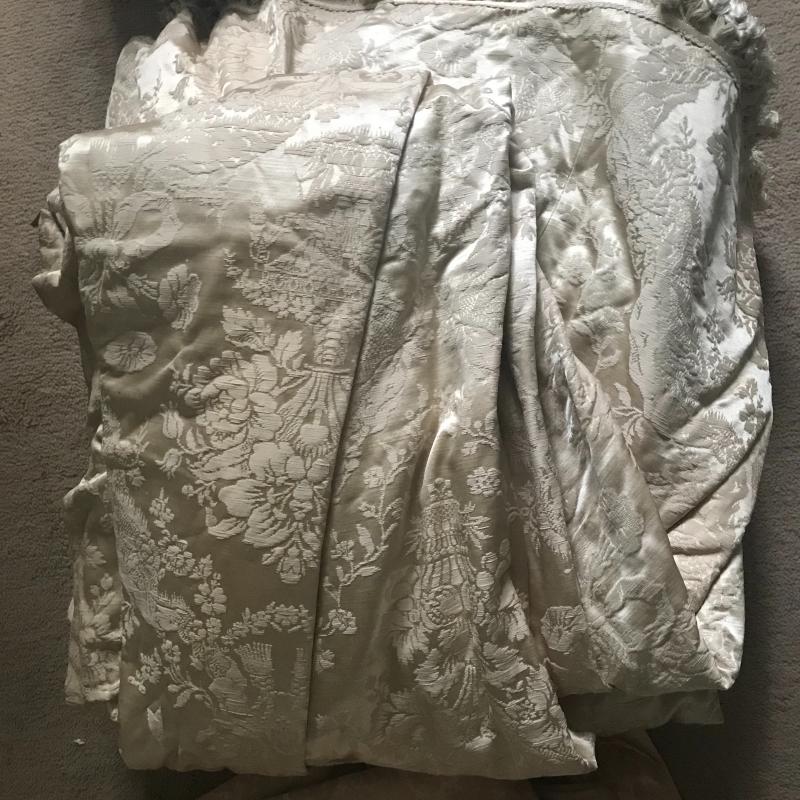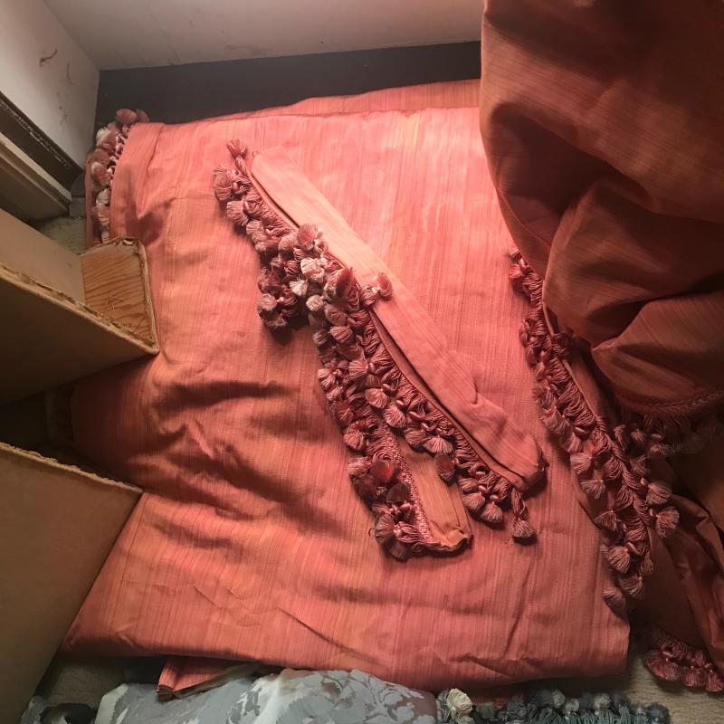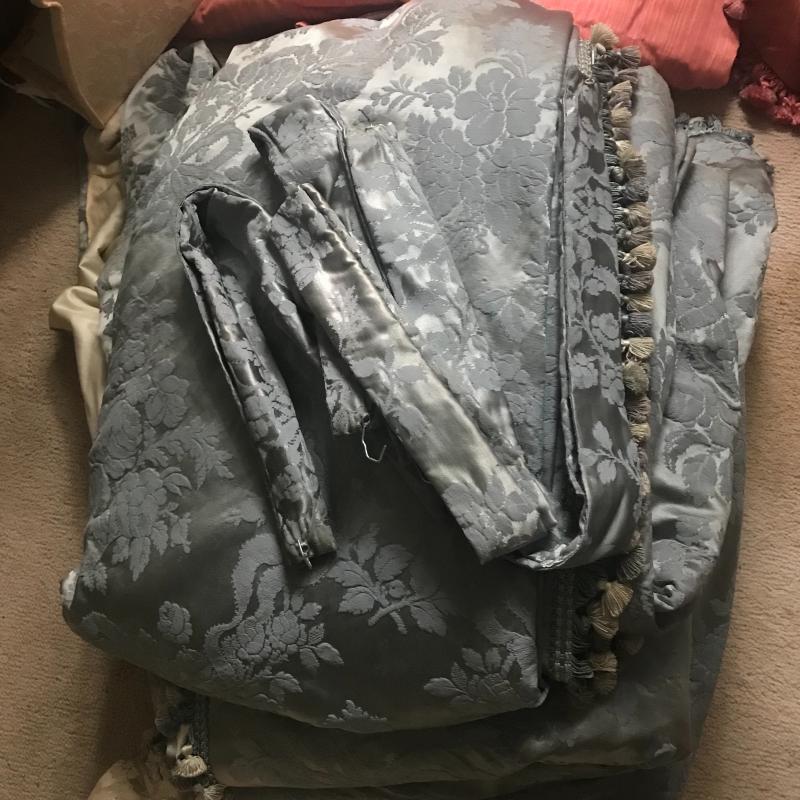 4 sets of custom-made drapes. Panels measure approx. 37” x 87”. Two panels in a salmon color with tassels and cornis board, 4 regal blue panels with tassels, 4 cream silk panels with tassels, 4 cream with a pink tint and two cornis boards to match. These drapes are heavy and in good condition. Linings are thinning from sun damage and all need cleaning. Great for repurposed project or can still be used as curtains. Lot available for local pick up only.